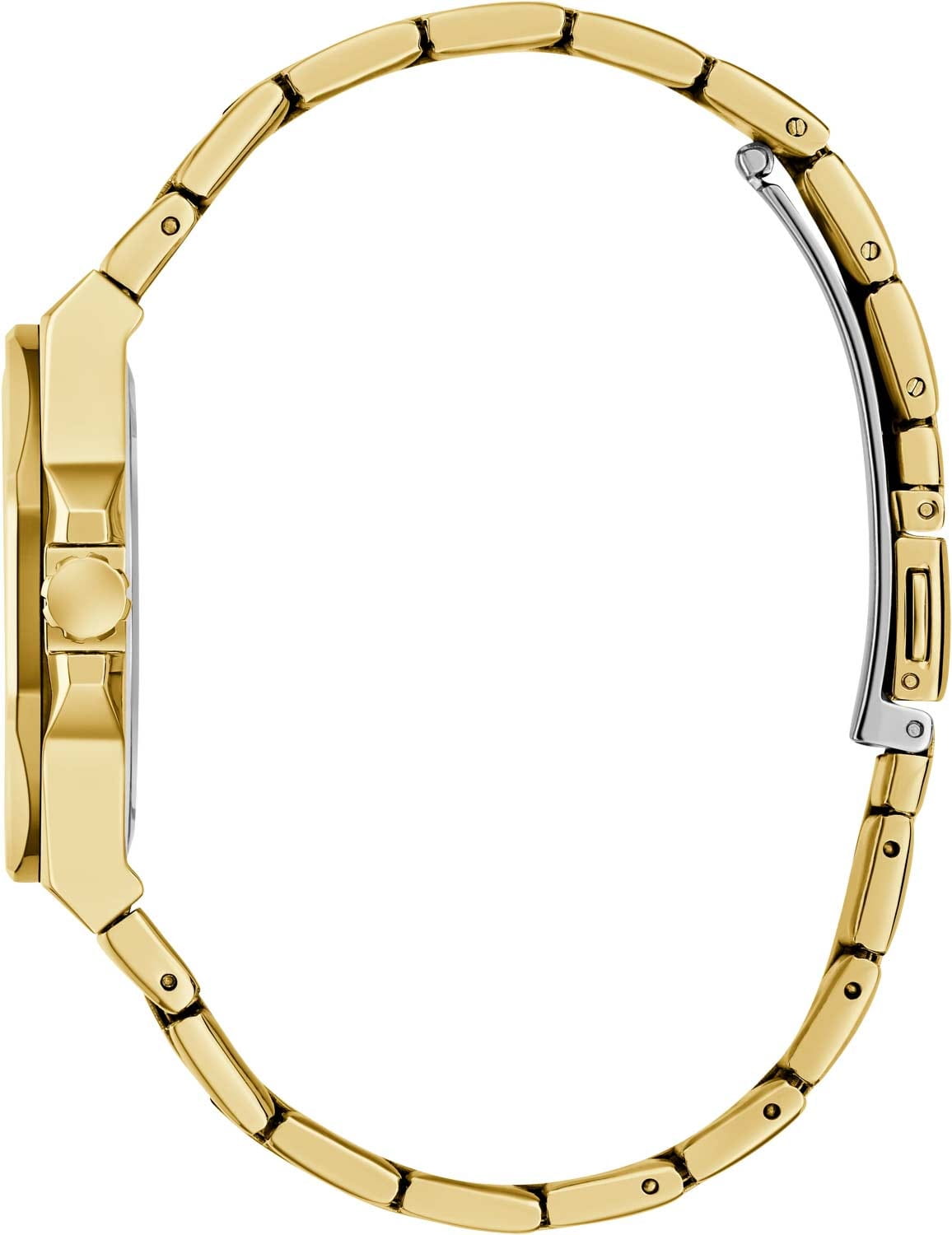 Часы Guess GW0873L2 — это изысканный аксессуар, который станет отличным дополнением к образу современной женщины. Эти наручные оснащены надежным кварцевым механизмом. Стальной корпус с золотистым IP-покрытиемIP-покрытиеМетод ионного напыления. Демонстрирует повышенную устойчивость к истиранию, окислению и химическим веществам. Под воздействием высокого давления и температуры около 1500°C молекулы металла надёжно соединяются с частицами корпуса часов. придаёт часам элегантный и стильный вид. Зеленый циферблат, выполненный по технологии Sunray, создает эффект солнечных лучей, добавляя глубину и выразительность дизайну. Метки в виде штрихов и римские цифры VI и XII обеспечивают удобное считывание времени и добавляют классический штрих. Люминесцентное покрытиеЛюминесцентное покрытиеПозволяет считывать показания времени в темноте. Производители наносят на стрелки, часовые индексы, безель или поверхность циферблата светонакопительный состав, дающий холодное свечение. на стрелках обеспечивает отличную видимость в темноте. Часы оснащены рифленой заводной головкой с защитой, что обеспечивает удобство и надежность в использовании. Стальной браслет с золотистым IP-покрытиемIP-покрытиеМетод ионного напыления. Демонстрирует повышенную устойчивость к истиранию, окислению и химическим веществам. Под воздействием высокого давления и температуры около 1500°C молекулы металла надёжно соединяются с частицами корпуса часов. и раскладной застежкойРаскладная застёжкаТакой тип застёжки используется только на браслетах из металла. Она никогда не раскрывается полностью, происходит разделение на 2 и более частей. Раскладывающая застёжка снизит вероятность потери часов к минимуму. гарантирует комфортное ношение и надежную фиксацию на запястье. Водозащита 50WR позволяет не беспокоиться о случайных брызгах и контакте с водой. Минеральное стеклоМинеральное стеклоМинеральное стекло представляет собой искусственно выращенный минерал кварца. Такое стекло отличается особой устойчивостью к повреждениям и царапинам. Уступает по некоторым качествам сапфировому стеклу. защищает циферблат от царапин и повреждений, обеспечивая долговечность и сохранность внешнего вида.