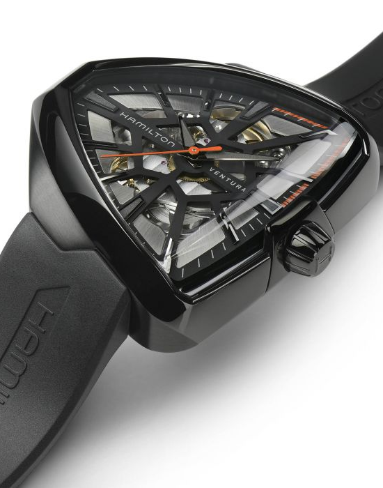 Мужские механические швейцарские часы из лимитированной серии в 999 экземпляров Hamilton Ventura Skeleton Auto H24595331, механический механизм (автоматический калибр) с высокой точностью. Сапфировое стекло устойчивое к появлению царапин, обладающее высокой прозрачностью. Класс водозащиты: 50 метров, позволит защитить корпус от случайных брызг или капель дождя. Корпус часов изготовлен из стали, черного цвета.
