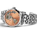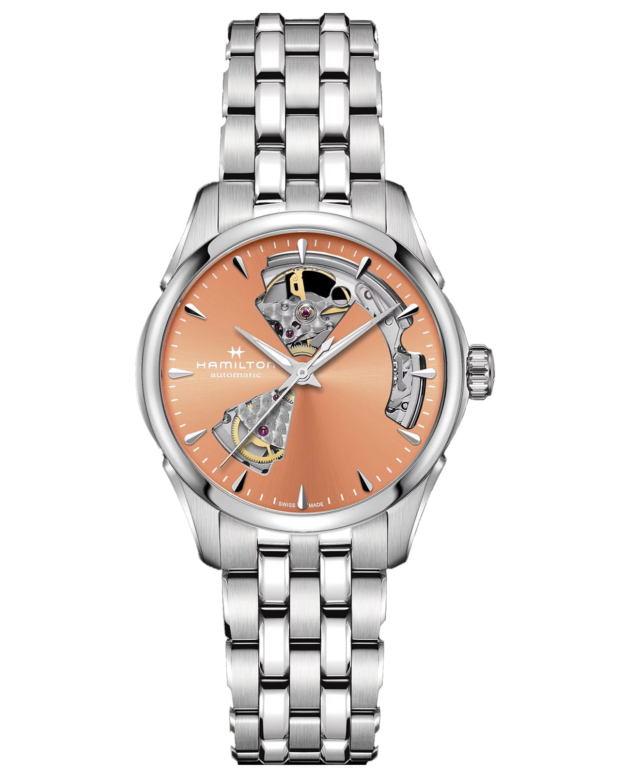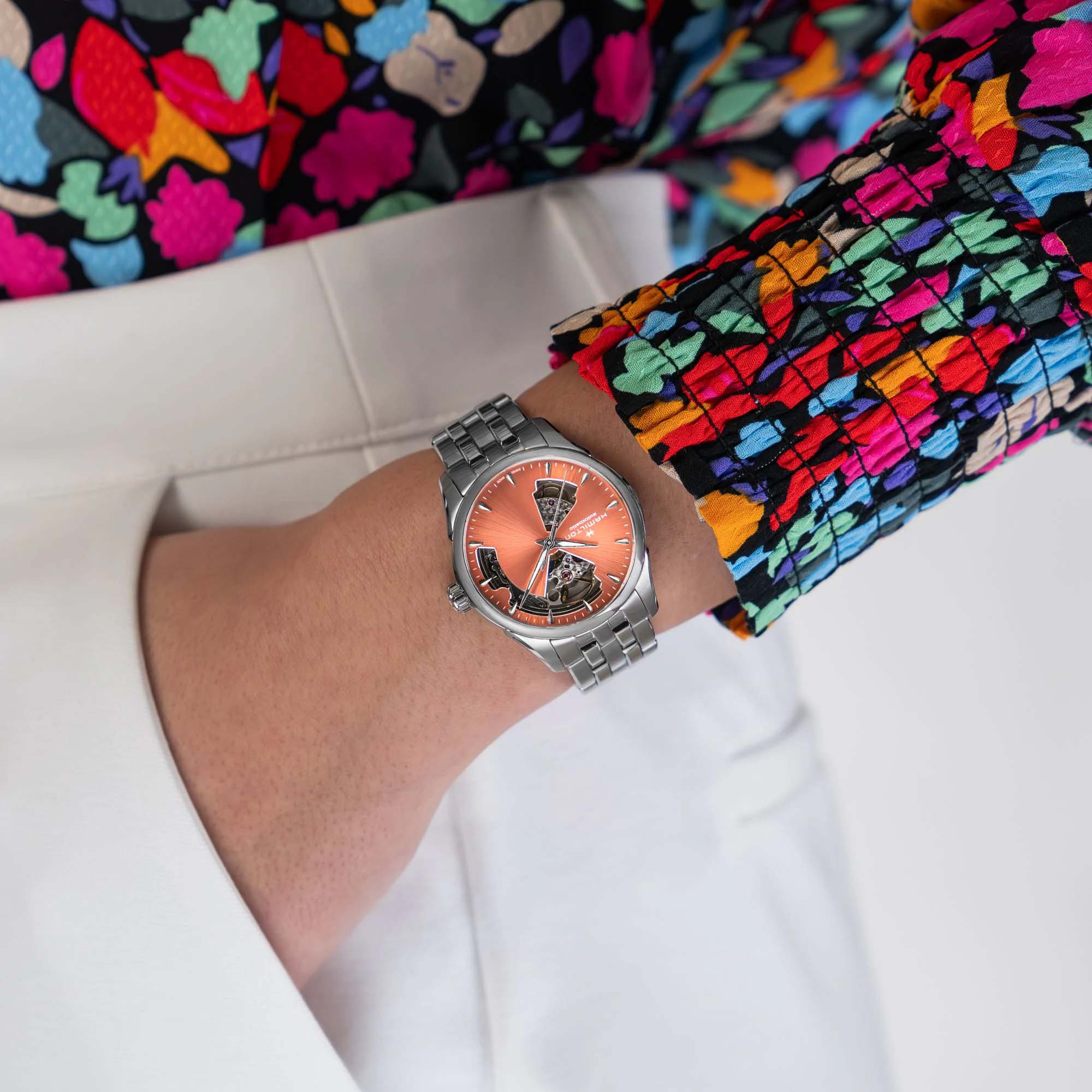 Часы Jazzmaster Open Heart диаметром 36 мм привлекают внимание идеальным балансом классического облика и инновационного мастерства. Эта версия из нержавеющей стали, навеянная свежими распустившимися цветами, отличается скелетонизированным циферблатом нежно-розового цвета, который привносит в дизайн модели женственность и изысканный стиль. Прочное сапфировое стеклоСапфировое стеклоПрочный и надёжный материал из кристалла сапфира синтетического происхождения, характеризующийся особой твёрдостью и устойчивостью к царапинам и повреждениям.. Браслет из нержавеющей стали с застёжкой «бабочка» с кнопкамиЗастёжка "бабочка"Такой вид застёжки дополняется предохранителями, помогающими избежать случайного раскрытия браслета. Обладают изящным исполнением. . Часы оснащены спиралью баланса из сплава Nivachron™Nivachron™Специально разработанный инновационный сплав Nivachron™ повышает устойчивость часов к воздействию магнитных полей..