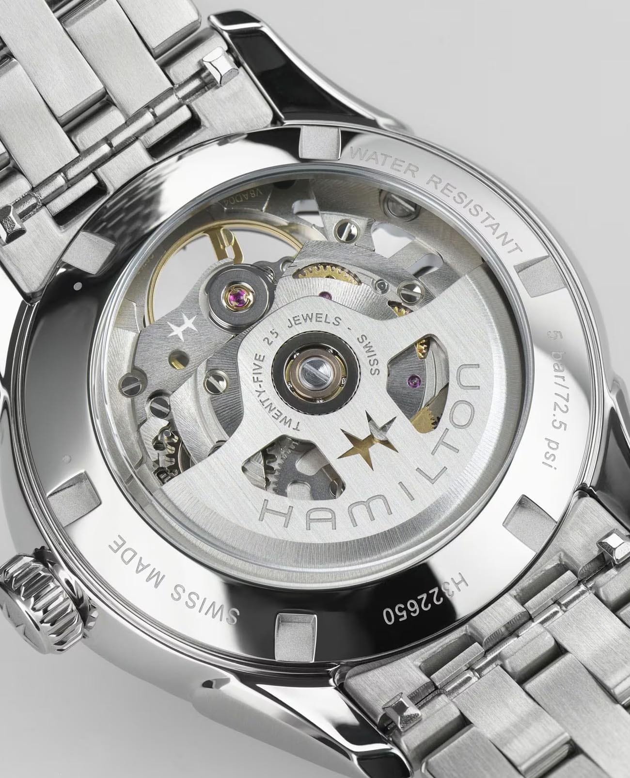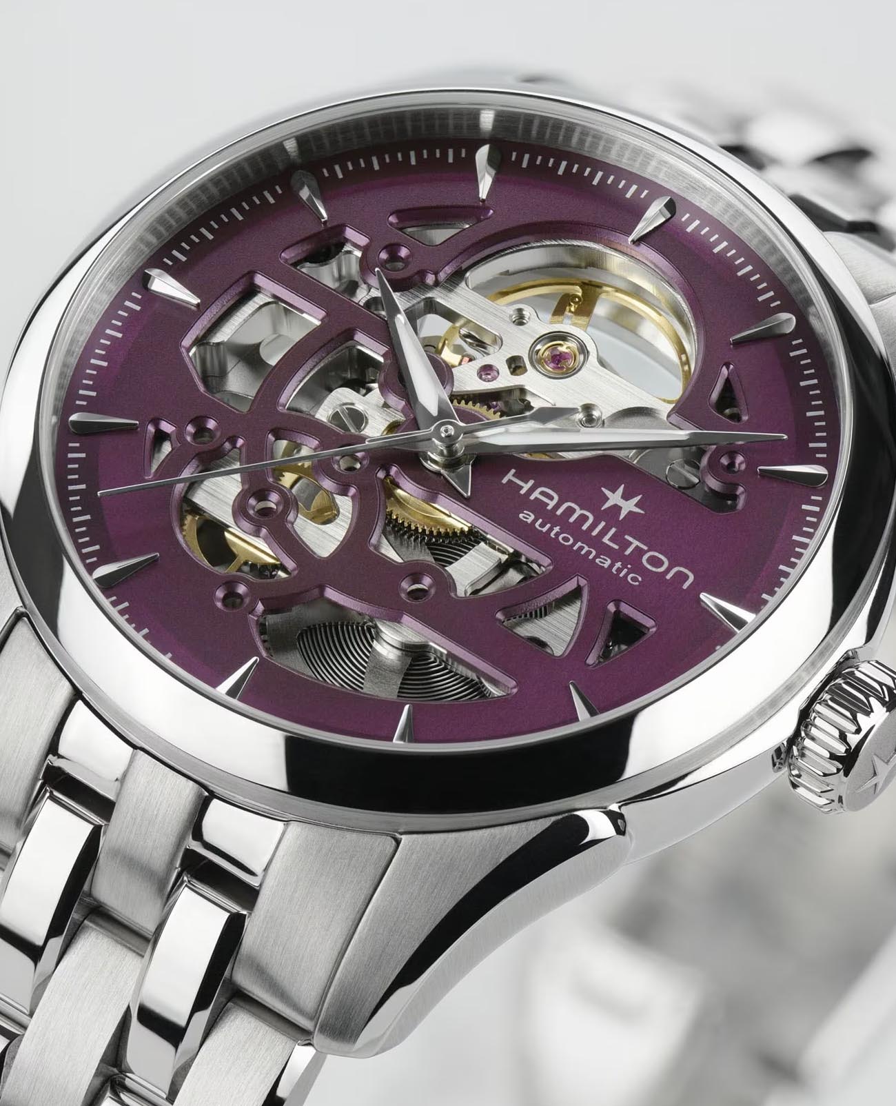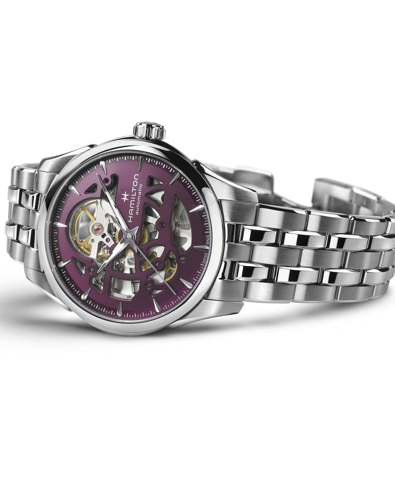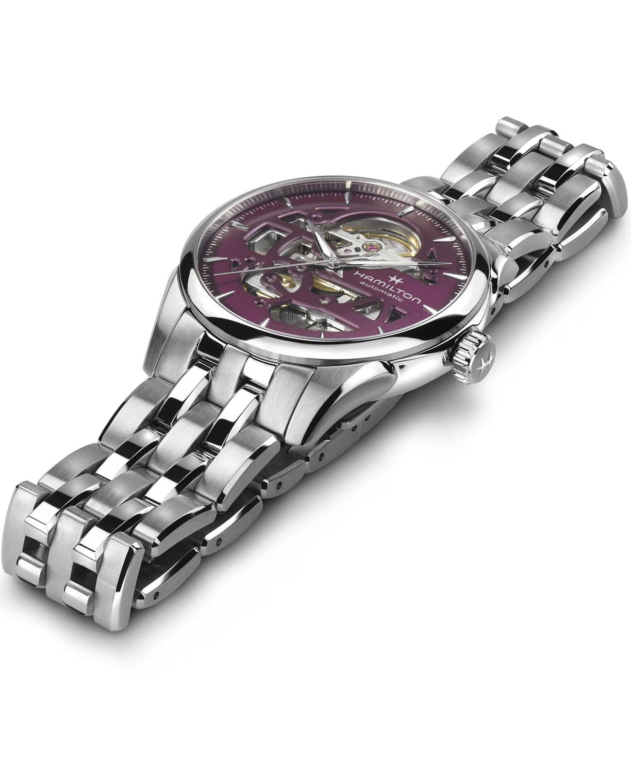 Женские наручные часы-скелетоны Hamilton Jazzmaster Skeleton Lady Auto H32265101 с надёжным автоматическим механизмом. Корпус часов изготовлен из нержавеющей стали. Стальной браслет на застёжке-бабочке с кнопкамиЗастёжка "бабочка"Такой вид застёжки дополняется предохранителями, помогающими избежать случайного раскрытия браслета. Обладают изящным исполнением. . Стрелки и метки с люминесцентным покрытиемЛюминесцентное покрытиеПозволяет считывать показания времени в темноте. Производители наносят на стрелки, часовые индексы, безель или поверхность циферблата светонакопительный состав, дающий холодное свечение.. Сапфировое стеклоСапфировое стеклоПрочный и надёжный материал из кристалла сапфира синтетического происхождения, характеризующийся особой твёрдостью и устойчивостью к царапинам и повреждениям. с антибликовым покрытием. Уровень влагозащиты: 50 метров, позволит защитить корпус от случайных брызг или капель дождя.