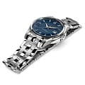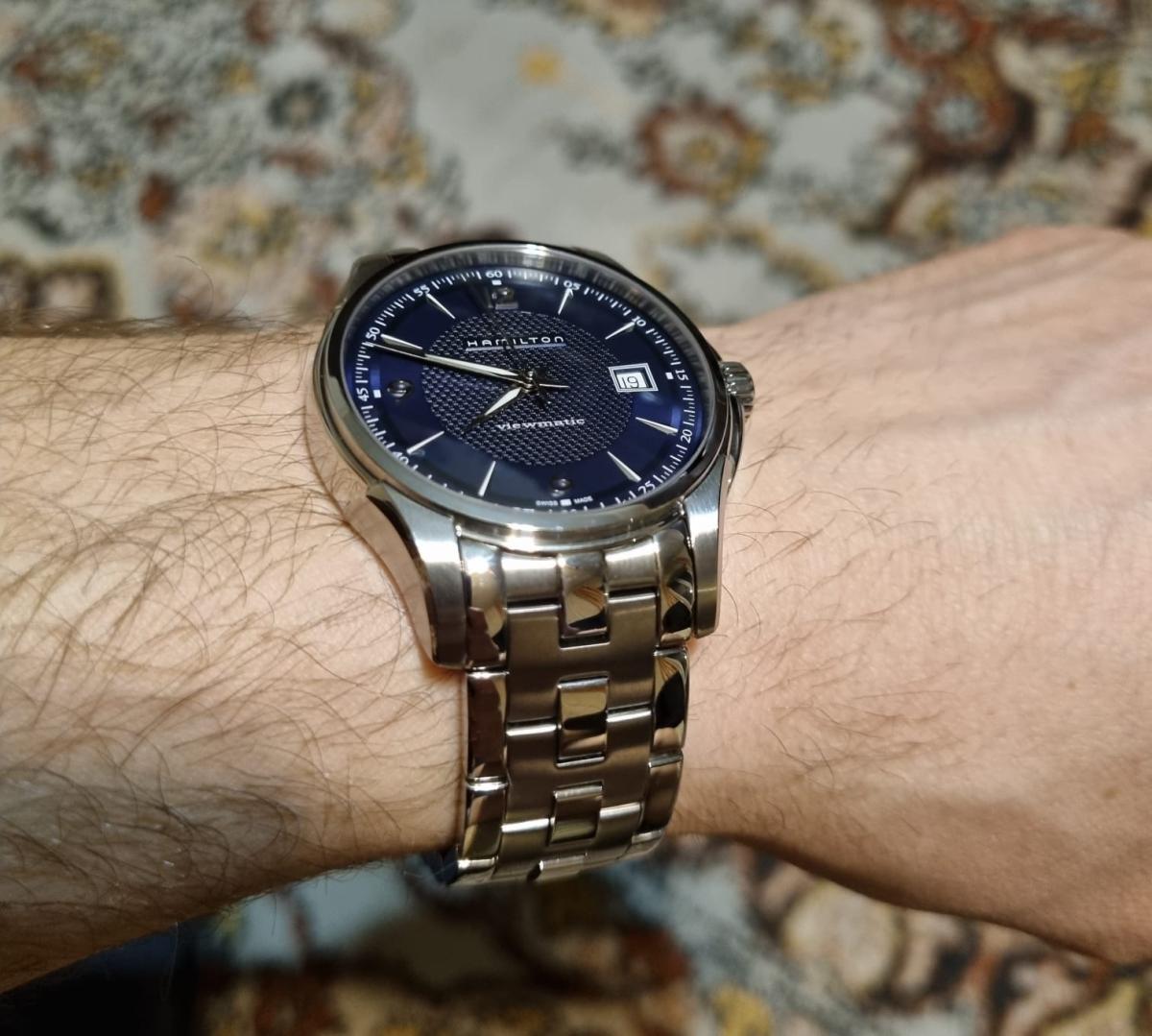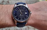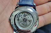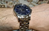 Часы прекрасно сочетаются с синим кожаным ремешком и легко носятся на руке, практически не чувствуешь их, что очень удобно. Модель на браслете имеет вес, смотрится более привлекательно за счет полированных частей звеньев, отмечу хорошую застежку, вообще браслет серьезный, соединения шпильками и втулками. Толщина часов около 11мм, однако на руке кажется не более 9 мм за счет скосов на задней крышке довольно тонкие, не цепляются за рукава, хорошо выполнена защита компактной и в то же время удобной заводной головки. Часы имеют идеальный размер для запястья среднего размера. Задняя крышка с окошком, интересно понаблюдать за работой механизма.