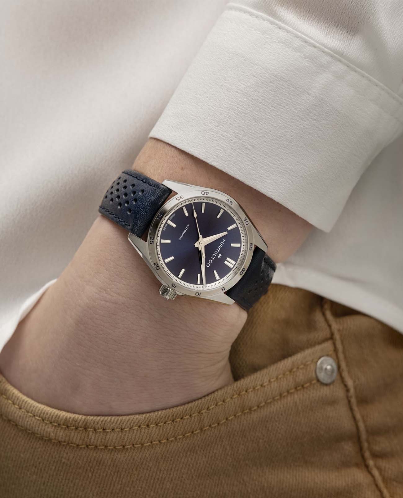 Модели из линии Jazzmaster Performer, привлекающие внимание ярким дизайном в стиле спортивный шик, сочетают в себе функциональность и эстетичность. Часы Jazzmaster Performer Automatic оснащены автоматическим механизмом H-10 с 80-часовым запасом хода. Модель в корпусе из нержавеющей стали диаметром 34 мм имеет лаконичный синий циферблат из нержавеющей стали и сочетающийся с ним перфорированный синий кожаный ремешок в гоночном стиле. Сапфировое стеклоСапфировое стеклоПрочный и надёжный материал из кристалла сапфира синтетического происхождения, характеризующийся особой твёрдостью и устойчивостью к царапинам и повреждениям. с антибликовым покрытием. Кожаный ремешок на стандартной застёжке. Стрелки и метки с люминесцентным покрытиемЛюминесцентное покрытиеПозволяет считывать показания времени в темноте. Производители наносят на стрелки, часовые индексы, безель или поверхность циферблата светонакопительный состав, дающий холодное свечение..