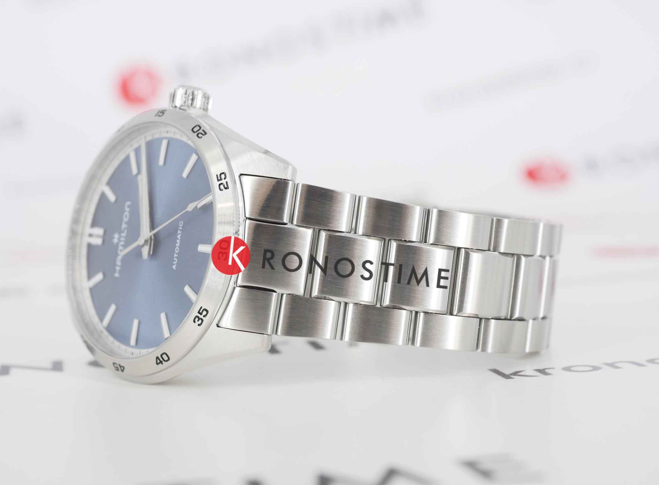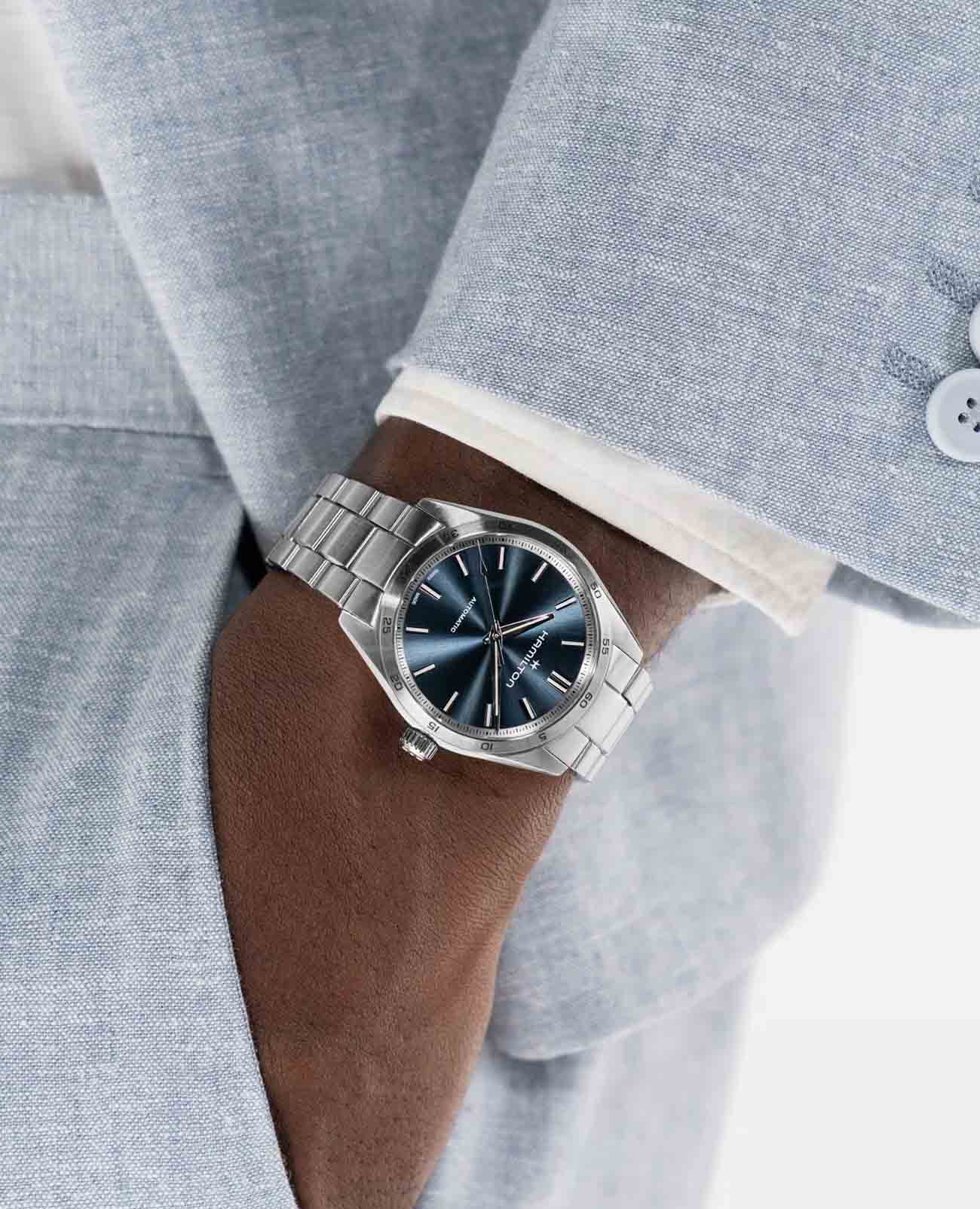 Модели из линии Jazzmaster Performer, привлекающие внимание ярким дизайном в стиле спортивный шик, сочетают в себе функциональность и эстетичность, подходит как для активного отдыха, так и для торжественных мероприятий. . Часы Jazzmaster Performer Automatic оснащены автоматическим механизмом H-10 с 80-часовым запасом хода. Модель в корпусе из нержавеющей стали диаметром 38 мм имеет лаконичный синий циферблат. Стальной браслет на застёжке-бабочке с кнопкамиЗастёжка "бабочка"Такой вид застёжки дополняется предохранителями, помогающими избежать случайного раскрытия браслета. Обладают изящным исполнением. . Стрелки и метки с люминесцентным покрытиемЛюминесцентное покрытиеПозволяет считывать показания времени в темноте. Производители наносят на стрелки, часовые индексы, безель или поверхность циферблата светонакопительный состав, дающий холодное свечение..