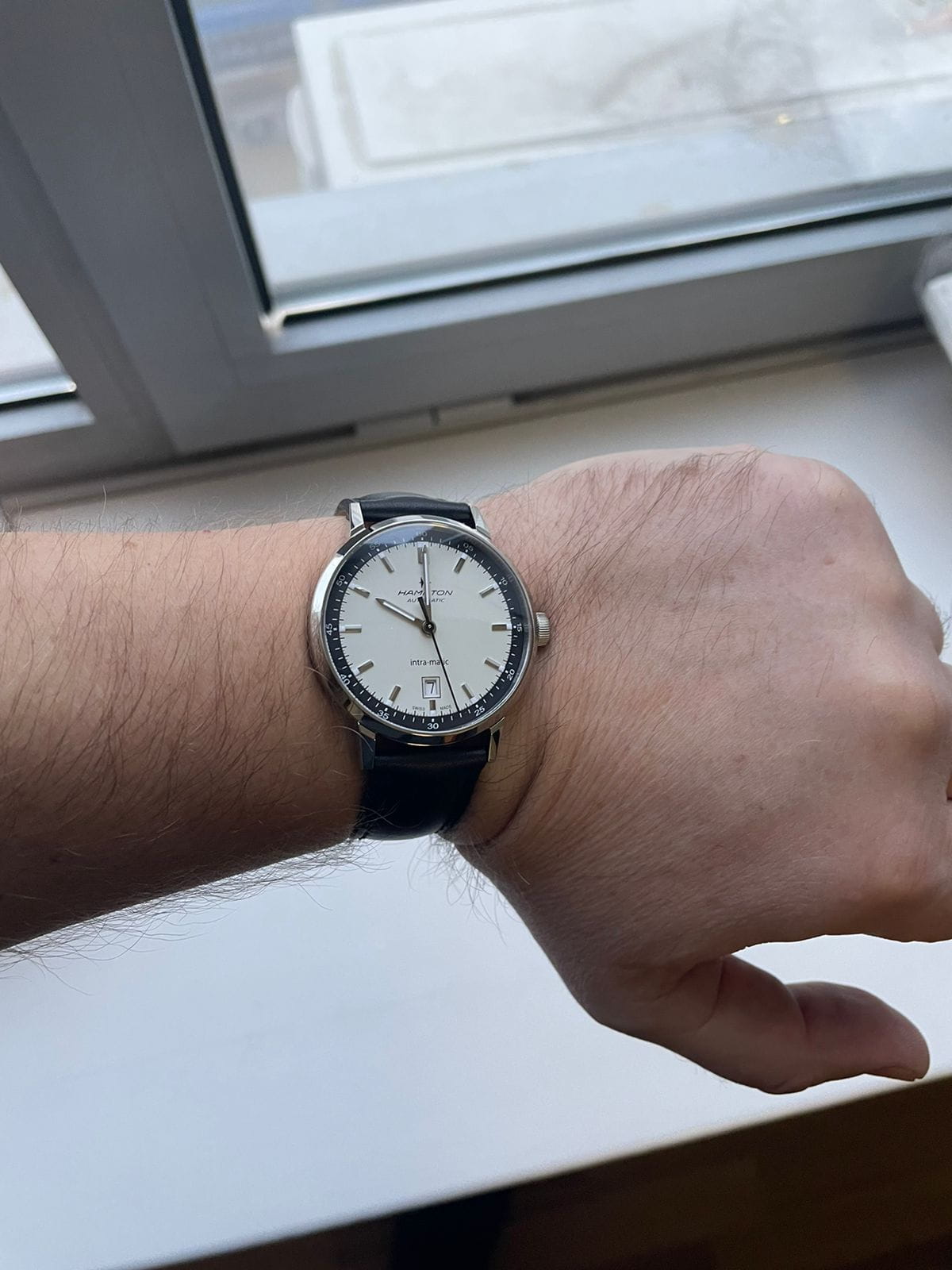Мужские механические швейцарские часы Hamilton American Classic Intra-Matic Auto H38425720, автоматический механизм с высокой точностью. Сапфировое стеклоСапфировое стеклоПрочный и надёжный материал из кристалла сапфира синтетического происхождения, характеризующийся особой твёрдостью и устойчивостью к царапинам и повреждениям. устойчивое к появлению царапин, обладающее высокой прозрачностью. Класс водозащиты: 50 метров, позволит защитить корпус от случайных брызг или капель дождя. Корпус часов изготовлен из нержавеющей стали. Стрелки с люминесцентным покрытиемЛюминесцентное покрытиеПозволяет считывать показания времени в темноте. Производители наносят на стрелки, часовые индексы, безель или поверхность циферблата светонакопительный состав, дающий холодное свечение.. Окошко даты находится в положении шести часов. Кожаный ремешок.