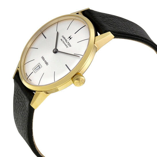 Мужские механические швейцарские часы Hamilton American Classic Intra-Matic Auto H38475751, механический механизм (автоматический калибр) с высокой точностью. Сапфировое стекло устойчивое к появлению царапин, обладающее высокой прозрачностью. Класс водозащиты: 50 метров, позволит защитить корпус от случайных брызг или капель дождя. Корпус часов изготовлен из стали, золотистого цвета.