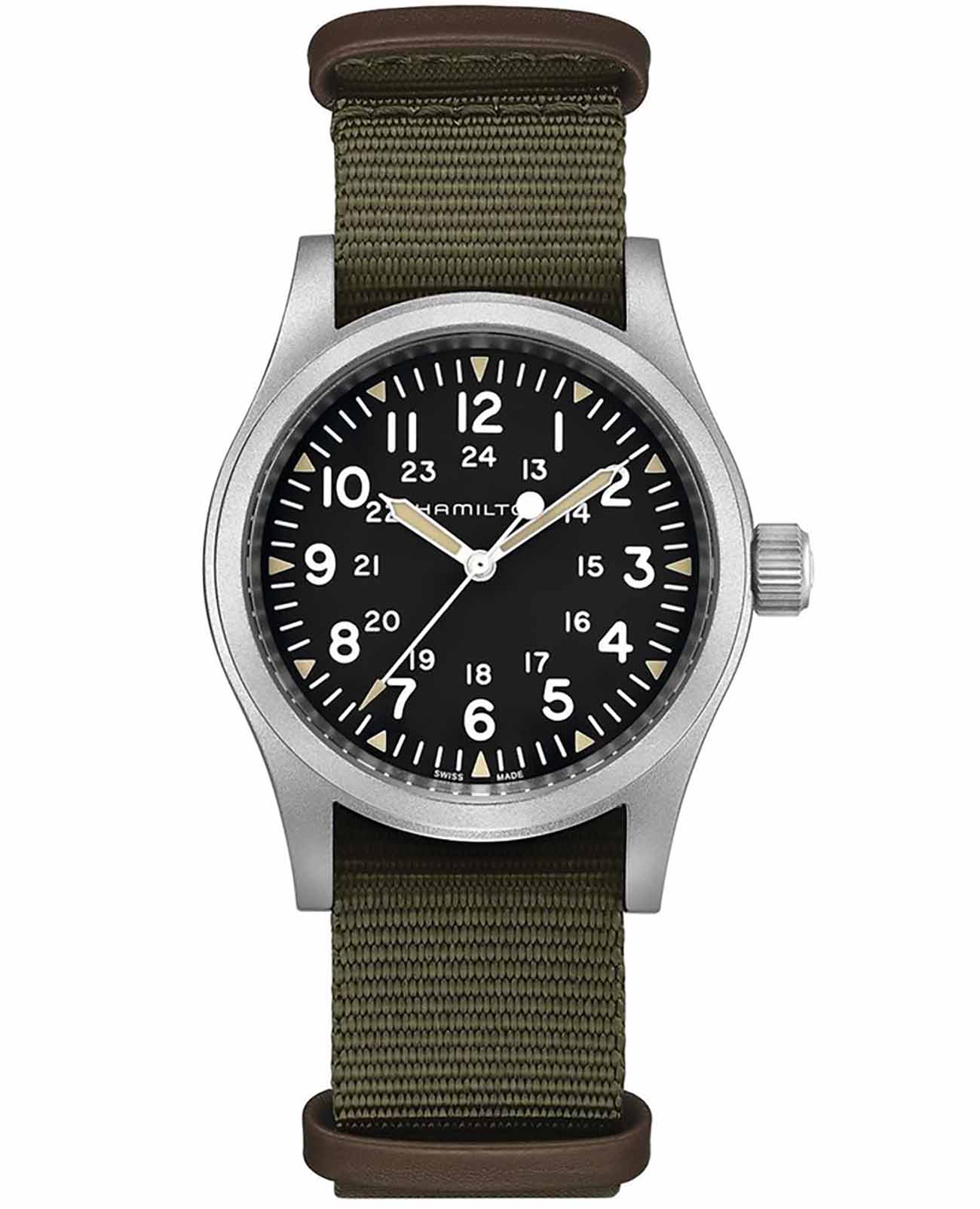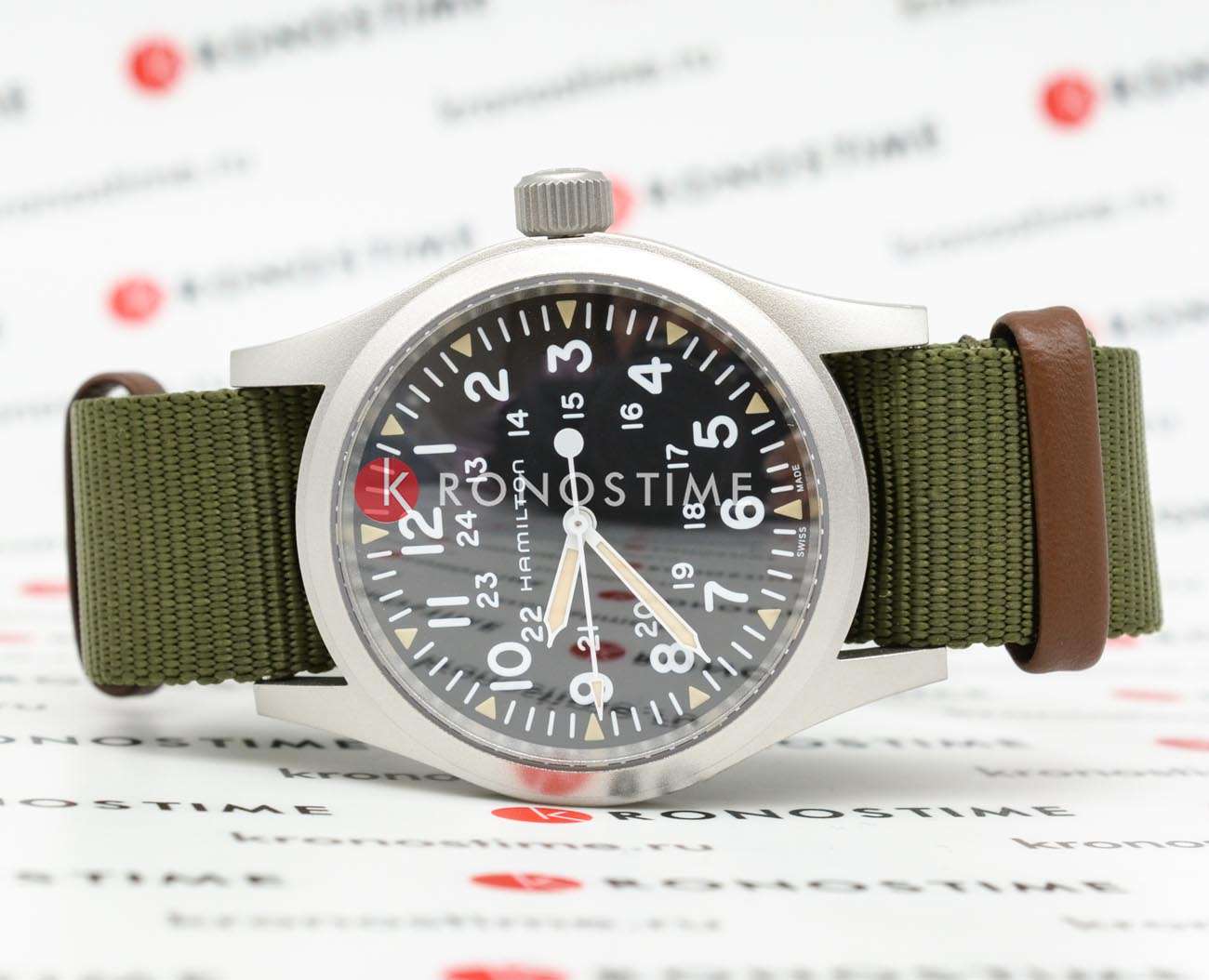 Мужские механические швейцарские часы Hamilton Khaki Field Mechanical H69439931, автоматический механизм с высокой точностью. Сапфировое стеклоСапфировое стеклоПрочный и надёжный материал из кристалла сапфира синтетического происхождения, характеризующийся особой твёрдостью и устойчивостью к царапинам и повреждениям. устойчивое к появлению царапин, обладающее высокой прозрачностью. Класс водозащиты: 50 метров, позволит защитить корпус от случайных брызг или капель дождя. Корпус часов изготовлен из стали. Стрелки и метки с люминесцентным покрытиемЛюминесцентное покрытиеПозволяет считывать показания времени в темноте. Производители наносят на стрелки, часовые индексы, безель или поверхность циферблата светонакопительный состав, дающий холодное свечение.. Тканевый ремешок.