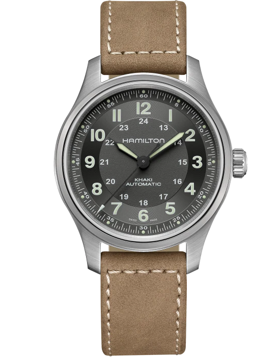Мужские наручные часы Hamilton Khaki Field Titanium Auto H70545550 из коллекции Khaki Field сочетают в себе военный стиль и надежность швейцарских технологий. Модель обладает круглым корпусом диаметром 42 мм, изготовленным из титана , что делает их легкими и устойчивыми к внешним воздействиям. Ремешок выполнен из кожи с классической застежкой, гарантирующей комфортное ношение. Серый циферблат оснащен крупными арабскими цифрами и минутными метками, покрытыми Super-LumiNova®, обеспечивающим превосходную видимость в темноте . Для защиты используется сапфировое стеклоСапфировое стеклоПрочный и надёжный материал из кристалла сапфира синтетического происхождения, характеризующийся особой твёрдостью и устойчивостью к царапинам и повреждениям. с антибликовым покрытиемАнтибликовое покрытиеСлой оксида металла в 0,13-0,3 микрон, благодаря которому стекло часов не бликует и не отражает свет. Антибликовое покрытие уменьшает отражение света в 10 раз, обеспечивая отличную читаемость показателей циферблата., которое эффективно противостоит царапинам . Часы работают на автоматическом механизме калибра H-10 с инновационной спиралью баланса Nivachron™Nivachron™Специально разработанный инновационный сплав Nivachron™ повышает устойчивость часов к воздействию магнитных полей., что обеспечивает высокую точность хода и устойчивость к магнитным полям . Водонепроницаемость часов достигает 10 атмосфер (100 метров), что делает их подходящими для повседневного использования и активного отдыха .