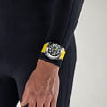 Модель Khaki Belowzero идеально подойдет даже для самых отчаянных глубоководных дайверов. Часы обладают водонепроницаемостью до 100 бар (1000 м) и оснащены гелиевым предохранительным клапаном. Выпуклое cапфировое стеклоСапфировое стеклоПрочный и надёжный материал из кристалла сапфира синтетического происхождения, характеризующийся особой твёрдостью и устойчивостью к царапинам и повреждениям. обеспечивает высокоэффективную защиту при подводных погружениях, а ярко-желтый каучуковый ремешок в сочетании с корпусом из матового титана диаметром 46 мм напоминает шлюз желтой подводной лодки. Это классические морские часы Hamilton для мореплавателей-первооткрывателей. Поворотный безельБезельВнешний ободок, закрепляющий стекло. В спортивных часах так называется поворотное кольцо с делениями на циферблате, выполняет роль таймера – замеряет отрезки времени на шкале. Неподвижный безель – элемент декора. Однонаправленно вращающийся безель на дайверских часах позволяет фиксировать моменты погружения и выныривания на поверхность. из титана.