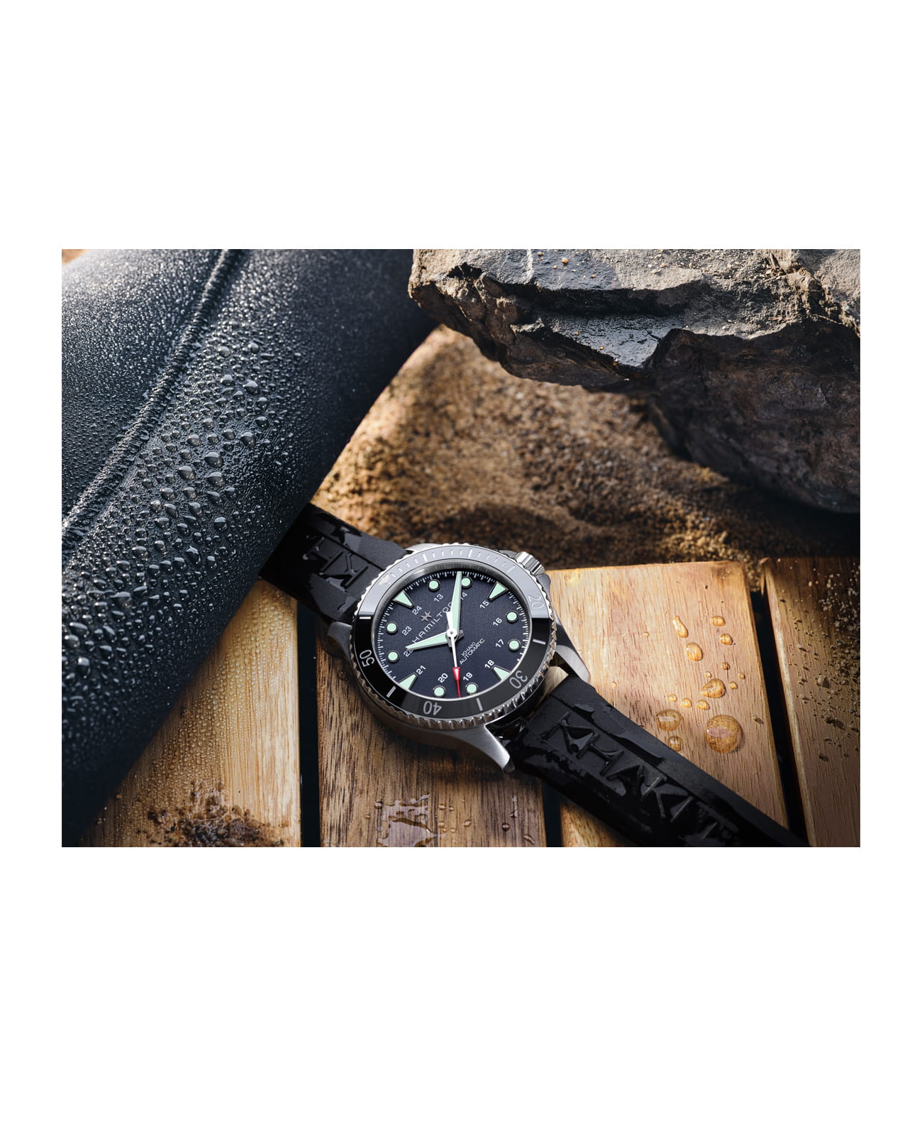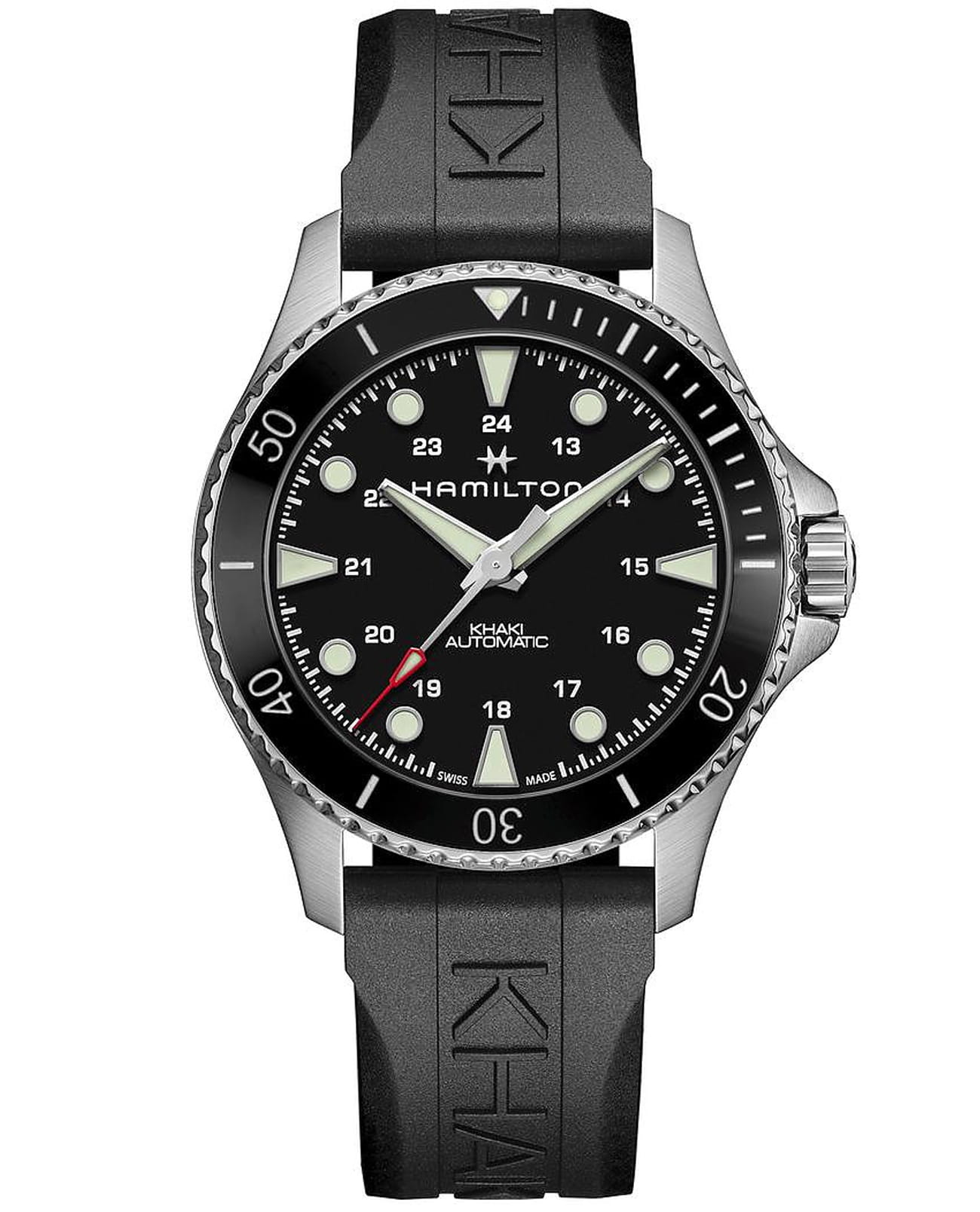 Мужские швейцарские механические часы Hamilton Khaki Navy Scuba Automatic H82515330, автоматический механизм с высокой точностью. Сапфировое стеклоСапфировое стеклоПрочный и надёжный материал из кристалла сапфира синтетического происхождения, характеризующийся особой твёрдостью и устойчивостью к царапинам и повреждениям. устойчивое к появлению царапин, обладающее высокой прозрачностью. Класс водозащиты: 300 метров, позволит плавать, нырять и заниматься другими водными видами спорта. Корпус часов изготовлен из керамики. Стрелки и метки с люминесцентным покрытиемЛюминесцентное покрытиеПозволяет считывать показания времени в темноте. Производители наносят на стрелки, часовые индексы, безель или поверхность циферблата светонакопительный состав, дающий холодное свечение.. Каучуковый ремешок.