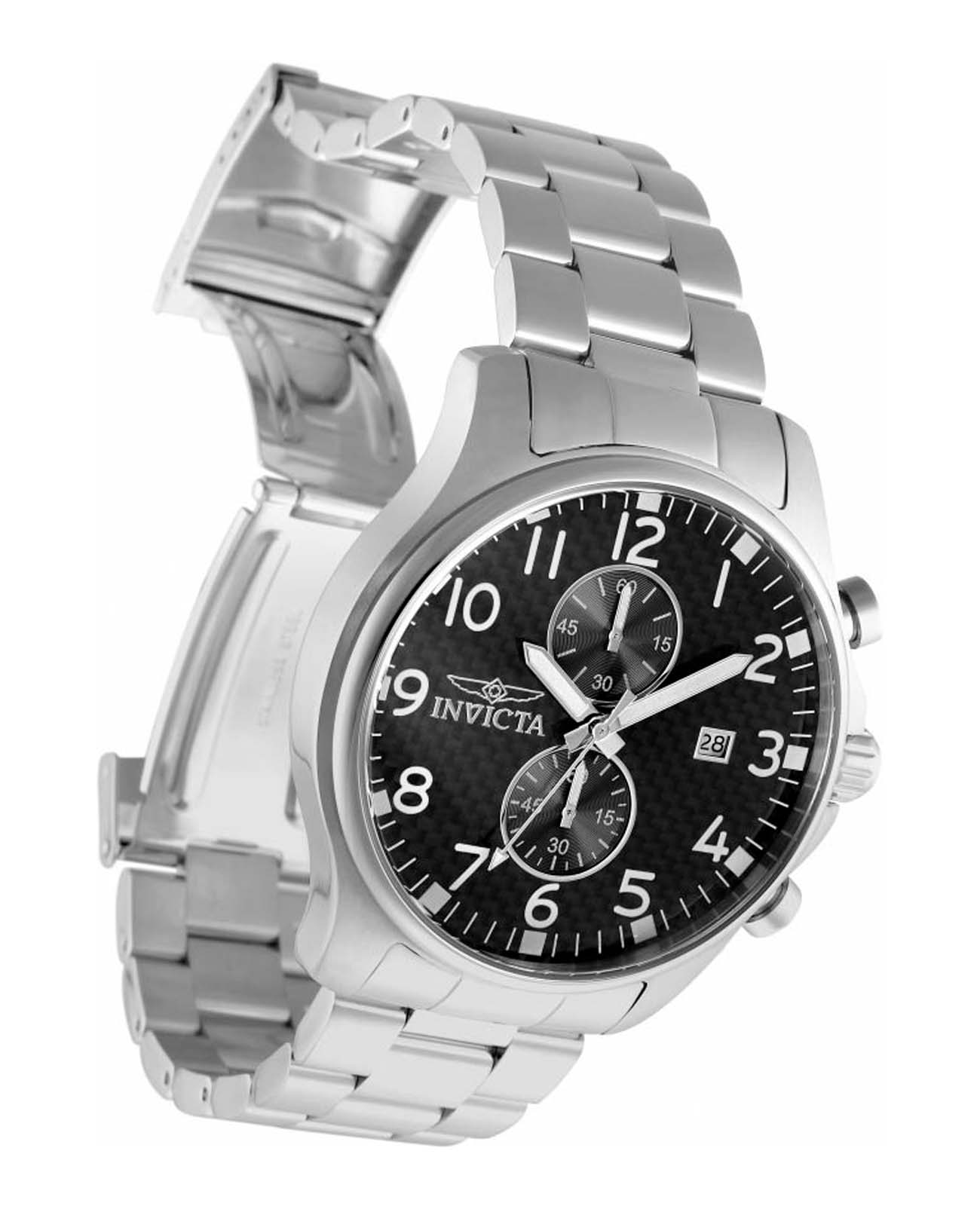 Мужские наручные часы-хронографХронографФункция позволяет измерять отрезки времени с особой точностью: часы, минуты, секунды. Верным признаком хронографа является наличие на циферблате 3 дополнительных окошек-счётчиков. Invicta IN0379 из коллекции Specialty сочетают в себе классический дизайн и функциональность для активного образа жизни. Модель обладает крупным корпусом, выполненным из нержавеющей стали, что обеспечивает высокую устойчивость к внешним воздействиям . Браслет изготовлен из нержавеющей стали с раскладной застежкойРаскладная застёжкаТакой тип застёжки используется только на браслетах из металла. Она никогда не раскрывается полностью, происходит разделение на 2 и более частей. Раскладывающая застёжка снизит вероятность потери часов к минимуму., гарантируя комфортное ношение . Циферблат из карбона дополнен люминесцентными стрелками и метками, которые обеспечивают отличную видимость в темноте . Для защиты используется минеральное стеклоМинеральное стеклоМинеральное стекло представляет собой искусственно выращенный минерал кварца. Такое стекло отличается особой устойчивостью к повреждениям и царапинам. Уступает по некоторым качествам сапфировому стеклу., которое обеспечивает прочную защиту от царапин . Часы оснащены функциями отображения текущего времени, даты, месяца, а также имеют 12/24-часовой формат времени . Модель является хронографом с функцией секундомераСекундомерСекундоме́р — прибор, способный измерять интервалы времени с точностью до долей секунды., что делает её идеальной для ценителей комфорта и практичности . Водонепроницаемость часов достигает 10 атмосфер (100 метров), что позволяет использовать их во время плавания и других водных видов спорта .