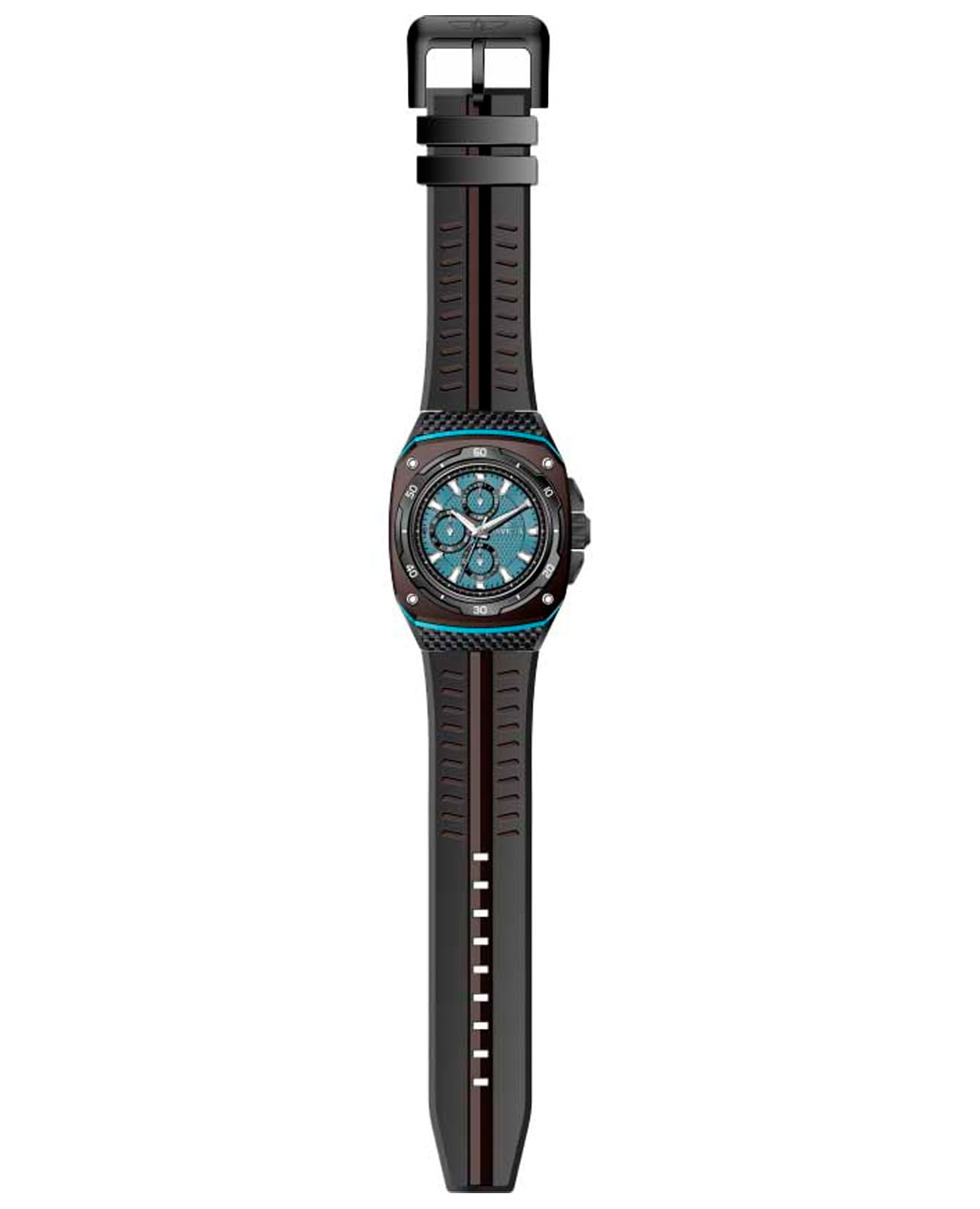 Мужские наручные часы-хронографХронографФункция позволяет измерять отрезки времени с особой точностью: часы, минуты, секунды. Верным признаком хронографа является наличие на циферблате 3 дополнительных окошек-счётчиков. Invicta IN46106 из коллекции Speedway сочетают в себе спортивный дизайн и надежность современных технологий. Модель обладает круглым корпусом диаметром 46 мм, изготовленным из стали с IP-покрытиемIP-покрытиеМетод ионного напыления. Демонстрирует повышенную устойчивость к истиранию, окислению и химическим веществам. Под воздействием высокого давления и температуры около 1500°C молекулы металла надёжно соединяются с частицами корпуса часов., что обеспечивает привлекательный внешний вид и устойчивость к коррозии . Ремешок выполнен из силикона черного цвета шириной 3 см, гарантируя комфортное ношение . Черный циферблат с метками в виде штрихов оснащен люминесцентным покрытиемЛюминесцентное покрытиеПозволяет считывать показания времени в темноте. Производители наносят на стрелки, часовые индексы, безель или поверхность циферблата светонакопительный состав, дающий холодное свечение., что обеспечивает хорошую видимость в темноте . Для защиты используется минеральное стеклоМинеральное стеклоМинеральное стекло представляет собой искусственно выращенный минерал кварца. Такое стекло отличается особой устойчивостью к повреждениям и царапинам. Уступает по некоторым качествам сапфировому стеклу., обеспечивающее прочную защиту от царапин . Часы работают на кварцевом механизме, что гарантирует точное время без необходимости подзаводки. Модель также является хронографомХронографФункция позволяет измерять отрезки времени с особой точностью: часы, минуты, секунды. Верным признаком хронографа является наличие на циферблате 3 дополнительных окошек-счётчиков., оснащенным функцией секундомераСекундомерСекундоме́р — прибор, способный измерять интервалы времени с точностью до долей секунды., делая ее идеальной для активного образа жизни . Водонепроницаемость часов достигает 50 метров (5 атмосфер), что позволяет использовать их во время мытья рук или дождя, однако не рекомендуется для плавания или дайвинга .