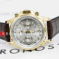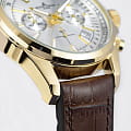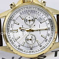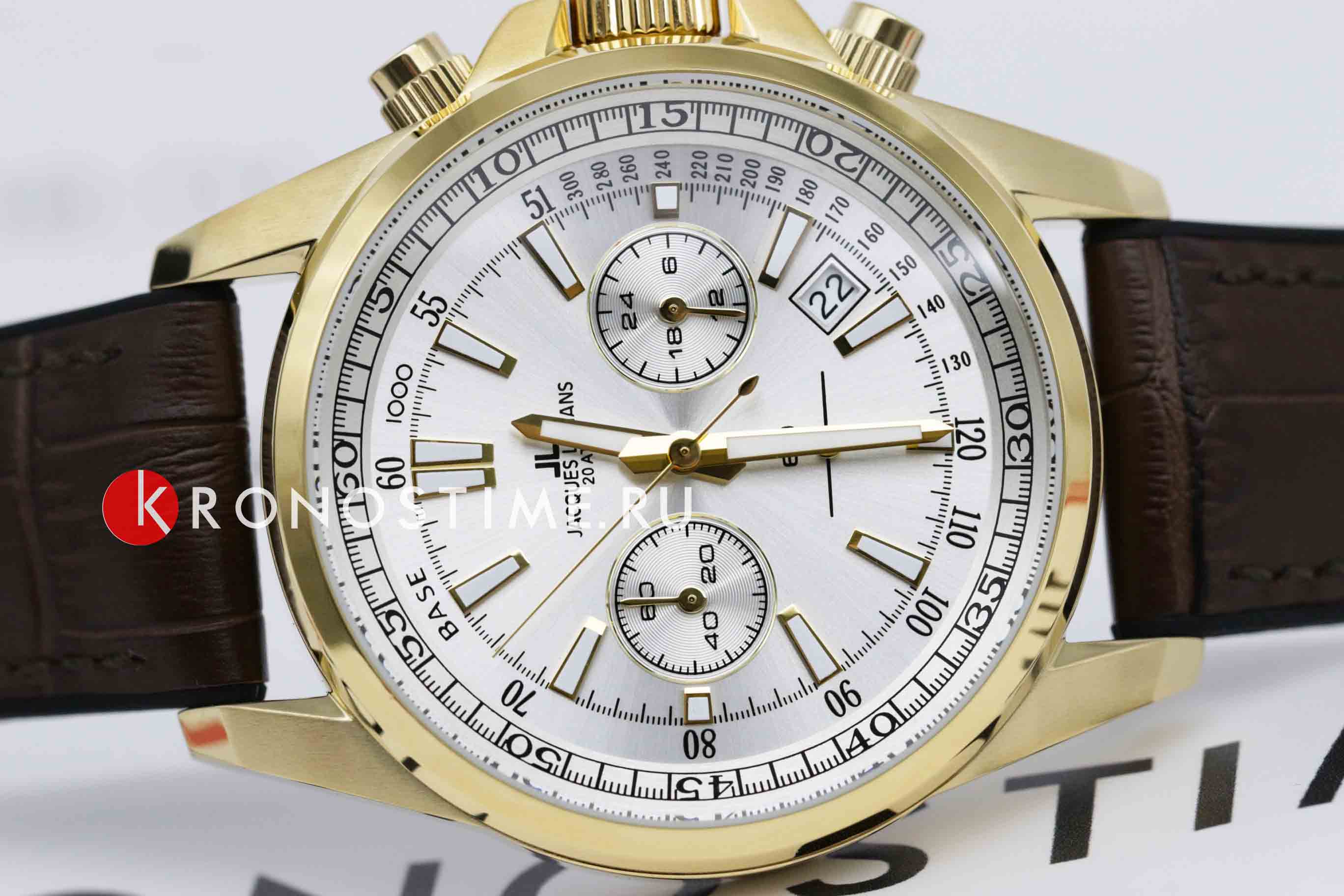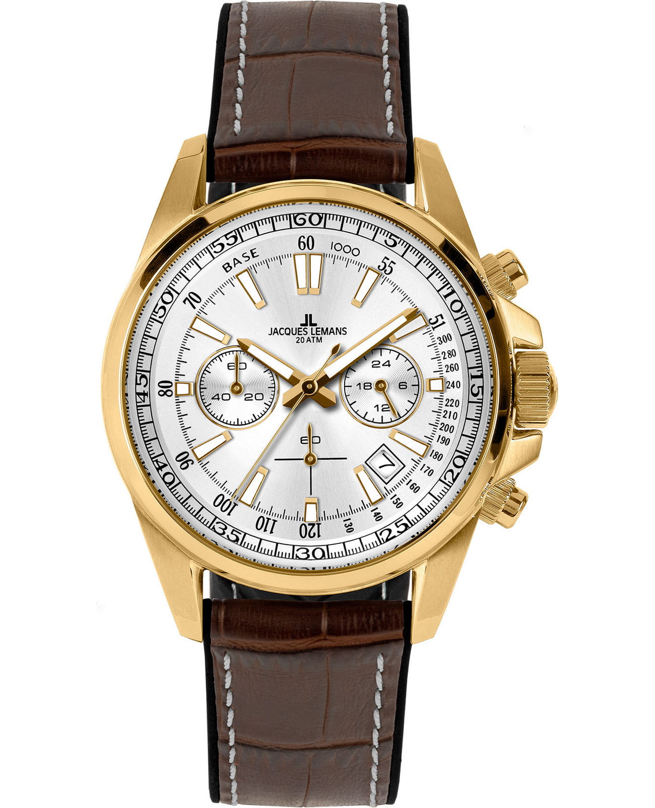 Мужские австрийские часы-хронографХронографФункция позволяет измерять отрезки времени с особой точностью: часы, минуты, секунды. Верным признаком хронографа является наличие на циферблате 3 дополнительных окошек-счётчиков. Jacques Lemans Sport 1-2117F, кварцевый механизм с высокой точностью. Класс водозащиты: 200 метров, позволит плавать, нырять и заниматься другими водными видами спорта. Корпус часов изготовлен из стали с PVD-покрытиемPVDУльтратонкое покрытие наносится в технике вакуумного напыления, сочетает в себе нитрид титана особой прочности со слоем золота или оксида хрома. Несёт в себе декоративную или защитную функцию. из желтого золота. Кнопки хронографаХронографФункция позволяет измерять отрезки времени с особой точностью: часы, минуты, секунды. Верным признаком хронографа является наличие на циферблате 3 дополнительных окошек-счётчиков. продуманного размера удобно использовать, а для рельефной заводной головки предусмотрена дополнительная защита. На белом циферблате с полировкой в виде солнечных лучей расположены крупные часовая и минутная стрелки и риски с люминесцентным покрытиемЛюминесцентное покрытиеПозволяет считывать показания времени в темноте. Производители наносят на стрелки, часовые индексы, безель или поверхность циферблата светонакопительный состав, дающий холодное свечение., которое помогает определить время даже в темноте. Хорошо читаются дополнительные индикаторы 24-х часов, счетчики минут и секунд, окошко даты. Предусмотрен тахиметрТахиметрРазмеченная шкала, располагается на ободке или безеле часов. Тахиметр позволяет рассчитать скорость на определённом участке пути, расстояние измеряется в километрах или милях.: его используют, например, для определения скорости. В часах установлено ударопрочное минеральное стеклоМинеральное стеклоМинеральное стекло представляет собой искусственно выращенный минерал кварца. Такое стекло отличается особой устойчивостью к повреждениям и царапинам. Уступает по некоторым качествам сапфировому стеклу. Crystex. Удобный ремешок темно-коричневого цвета из натуральной кожи (верхняя часть) и силикона (внутренняя часть) дополнен прошивкой, что позволяет продлить срок его службы.