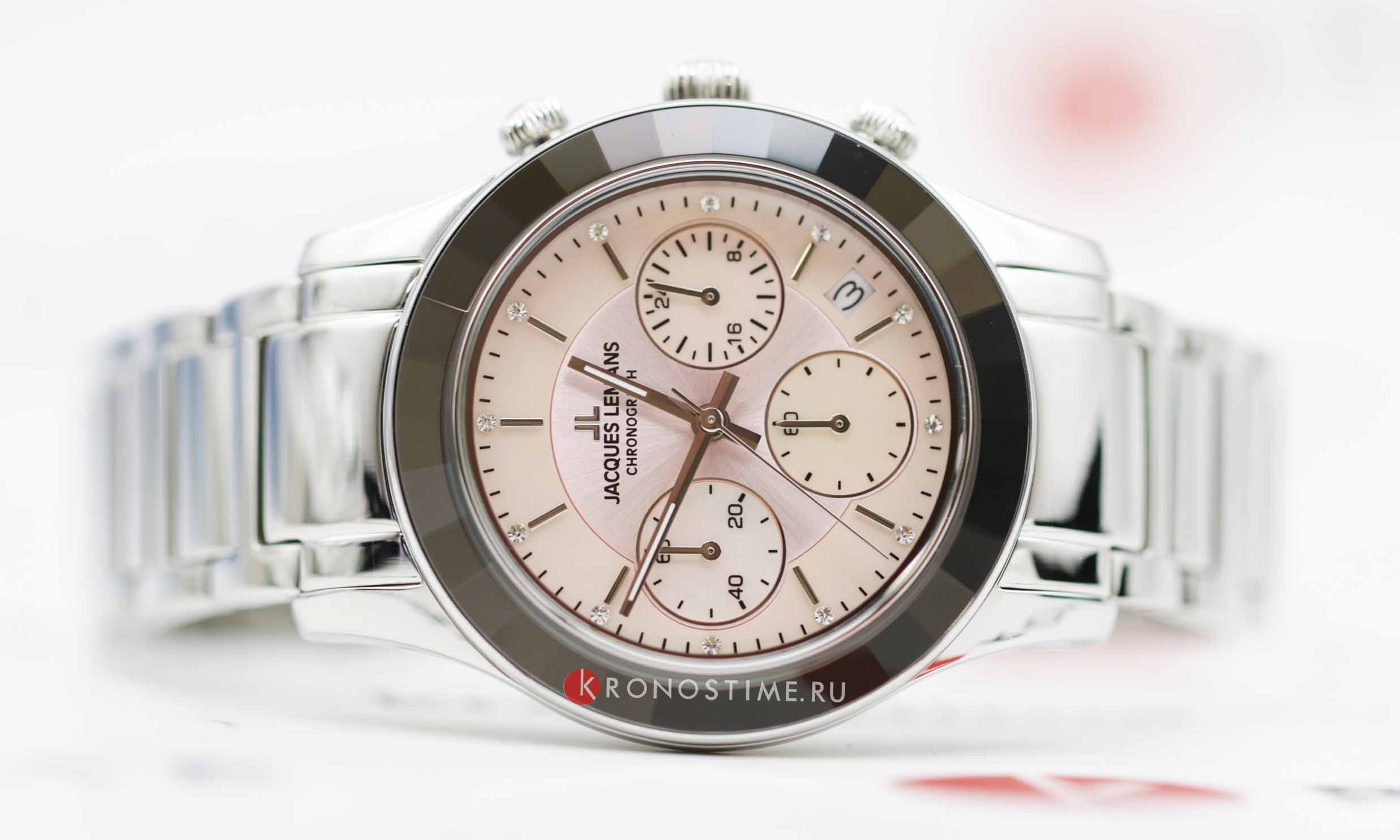 Женские часы-хронографХронографФункция позволяет измерять отрезки времени с особой точностью: часы, минуты, секунды. Верным признаком хронографа является наличие на циферблате 3 дополнительных окошек-счётчиков. c секундомеромСекундомерСекундоме́р — прибор, способный измерять интервалы времени с точностью до долей секунды. Jacques Lemans Venice 1-2151L, кварцевый механизм с высокой точностью. Минеральное стеклоМинеральное стеклоМинеральное стекло представляет собой искусственно выращенный минерал кварца. Такое стекло отличается особой устойчивостью к повреждениям и царапинам. Уступает по некоторым качествам сапфировому стеклу. устойчивое к мелким механическим повреждениям. Корпус из нержавеющей стали. Широкий безельБезельВнешний ободок, закрепляющий стекло. В спортивных часах так называется поворотное кольцо с делениями на циферблате, выполняет роль таймера – замеряет отрезки времени на шкале. Неподвижный безель – элемент декора. Однонаправленно вращающийся безель на дайверских часах позволяет фиксировать моменты погружения и выныривания на поверхность. с гранями. На циферблате расположены три дополнительных индикатора. Окошко даты находится в положении между 4 и 5 часов. Стрелки с люминесцентным покрытиемЛюминесцентное покрытиеПозволяет считывать показания времени в темноте. Производители наносят на стрелки, часовые индексы, безель или поверхность циферблата светонакопительный состав, дающий холодное свечение.. Каждая накладная риска украшена кристаллом Swarowski. Класс водозащиты: 50 метров, позволит защитить корпус от случайных брызг или капель дождя. Браслет из нержавеющей стали на раскладной застёжкеРаскладная застёжкаТакой тип застёжки используется только на браслетах из металла. Она никогда не раскрывается полностью, происходит разделение на 2 и более частей. Раскладывающая застёжка снизит вероятность потери часов к минимуму..