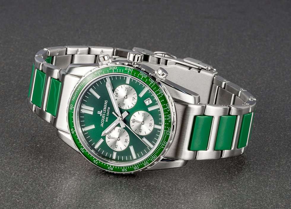 Мужские часы Jacques Lemans Liverpool 1-2059J — это стильное сочетание элегантности и современного дизайна. Корпус из нержавеющей стали диаметром 39 мм идеально сбалансирован и элегантен. Минеральное стеклоМинеральное стеклоМинеральное стекло представляет собой искусственно выращенный минерал кварца. Такое стекло отличается особой устойчивостью к повреждениям и царапинам. Уступает по некоторым качествам сапфировому стеклу. защищает циферблат от царапин. Браслет из нержавеющей стали на раскладной застёжкеРаскладная застёжкаТакой тип застёжки используется только на браслетах из металла. Она никогда не раскрывается полностью, происходит разделение на 2 и более частей. Раскладывающая застёжка снизит вероятность потери часов к минимуму. идеально дополняют дизайн часов, обеспечивая комфортное ношение. Стрелки и метки с люминесцентным покрытиемЛюминесцентное покрытиеПозволяет считывать показания времени в темноте. Производители наносят на стрелки, часовые индексы, безель или поверхность циферблата светонакопительный состав, дающий холодное свечение.. БезельБезельВнешний ободок, закрепляющий стекло. В спортивных часах так называется поворотное кольцо с делениями на циферблате, выполняет роль таймера – замеряет отрезки времени на шкале. Неподвижный безель – элемент декора. Однонаправленно вращающийся безель на дайверских часах позволяет фиксировать моменты погружения и выныривания на поверхность. с PVDPVDУльтратонкое покрытие наносится в технике вакуумного напыления, сочетает в себе нитрид титана особой прочности со слоем золота или оксида хрома. Несёт в себе декоративную или защитную функцию. покрытием и со шкалой тахиметраТахиметрРазмеченная шкала, располагается на ободке или безеле часов. Тахиметр позволяет рассчитать скорость на определённом участке пути, расстояние измеряется в километрах или милях. обрамляет циферблат. Функции хронографаХронографФункция позволяет измерять отрезки времени с особой точностью: часы, минуты, секунды. Верным признаком хронографа является наличие на циферблате 3 дополнительных окошек-счётчиков. с секундомеромСекундомерСекундоме́р — прибор, способный измерять интервалы времени с точностью до долей секунды. представляют собой стильный аксессуар, отражающий идеальное сочетание современного дизайна, надёжности и функциональности. Часы обладают впечатляющей водонепроницаемостью до 10 бар (100 метров), что делает их идеальными для повседневной носки.