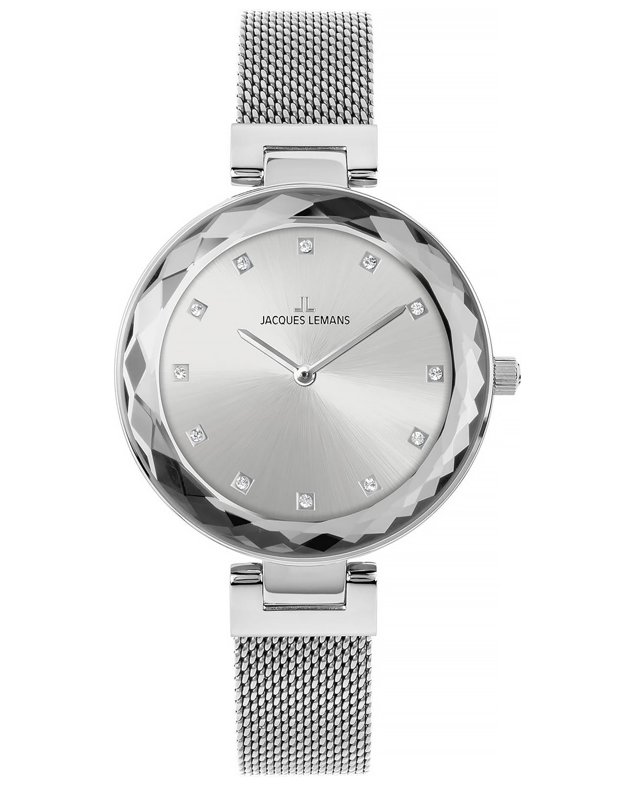 Классические часы в современном прочтении от Jacques Lemans. Корпус круглой формы диаметром 38 мм сделан из нержавеющей стали: этот материал известен своими гипоаллергенными свойствами. БезельБезельВнешний ободок, закрепляющий стекло. В спортивных часах так называется поворотное кольцо с делениями на циферблате, выполняет роль таймера – замеряет отрезки времени на шкале. Неподвижный безель – элемент декора. Однонаправленно вращающийся безель на дайверских часах позволяет фиксировать моменты погружения и выныривания на поверхность. с многочисленными гранями привлекает внимание к лаконичному и хорошо читаемому циферблату черного цвета. Роль маркеров часов выполняют кристаллы Swarovski. В часах установлено ударопрочное минеральное стеклоМинеральное стеклоМинеральное стекло представляет собой искусственно выращенный минерал кварца. Такое стекло отличается особой устойчивостью к повреждениям и царапинам. Уступает по некоторым качествам сапфировому стеклу. Crystex.