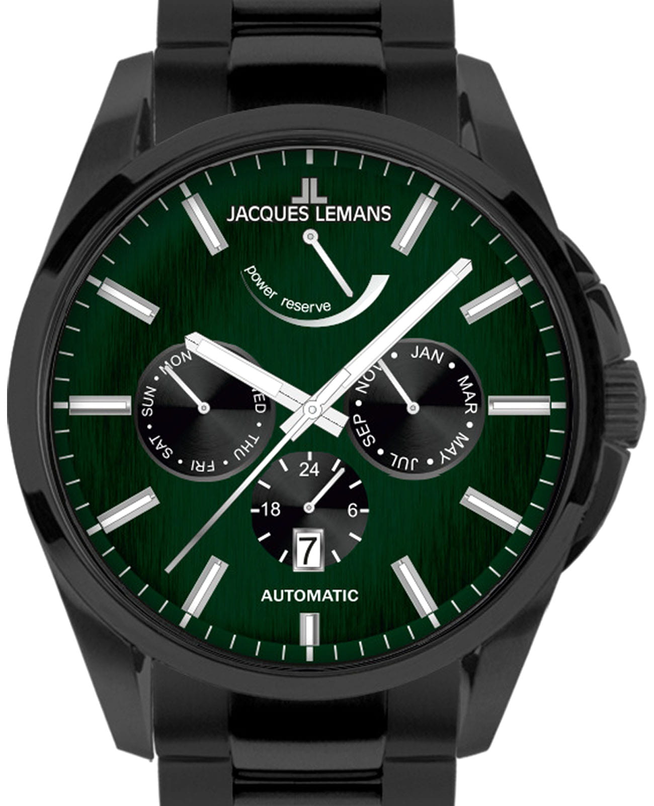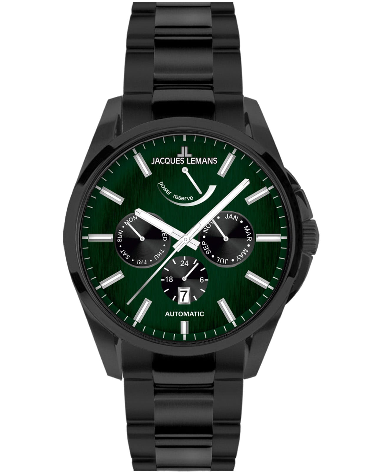 Мужские механические часы с автоподзаводом Jacques Lemans 1-2204B – лаконичная красота и изысканная элегантность. Оригинальная модель с классическим оформлением станет превосходным завершением образа, наделив его индивидуальным характером. Корпус выполнен из нержавеющей стали с PVD-покрытиемPVDУльтратонкое покрытие наносится в технике вакуумного напыления, сочетает в себе нитрид титана особой прочности со слоем золота или оксида хрома. Несёт в себе декоративную или защитную функцию. черного цвета, диаметром 44 мм, что обеспечивает долговечность и утончённый внешний вид. Минеральное стеклоМинеральное стеклоМинеральное стекло представляет собой искусственно выращенный минерал кварца. Такое стекло отличается особой устойчивостью к повреждениям и царапинам. Уступает по некоторым качествам сапфировому стеклу. с сапфировым напылением защищает циферблат от царапин. Стальной браслет на раскладной застёжкеРаскладная застёжкаТакой тип застёжки используется только на браслетах из металла. Она никогда не раскрывается полностью, происходит разделение на 2 и более частей. Раскладывающая застёжка снизит вероятность потери часов к минимуму. обеспечивает комфортное ношение. Водозащита 100 метров позволит плавать, нырять и заниматься другими водными видами спорта. Стрелки и метки с люминесцентным покрытиемЛюминесцентное покрытиеПозволяет считывать показания времени в темноте. Производители наносят на стрелки, часовые индексы, безель или поверхность циферблата светонакопительный состав, дающий холодное свечение. позволяющие легко определять время даже в темноте. Окошко даты находится в положении 6 часов. Индикатор 24-х часов, календарь недели и месяцев вынесены на отдельные циферблаты. Индикация запаса хода в положении 12 часов. Рифленая заводная головка с защитой. Это аксессуар для мужчины, который ценит классический стиль и функциональность.