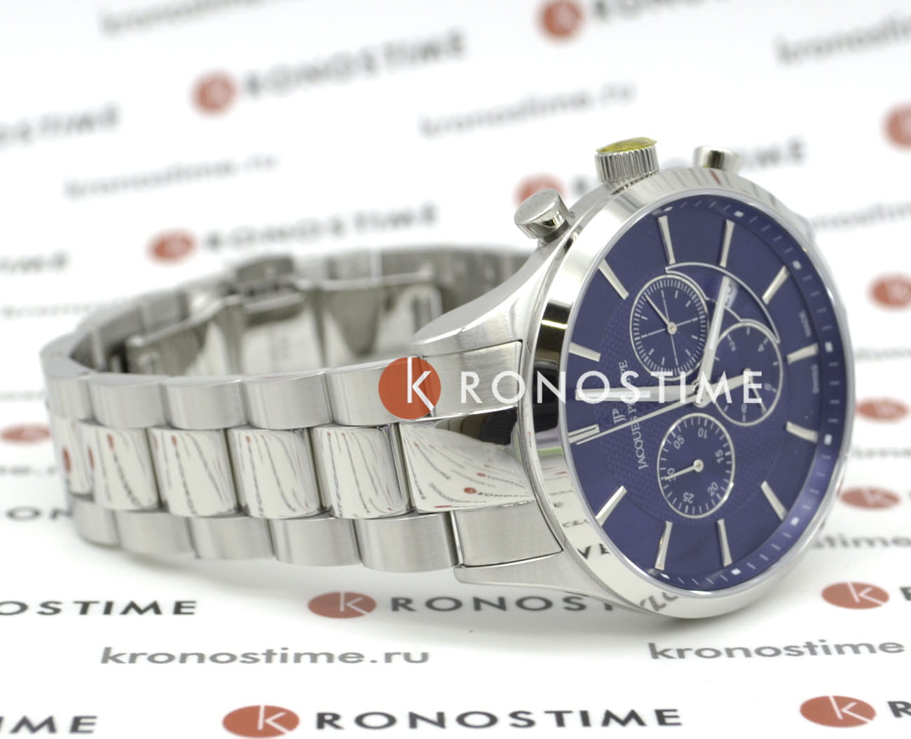 Швейцарские мужские часы-хронографХронографФункция позволяет измерять отрезки времени с особой точностью: часы, минуты, секунды. Верным признаком хронографа является наличие на циферблате 3 дополнительных окошек-счётчиков. Jacques Philippe Gallant JPQGC031336, кварцевый механизм с высокой точностью. Сапфировое стеклоСапфировое стеклоПрочный и надёжный материал из кристалла сапфира синтетического происхождения, характеризующийся особой твёрдостью и устойчивостью к царапинам и повреждениям. устойчивое к появлению царапин, обладающее высокой прозрачностью. Корпус часов изготовлен из нержавеющей стали. На циферблате три дополнительных индикатора. Стрелки с люминесцентным покрытиемЛюминесцентное покрытиеПозволяет считывать показания времени в темноте. Производители наносят на стрелки, часовые индексы, безель или поверхность циферблата светонакопительный состав, дающий холодное свечение.. Окошко даты находится между 4 и 5 часами. Класс водозащиты: 50 метров, позволит защитить корпус от случайных брызг или капель дождя. Стальной браслет на застёжке «бабочка» с кнопкамиЗастёжка "бабочка"Такой вид застёжки дополняется предохранителями, помогающими избежать случайного раскрытия браслета. Обладают изящным исполнением. .