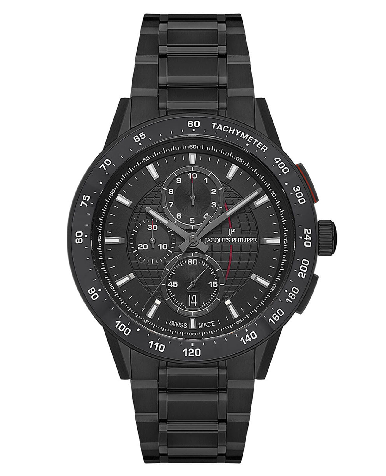 Швейцарские мужские часы-хронографХронографФункция позволяет измерять отрезки времени с особой точностью: часы, минуты, секунды. Верным признаком хронографа является наличие на циферблате 3 дополнительных окошек-счётчиков. с секундомеромСекундомерСекундоме́р — прибор, способный измерять интервалы времени с точностью до долей секунды. Jacques Philippe Globus JPQGC284311, кварцевый механизм с высокой точностью. Сапфировое стеклоСапфировое стеклоПрочный и надёжный материал из кристалла сапфира синтетического происхождения, характеризующийся особой твёрдостью и устойчивостью к царапинам и повреждениям. устойчивое к появлению царапин, обладающее высокой прозрачностью. Корпус часов изготовлен из нержавеющей стали с IP-покрытиемIP-покрытиеМетод ионного напыления. Демонстрирует повышенную устойчивость к истиранию, окислению и химическим веществам. Под воздействием высокого давления и температуры около 1500°C молекулы металла надёжно соединяются с частицами корпуса часов.. БезельБезельВнешний ободок, закрепляющий стекло. В спортивных часах так называется поворотное кольцо с делениями на циферблате, выполняет роль таймера – замеряет отрезки времени на шкале. Неподвижный безель – элемент декора. Однонаправленно вращающийся безель на дайверских часах позволяет фиксировать моменты погружения и выныривания на поверхность. с тахиметромТахиметрРазмеченная шкала, располагается на ободке или безеле часов. Тахиметр позволяет рассчитать скорость на определённом участке пути, расстояние измеряется в километрах или милях.. На циферблате три дополнительных индикатора. Окошко даты находится в положении 6 часов. Стрелки с люминесцентным покрытиемЛюминесцентное покрытиеПозволяет считывать показания времени в темноте. Производители наносят на стрелки, часовые индексы, безель или поверхность циферблата светонакопительный состав, дающий холодное свечение.. Класс водозащиты: 100 метров, позволит плавать, нырять и заниматься другими водными видами спорта. Стальной браслет с IP-покрытиемIP-покрытиеМетод ионного напыления. Демонстрирует повышенную устойчивость к истиранию, окислению и химическим веществам. Под воздействием высокого давления и температуры около 1500°C молекулы металла надёжно соединяются с частицами корпуса часов. на застёжке «бабочка» с кнопкамиЗастёжка "бабочка"Такой вид застёжки дополняется предохранителями, помогающими избежать случайного раскрытия браслета. Обладают изящным исполнением. .