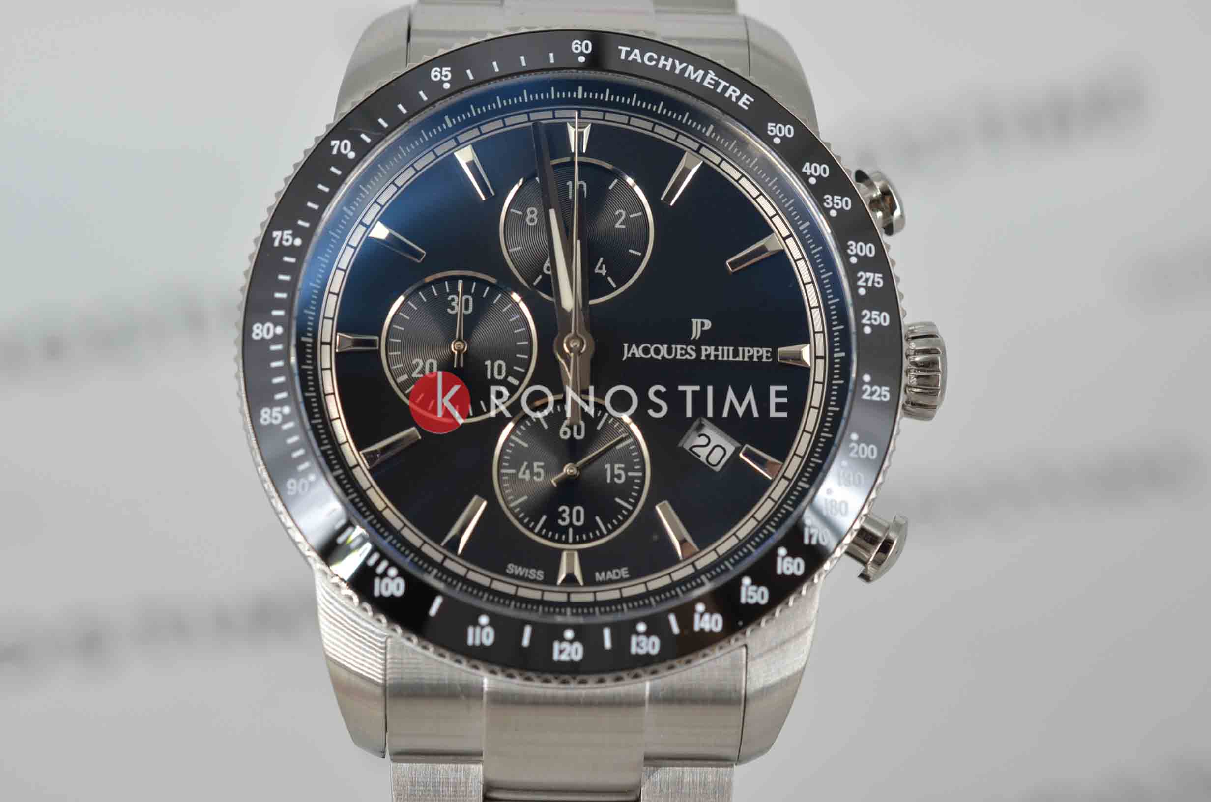 Швейцарские наручные часы Jacques Philippe JPQGC691316 сочетают в себе современный дизайн, надежность и функциональность, это стильные швейцарские часы с функцией хронографаХронографФункция позволяет измерять отрезки времени с особой точностью: часы, минуты, секунды. Верным признаком хронографа является наличие на циферблате 3 дополнительных окошек-счётчиков. и секундомераСекундомерСекундоме́р — прибор, способный измерять интервалы времени с точностью до долей секунды.. Корпус круглой формы диаметром 42 мм выполнен из прочной нержавеющей стали, а безельБезельВнешний ободок, закрепляющий стекло. В спортивных часах так называется поворотное кольцо с делениями на циферблате, выполняет роль таймера – замеряет отрезки времени на шкале. Неподвижный безель – элемент декора. Однонаправленно вращающийся безель на дайверских часах позволяет фиксировать моменты погружения и выныривания на поверхность. с элегантным черным IP-покрытиемIP-покрытиеМетод ионного напыления. Демонстрирует повышенную устойчивость к истиранию, окислению и химическим веществам. Под воздействием высокого давления и температуры около 1500°C молекулы металла надёжно соединяются с частицами корпуса часов.. Сапфировое стеклоСапфировое стеклоПрочный и надёжный материал из кристалла сапфира синтетического происхождения, характеризующийся особой твёрдостью и устойчивостью к царапинам и повреждениям. с антибликовым покрытиемАнтибликовое покрытиеСлой оксида металла в 0,13-0,3 микрон, благодаря которому стекло часов не бликует и не отражает свет. Антибликовое покрытие уменьшает отражение света в 10 раз, обеспечивая отличную читаемость показателей циферблата. надежно защищает черный циферблат от царапин и повреждений. Модель оснащена точным кварцевым механизмом, а также дополнительными функциями — тахиметромТахиметрРазмеченная шкала, располагается на ободке или безеле часов. Тахиметр позволяет рассчитать скорость на определённом участке пути, расстояние измеряется в километрах или милях. и индикатором даты, что делает часы не только стильным аксессуаром, но и практичным помощником на каждый день. Серебряный браслет шириной 22 мм удобно фиксируется на запястье с помощью застежки «бабочка»Застёжка "бабочка"Такой вид застёжки дополняется предохранителями, помогающими избежать случайного раскрытия браслета. Обладают изящным исполнением. . Стрелки имеют люминесцентное покрытиеЛюминесцентное покрытиеПозволяет считывать показания времени в темноте. Производители наносят на стрелки, часовые индексы, безель или поверхность циферблата светонакопительный состав, дающий холодное свечение. для удобства чтения времени в темноте. Водозащита 5 АТМ позволяет не снимать часы при дожде и случайных контактах с водой.