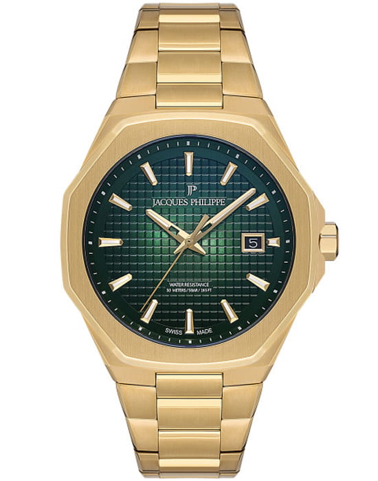 Швейцарские мужские часы Jacques Philippe Octagon JPQGS3823X4, кварцевый механизм с высокой точностью. Сапфировое стеклоСапфировое стеклоПрочный и надёжный материал из кристалла сапфира синтетического происхождения, характеризующийся особой твёрдостью и устойчивостью к царапинам и повреждениям. устойчивое к появлению царапин, обладающее высокой прозрачностью. Корпус часов изготовлен из нержавеющей стали с IP-покрытиемIP-покрытиеМетод ионного напыления. Демонстрирует повышенную устойчивость к истиранию, окислению и химическим веществам. Под воздействием высокого давления и температуры около 1500°C молекулы металла надёжно соединяются с частицами корпуса часов.. Стрелки и метки с люминесцентным покрытиемЛюминесцентное покрытиеПозволяет считывать показания времени в темноте. Производители наносят на стрелки, часовые индексы, безель или поверхность циферблата светонакопительный состав, дающий холодное свечение.. Окошко даты находится в положении 3 часов. Класс водозащиты: 50 метров, позволит защитить корпус от случайных брызг или капель дождя. Стальной браслет с IP-покрытиемIP-покрытиеМетод ионного напыления. Демонстрирует повышенную устойчивость к истиранию, окислению и химическим веществам. Под воздействием высокого давления и температуры около 1500°C молекулы металла надёжно соединяются с частицами корпуса часов. на застёжке «бабочка» с кнопкамиЗастёжка "бабочка"Такой вид застёжки дополняется предохранителями, помогающими избежать случайного раскрытия браслета. Обладают изящным исполнением. .