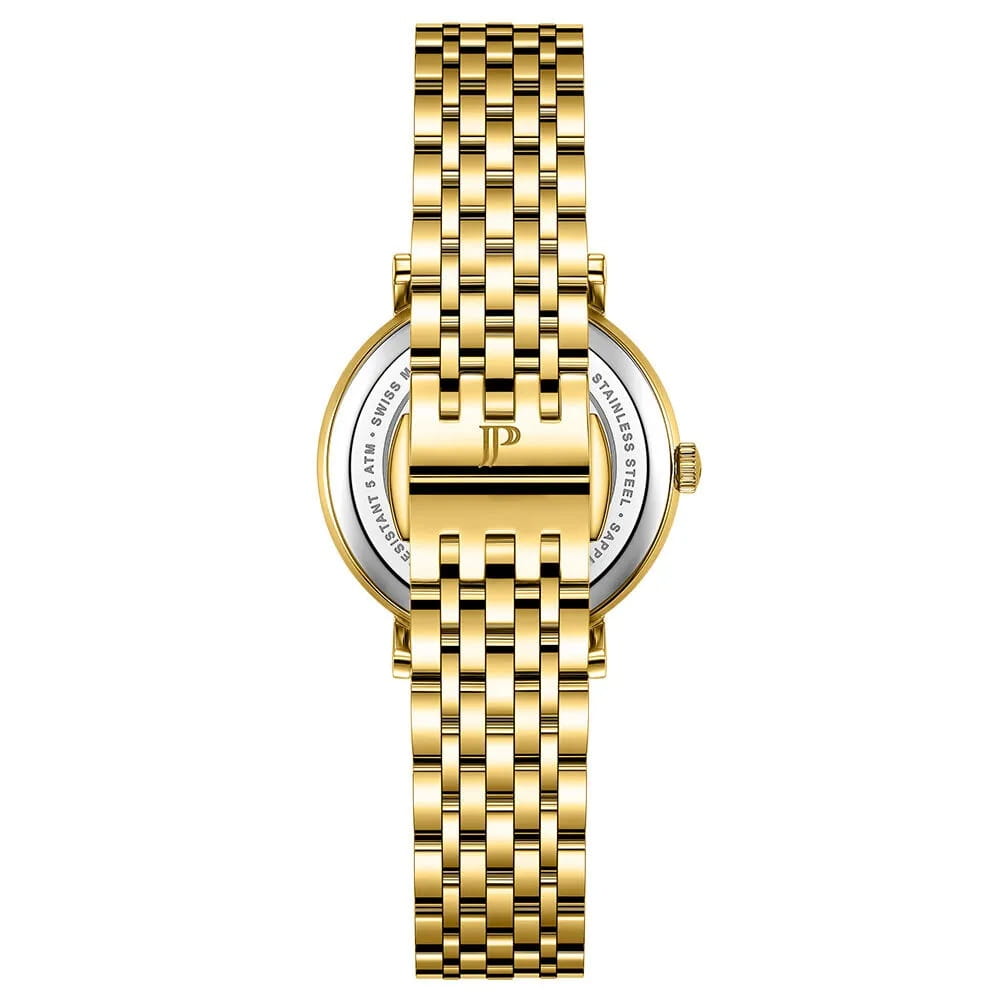 Швейцарские женские часы Jacques Philippe Ligata JPQLS942324 кварцевый механизм с высокой точностью. Прочное сапфировое стеклоСапфировое стеклоПрочный и надёжный материал из кристалла сапфира синтетического происхождения, характеризующийся особой твёрдостью и устойчивостью к царапинам и повреждениям. устойчивое к царапинам и механическим повреждениям. Циферблат серебристого цвета украшен классическими стрелками и метками, что гармонично дополняет общий дизайн модели. Элегантный корпус изготовлен из нержавеющей стали с IP-покрытиемIP-покрытиеМетод ионного напыления. Демонстрирует повышенную устойчивость к истиранию, окислению и химическим веществам. Под воздействием высокого давления и температуры около 1500°C молекулы металла надёжно соединяются с частицами корпуса часов. золотистого цвета, диаметром 29 мм, что делает их устойчивыми к внешним воздействиям и придает благородный вид. Стальной браслет с IP-покрытиемIP-покрытиеМетод ионного напыления. Демонстрирует повышенную устойчивость к истиранию, окислению и химическим веществам. Под воздействием высокого давления и температуры около 1500°C молекулы металла надёжно соединяются с частицами корпуса часов. на застёжке-бабочке с кнопкамиЗастёжка "бабочка"Такой вид застёжки дополняется предохранителями, помогающими избежать случайного раскрытия браслета. Обладают изящным исполнением. обеспечивает комфортное и безопасное ношение. Окошко даты находится в положении 3 часа. Класс водозащиты: 50 метров позволит защитить корпус от случайных брызг или капель дождя. Эти часы станут идеальным выбором для женщин, ценящих стиль, качество и функциональность и элегантность.