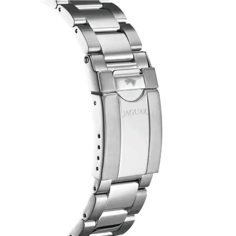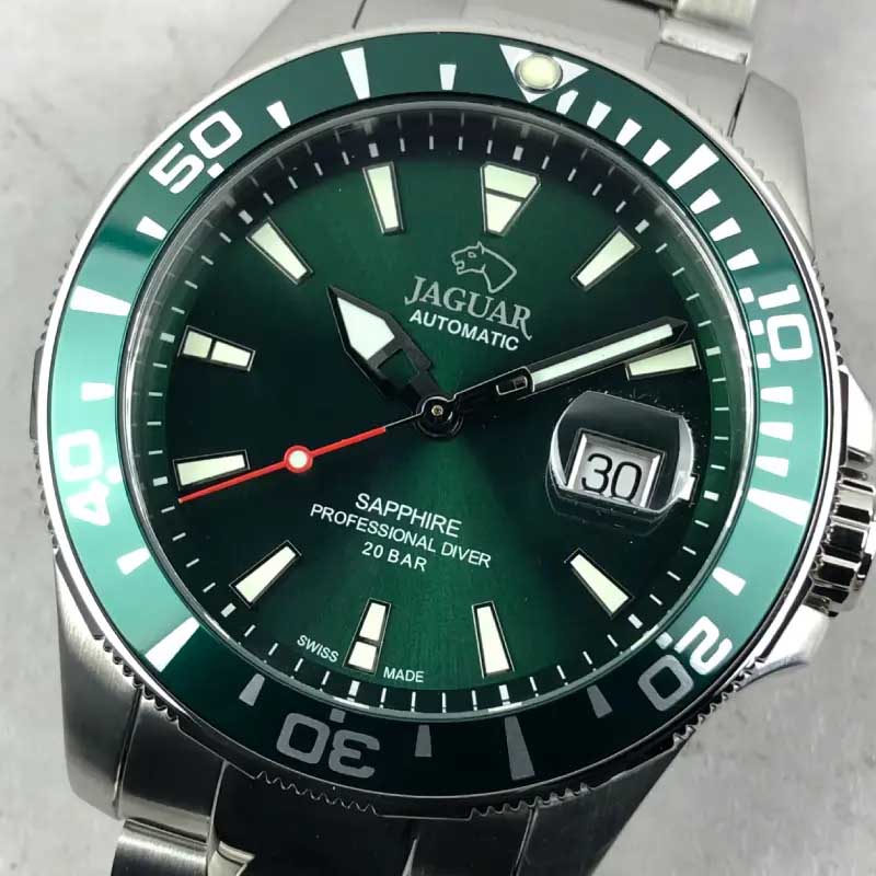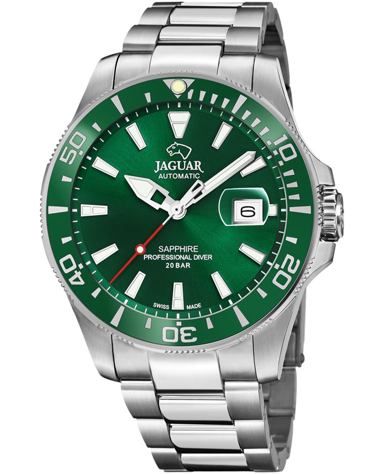 Мужские швейцарские часы Jaguar Automatic Diver J886/2. Автоматический швейцарский калибр ETA 2824-2. Сапфировое стеклоСапфировое стеклоПрочный и надёжный материал из кристалла сапфира синтетического происхождения, характеризующийся особой твёрдостью и устойчивостью к царапинам и повреждениям. устойчивое к мелким механическим повреждениям. Корпус и браслет часов изготовлены из нержавеющей стали. Стрелки и метки с люминесцентным покрытиемЛюминесцентное покрытиеПозволяет считывать показания времени в темноте. Производители наносят на стрелки, часовые индексы, безель или поверхность циферблата светонакопительный состав, дающий холодное свечение.. Окошко даты находится в положении 3 часа. Класс водозащиты: 200 метров, позволит плавать, нырять и заниматься другими водными видами спорта. Стальной браслет на раскладной застёжкеРаскладная застёжкаТакой тип застёжки используется только на браслетах из металла. Она никогда не раскрывается полностью, происходит разделение на 2 и более частей. Раскладывающая застёжка снизит вероятность потери часов к минимуму.. БезельБезельВнешний ободок, закрепляющий стекло. В спортивных часах так называется поворотное кольцо с делениями на циферблате, выполняет роль таймера – замеряет отрезки времени на шкале. Неподвижный безель – элемент декора. Однонаправленно вращающийся безель на дайверских часах позволяет фиксировать моменты погружения и выныривания на поверхность. с PVD-покрытиемPVDУльтратонкое покрытие наносится в технике вакуумного напыления, сочетает в себе нитрид титана особой прочности со слоем золота или оксида хрома. Несёт в себе декоративную или защитную функцию..