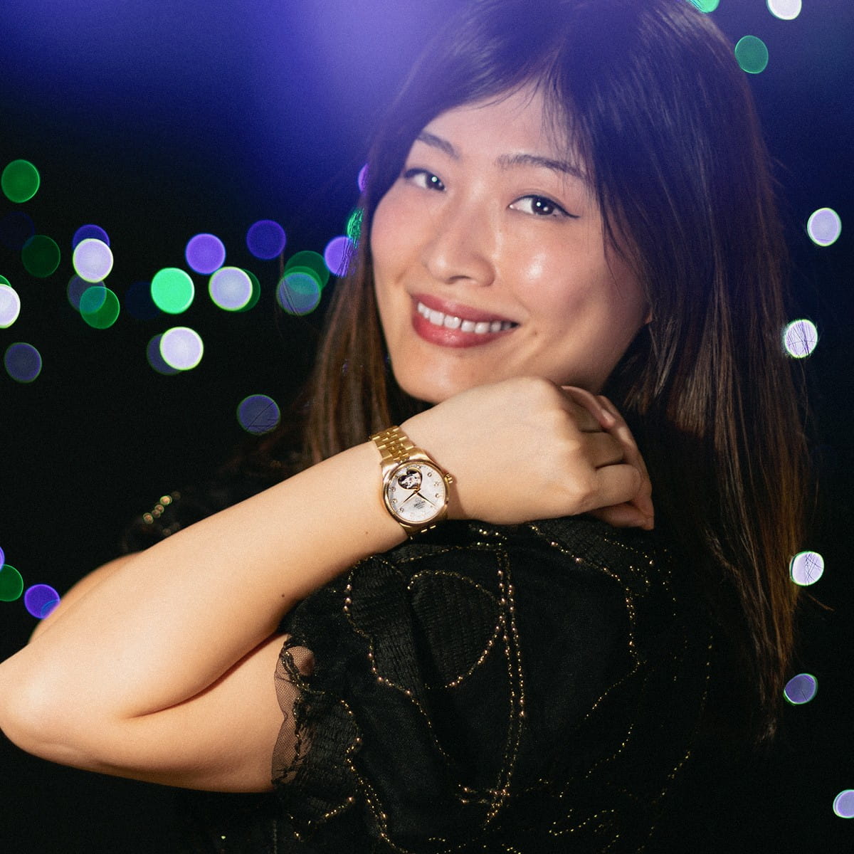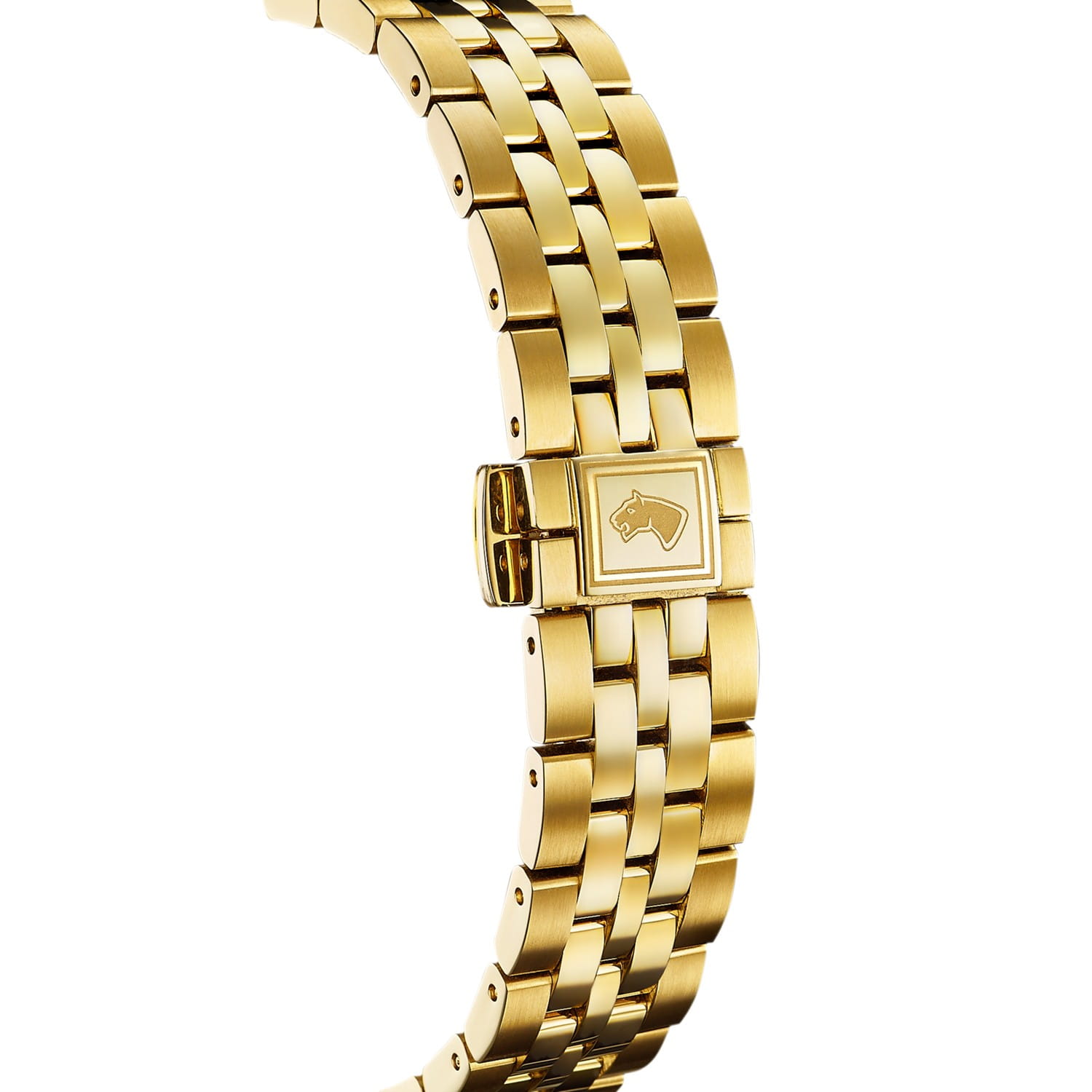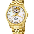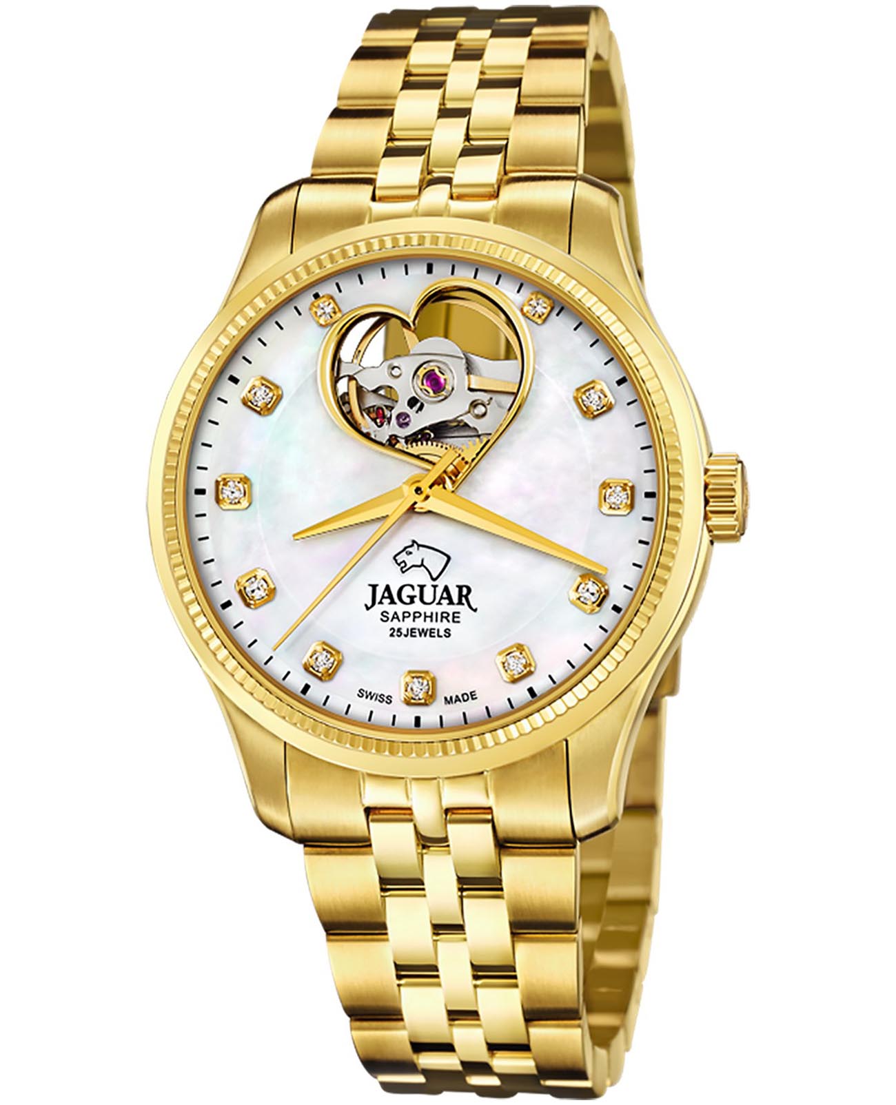 Женские швейцарские часы Jaguar Automatic Open Heart J996/1, механизм — автоподзавод. В часах с автоподзаводом заводная головка практически не используется, что исключает истирание ее материала и материала корпуса. Сапфировое стеклоСапфировое стеклоПрочный и надёжный материал из кристалла сапфира синтетического происхождения, характеризующийся особой твёрдостью и устойчивостью к царапинам и повреждениям. устойчивое к мелким механическим повреждениям. Корпус часов изготовлен из нержавеющей стали с PVD-покрытиемPVDУльтратонкое покрытие наносится в технике вакуумного напыления, сочетает в себе нитрид титана особой прочности со слоем золота или оксида хрома. Несёт в себе декоративную или защитную функцию.. Класс водозащиты: 50 метров, позволит защитить корпус от случайных брызг или капель дождя. Стальной браслет с PVD-покрытиемPVDУльтратонкое покрытие наносится в технике вакуумного напыления, сочетает в себе нитрид титана особой прочности со слоем золота или оксида хрома. Несёт в себе декоративную или защитную функцию. на застёжке-бабочке с кнопкамиЗастёжка "бабочка"Такой вид застёжки дополняется предохранителями, помогающими избежать случайного раскрытия браслета. Обладают изящным исполнением. . Циферблат украшен кристаллами в роли часовых индексов, крупная апертура в виде сердца, открывающая обзор на балансовое колесо механизма. БезельБезельВнешний ободок, закрепляющий стекло. В спортивных часах так называется поворотное кольцо с делениями на циферблате, выполняет роль таймера – замеряет отрезки времени на шкале. Неподвижный безель – элемент декора. Однонаправленно вращающийся безель на дайверских часах позволяет фиксировать моменты погружения и выныривания на поверхность. с PVD-покрытиемPVDУльтратонкое покрытие наносится в технике вакуумного напыления, сочетает в себе нитрид титана особой прочности со слоем золота или оксида хрома. Несёт в себе декоративную или защитную функцию..