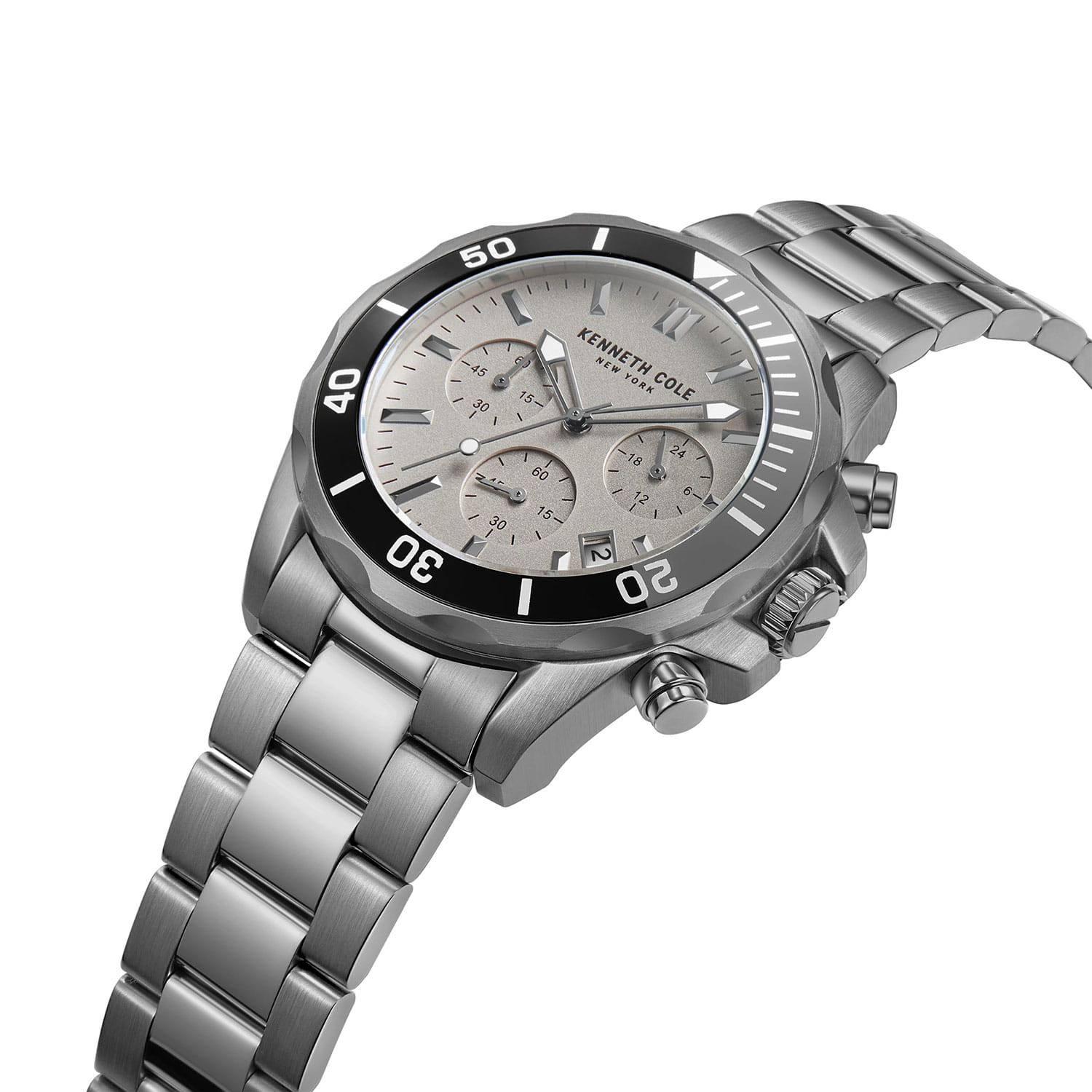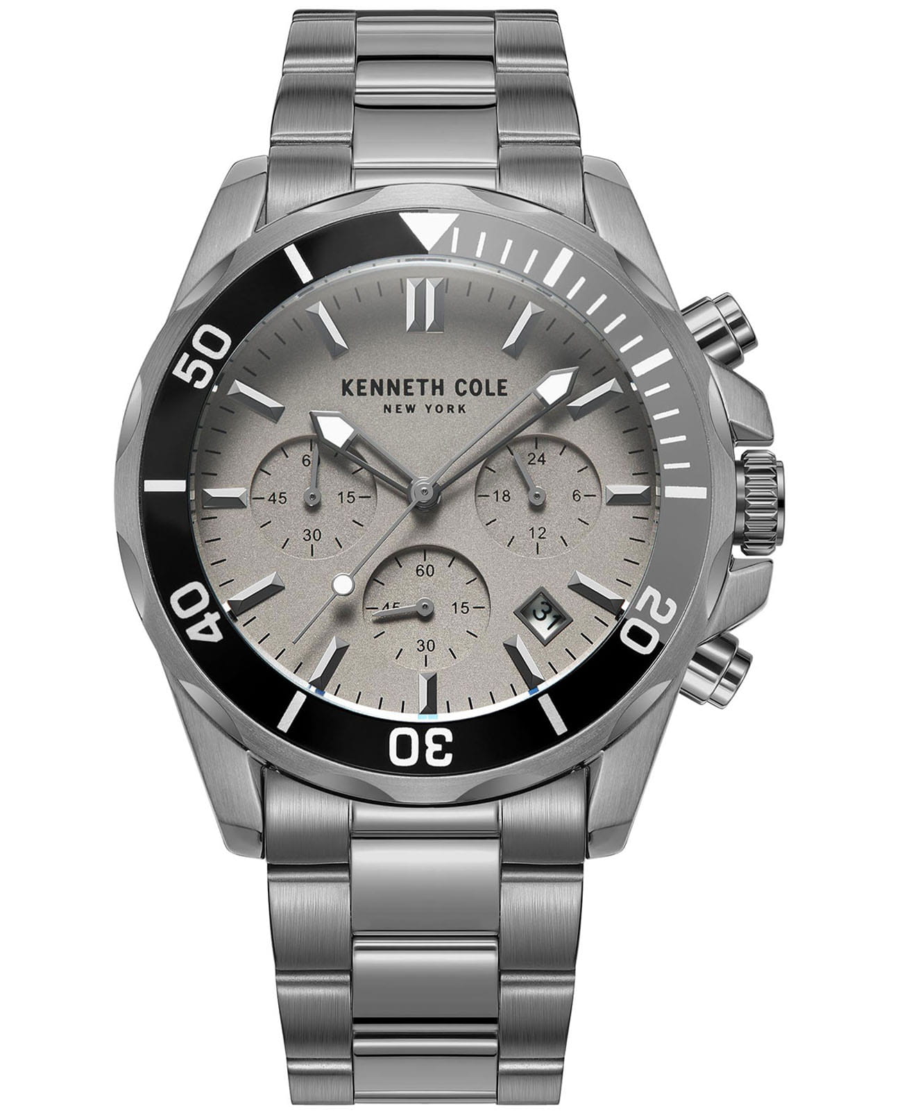 Мужские кварцевые часы-хронографХронографФункция позволяет измерять отрезки времени с особой точностью: часы, минуты, секунды. Верным признаком хронографа является наличие на циферблате 3 дополнительных окошек-счётчиков. с секундомеромСекундомерСекундоме́р — прибор, способный измерять интервалы времени с точностью до долей секунды. Kenneth Cole Dress Sport KCWGK2219002, кварцевый механизм с высокой точностью. Класс водозащиты: 30 метров, позволит защитить корпус от случайных брызг или капель дождя. Корпус часов изготовлен из стали. Стальной браслет на раскладной застёжкеРаскладная застёжкаТакой тип застёжки используется только на браслетах из металла. Она никогда не раскрывается полностью, происходит разделение на 2 и более частей. Раскладывающая застёжка снизит вероятность потери часов к минимуму.. Заводная головка с защитой. БезельБезельВнешний ободок, закрепляющий стекло. В спортивных часах так называется поворотное кольцо с делениями на циферблате, выполняет роль таймера – замеряет отрезки времени на шкале. Неподвижный безель – элемент декора. Однонаправленно вращающийся безель на дайверских часах позволяет фиксировать моменты погружения и выныривания на поверхность. с IP-покрытиемIP-покрытиеМетод ионного напыления. Демонстрирует повышенную устойчивость к истиранию, окислению и химическим веществам. Под воздействием высокого давления и температуры около 1500°C молекулы металла надёжно соединяются с частицами корпуса часов.. Окошко даты находится в положении между 4 и 5 часами. Стрелки и метки с люминесцентным покрытиемЛюминесцентное покрытиеПозволяет считывать показания времени в темноте. Производители наносят на стрелки, часовые индексы, безель или поверхность циферблата светонакопительный состав, дающий холодное свечение..