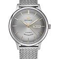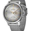 Российские мужские механические часы Космос K 043.10.33 с автоподзаводом оснащены корпусом из нержавеющей стали 316L диаметром 41 мм и защищены минеральным стекломМинеральное стеклоМинеральное стекло представляет собой искусственно выращенный минерал кварца. Такое стекло отличается особой устойчивостью к повреждениям и царапинам. Уступает по некоторым качествам сапфировому стеклу.. Дополнен функциями отображения даты и дня недели. Заводная головка декорирована логотипом бренда в виде стилизованного изображения планеты. Часы имеют водонепроницаемость 50 метров, позволит защитить корпус от случайных брызг или капель дождя. Модель комплектуется браслетом из нержавеющей стали 316L с миланским плетением на раскладном замкеРаскладной замокДанный вариант застежки используется только на часах с металлическим браслетом. Отличительная особенность такого крепления в том, что длина браслета становится универсальной и вы можете самостоятельно отрегулировать нужный вам размер – застежка просто двигается по браслету часов.. Специальные крепежи позволяют легко заменить браслет на часах самостоятельно. Прочный корпус и надежный механизм делают эти часы универсальным аксессуаром для повседневного использования. Уникальный дизайн и высокое качество материалов подчеркивают индивидуальность владельца.