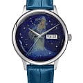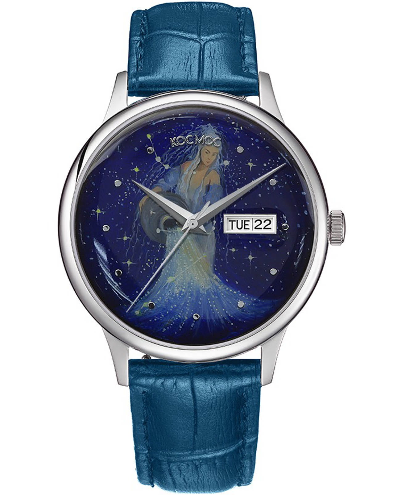 Мужские наручные часы Космос K 043.1 - Созвездие Водолей серебряный — это уникальная модель. В окружении созвездий Кита, Дельфина и Эридана, в области, которую часто именуют морем, находится одно из самых древних и крупных созвездий — Водолей. Древние греки связывали его появление на небосводе с началом сезона дождей, что и стало причиной появления символа, изображающего юношу, который поливает землю водой из кувшина. На циферблате часов кувшин держит изящная девушка, а форма созвездия Водолея представлена в виде рисунка из ярких звезд, соединенных тонкой линией, выполненной художником бренда. Для создания моделей серии Уникальные часы мастера использовали технику лаковой миниатюры. На основу наносится несколько слоев лака и краски, чередование которых создает объем и ощущение движения. Постепенно добавляются детали, а также серебряная или золотая фольга, на один сюжет требуется до 50 часов кропотливой работы. Процесс запекания миниатюры в специальной печи придаёт рисунку яркость и завершенность. Эти часы являются единственным экземпляром. В часах установлен механизм TMI с функцией автоподзавода. Они показывают часы, минуты и секунды, а также дату и день недели, индикатор которых с накладной рамкой расположен в положении «3 часа». За работой механизма можно наблюдать через прозрачную заднюю крышку. Минеральное стеклоМинеральное стеклоМинеральное стекло представляет собой искусственно выращенный минерал кварца. Такое стекло отличается особой устойчивостью к повреждениям и царапинам. Уступает по некоторым качествам сапфировому стеклу. изготовлено по технологии, характерной для 60-70-х годов прошлого века: оно выпуклое с обеих сторон. Ремешок выполнен из натуральной кожи синего цвета с аккуратной строчкой. Специальное крепление позволяет легко заменить ремешок на аналогичный или на стальной браслет миланского плетения.