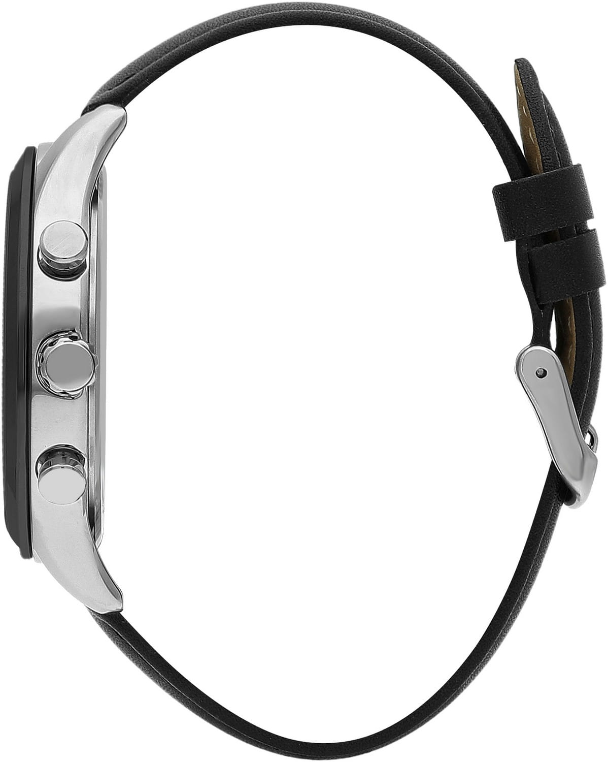Мужские наручные часы Lee Cooper LC07713.351 оснащены кварцевым механизмом, обеспечивающий высокую точность хода и надежность. Элегантный корпус часов выполнен из суперметалла серебристого цвета, что делает их устойчивыми к внешним воздействиям и придает благородный вид. Неподвижный безельБезельВнешний ободок, закрепляющий стекло. В спортивных часах так называется поворотное кольцо с делениями на циферблате, выполняет роль таймера – замеряет отрезки времени на шкале. Неподвижный безель – элемент декора. Однонаправленно вращающийся безель на дайверских часах позволяет фиксировать моменты погружения и выныривания на поверхность. с IP-покрытиемIP-покрытиеМетод ионного напыления. Демонстрирует повышенную устойчивость к истиранию, окислению и химическим веществам. Под воздействием высокого давления и температуры около 1500°C молекулы металла надёжно соединяются с частицами корпуса часов. черного цвета придает модели особый блеск.  Циферблат украшен классическими стрелками и метками с люминесцентным покрытиемЛюминесцентное покрытиеПозволяет считывать показания времени в темноте. Производители наносят на стрелки, часовые индексы, безель или поверхность циферблата светонакопительный состав, дающий холодное свечение., гармонично дополняющим общий дизайн модели. Для защиты циферблата используется минеральное стеклоМинеральное стеклоМинеральное стекло представляет собой искусственно выращенный минерал кварца. Такое стекло отличается особой устойчивостью к повреждениям и царапинам. Уступает по некоторым качествам сапфировому стеклу., устойчивое к царапинам и механическим повреждениям. Корпус диаметром 45 мм, что делает часы заметными и подходящими для любого образа. Кожаный ремешок на стандартной застёжке обеспечивает комфортное и безопасное ношение. Окошко даты находится в положении 4 часов. Часы обладают водонепроницаемостью до 50 метров (5 АТМ), что позволяет использовать их в повседневной жизни, включая контакт с водой при мытье рук или дожде. Эти часы станут идеальным выбором для мужчин, ценящих стиль, качество и функциональность.