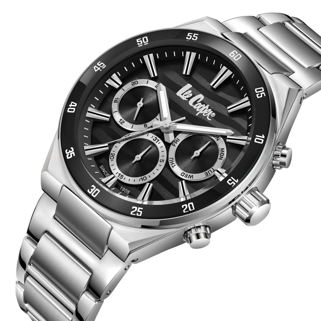 Мужские наручные часы Lee Cooper LC08175.350 оснащены кварцевым механизмом, обеспечивающий высокую точность хода и надежность. Элегантный корпус часов выполнен из суперметалла серебристого цвета, что делает их устойчивыми к внешним воздействиям и придает благородный вид. Циферблат украшен классическими стрелками с люминесцентным покрытиемЛюминесцентное покрытиеПозволяет считывать показания времени в темноте. Производители наносят на стрелки, часовые индексы, безель или поверхность циферблата светонакопительный состав, дающий холодное свечение., гармонично дополняющим общий дизайн модели. Для защиты циферблата используется минеральное стеклоМинеральное стеклоМинеральное стекло представляет собой искусственно выращенный минерал кварца. Такое стекло отличается особой устойчивостью к повреждениям и царапинам. Уступает по некоторым качествам сапфировому стеклу., устойчивое к царапинам и механическим повреждениям. Неподвижный безельБезельВнешний ободок, закрепляющий стекло. В спортивных часах так называется поворотное кольцо с делениями на циферблате, выполняет роль таймера – замеряет отрезки времени на шкале. Неподвижный безель – элемент декора. Однонаправленно вращающийся безель на дайверских часах позволяет фиксировать моменты погружения и выныривания на поверхность. с IP-покрытиемIP-покрытиеМетод ионного напыления. Демонстрирует повышенную устойчивость к истиранию, окислению и химическим веществам. Под воздействием высокого давления и температуры около 1500°C молекулы металла надёжно соединяются с частицами корпуса часов. черного цвета. Корпус имеет круглую форму диаметром 43 мм, что делает часы заметными и подходящими. Браслет из стали оснащен раскладной застёжкойРаскладная застёжкаТакой тип застёжки используется только на браслетах из металла. Она никогда не раскрывается полностью, происходит разделение на 2 и более частей. Раскладывающая застёжка снизит вероятность потери часов к минимуму., обеспечивающим комфортное и безопасное ношение. Вынесенный циферблат с 24-х часовым указателем времени, индикацией даты и дня недели. Часы обладают водонепроницаемостью до 50 метров (5 АТМ), что позволяет использовать их в повседневной жизни, включая контакт с водой при мытье рук или дожде. Эти часы станут идеальным выбором для мужчин, ценящих стиль, качество и функциональность.