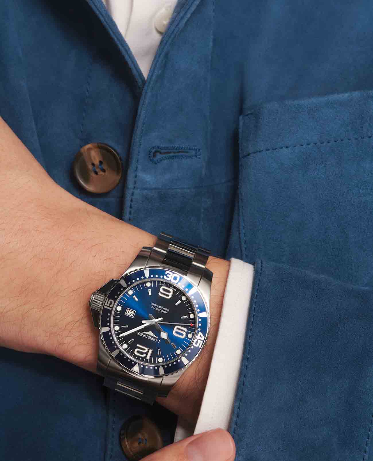 Мужские механические швейцарские часы с автоподзаводом Longines HydroConquest L3.841.4.96.6. Сапфировое стеклоСапфировое стеклоПрочный и надёжный материал из кристалла сапфира синтетического происхождения, характеризующийся особой твёрдостью и устойчивостью к царапинам и повреждениям. с антибликовым покрытием, устойчивое к мелким механическим повреждениям. Корпус часов изготовлен из нержавеющей стали. Вращающийся стальной безельБезельВнешний ободок, закрепляющий стекло. В спортивных часах так называется поворотное кольцо с делениями на циферблате, выполняет роль таймера – замеряет отрезки времени на шкале. Неподвижный безель – элемент декора. Однонаправленно вращающийся безель на дайверских часах позволяет фиксировать моменты погружения и выныривания на поверхность. с люминесцентным покрытиемЛюминесцентное покрытиеПозволяет считывать показания времени в темноте. Производители наносят на стрелки, часовые индексы, безель или поверхность циферблата светонакопительный состав, дающий холодное свечение. Superluminova из нержавеющей стали и керамики, защищенный от царапин, никогда не изнашивается и не выцветает. Стрелки и метки с люминесцентным покрытиемЛюминесцентное покрытиеПозволяет считывать показания времени в темноте. Производители наносят на стрелки, часовые индексы, безель или поверхность циферблата светонакопительный состав, дающий холодное свечение.. Окошко даты находится в положении 3 часа. Класс водозащиты: 300 метров, позволит плавать, нырять и заниматься другими водными видами спорта. Стальной браслет на раскладной застёжкеРаскладная застёжкаТакой тип застёжки используется только на браслетах из металла. Она никогда не раскрывается полностью, происходит разделение на 2 и более частей. Раскладывающая застёжка снизит вероятность потери часов к минимуму..