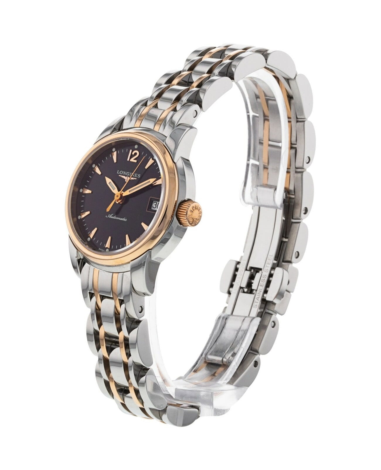 Женские швейцарские механические часы с автоподзаводом Longines Saint-Imier L2.263.5.52.7. Сапфировое стеклоСапфировое стеклоПрочный и надёжный материал из кристалла сапфира синтетического происхождения, характеризующийся особой твёрдостью и устойчивостью к царапинам и повреждениям. устойчивое к появлению царапин, обладающее высокой прозрачностью. Корпус часов изготовлен из нержавеющей стали. БезельБезельВнешний ободок, закрепляющий стекло. В спортивных часах так называется поворотное кольцо с делениями на циферблате, выполняет роль таймера – замеряет отрезки времени на шкале. Неподвижный безель – элемент декора. Однонаправленно вращающийся безель на дайверских часах позволяет фиксировать моменты погружения и выныривания на поверхность. с 18-каратным золотом18-каратное золотоОбозначение по каратной системе пробирования, оно показывает, сколько драгоценного металла содержится в изделии. 18 карат - в составе 75% чистого золота, соответствует 750 пробе.