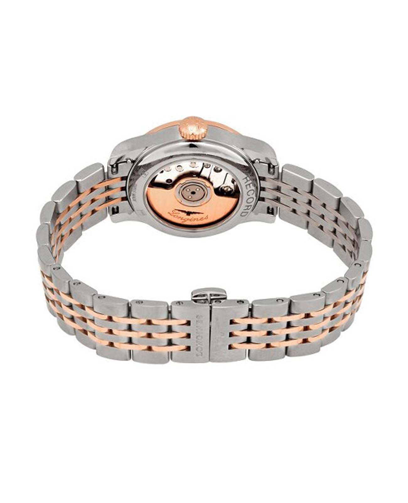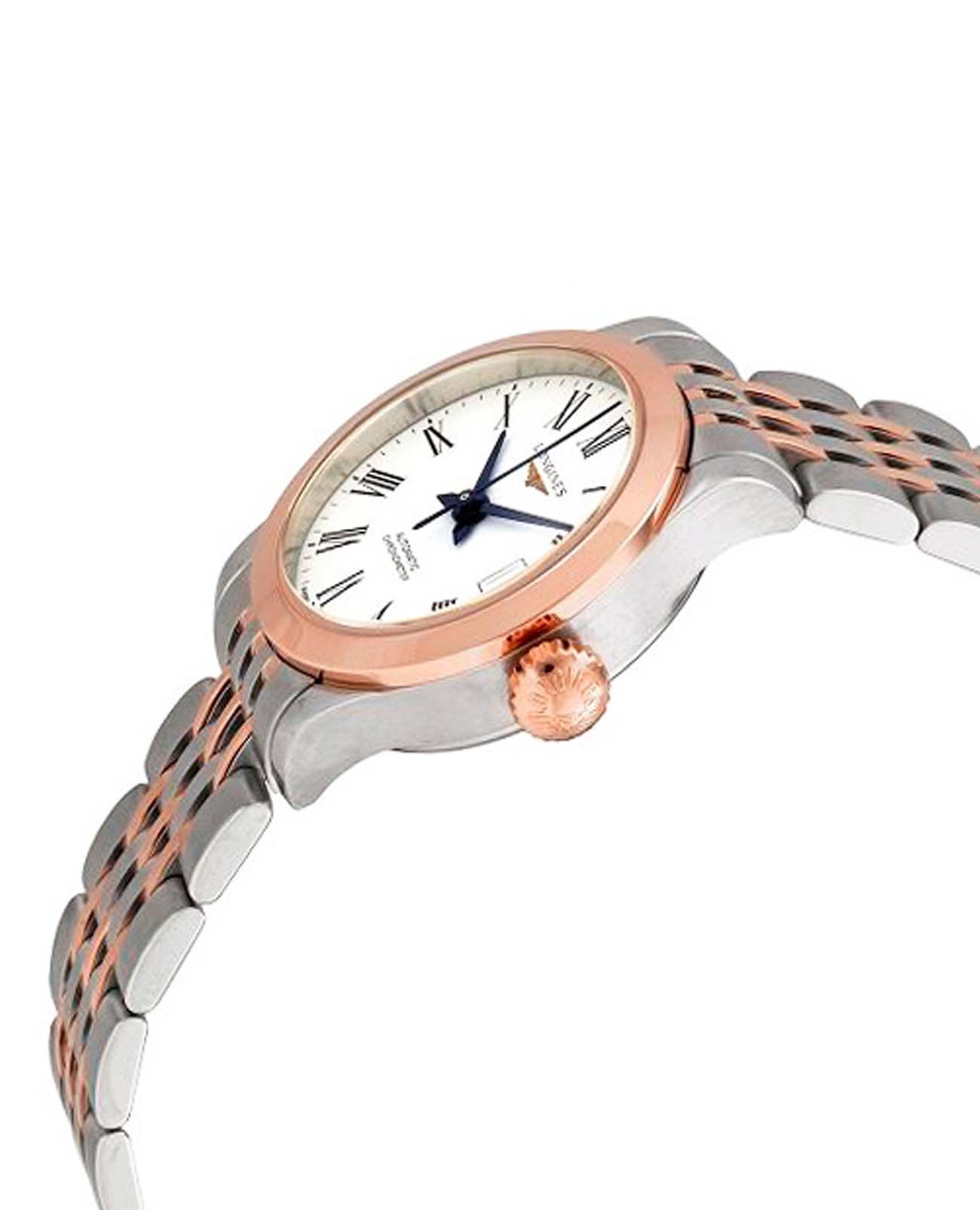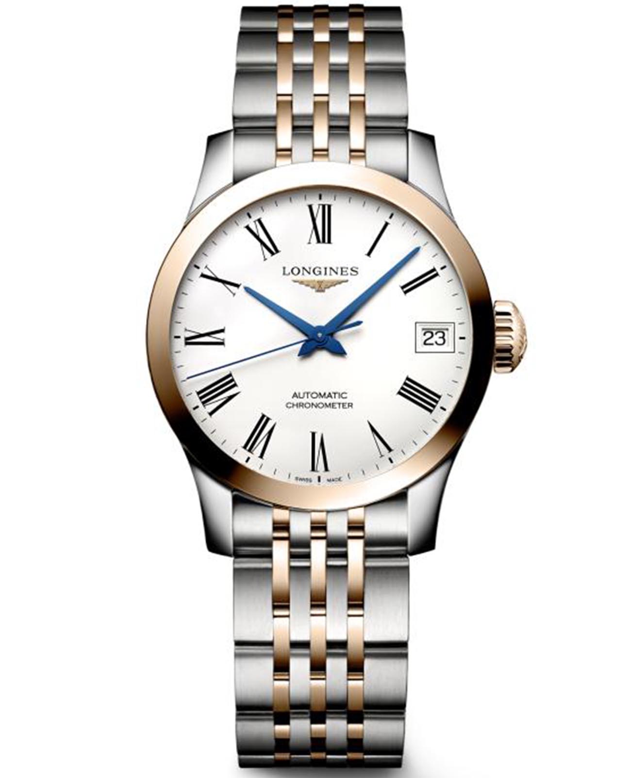 Женские швейцарские механические часы Longines Record Collection L2.320.5.11.7 – идеальное украшение образа. Швейцарский автоматический механизм L592.4 с резервом хода до 40 часов за высокую точность хода отмечен официальным сертификатом хронометра COSCСертификат COSCОфициальный сертификат, подтверждающий то, что часы ходят с особо высокой точностью. Для получения документа часы подвергаются тестовым испытаниям, разработанным швейцарским институтом тестирования хронометров COSC. Допустимая норма для механических часов -4/+6 секунд в день, для кварцевых моделей +/- 0,07 секунд в день.. Сапфировое стеклоСапфировое стеклоПрочный и надёжный материал из кристалла сапфира синтетического происхождения, характеризующийся особой твёрдостью и устойчивостью к царапинам и повреждениям. дополнено антибликовым покрытиемАнтибликовое покрытиеСлой оксида металла в 0,13-0,3 микрон, благодаря которому стекло часов не бликует и не отражает свет. Антибликовое покрытие уменьшает отражение света в 10 раз, обеспечивая отличную читаемость показателей циферблата.. Корпус изготовлен из стали. На метке 3 часов расположена апертура даты. Браслет выполнен из стали и частично 18-ти каратного розового золота18-каратное золотоОбозначение по каратной системе пробирования, оно показывает, сколько драгоценного металла содержится в изделии. 18 карат - в составе 75% чистого золота, соответствует 750 пробе.