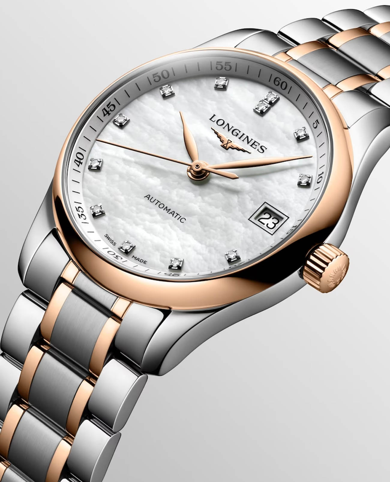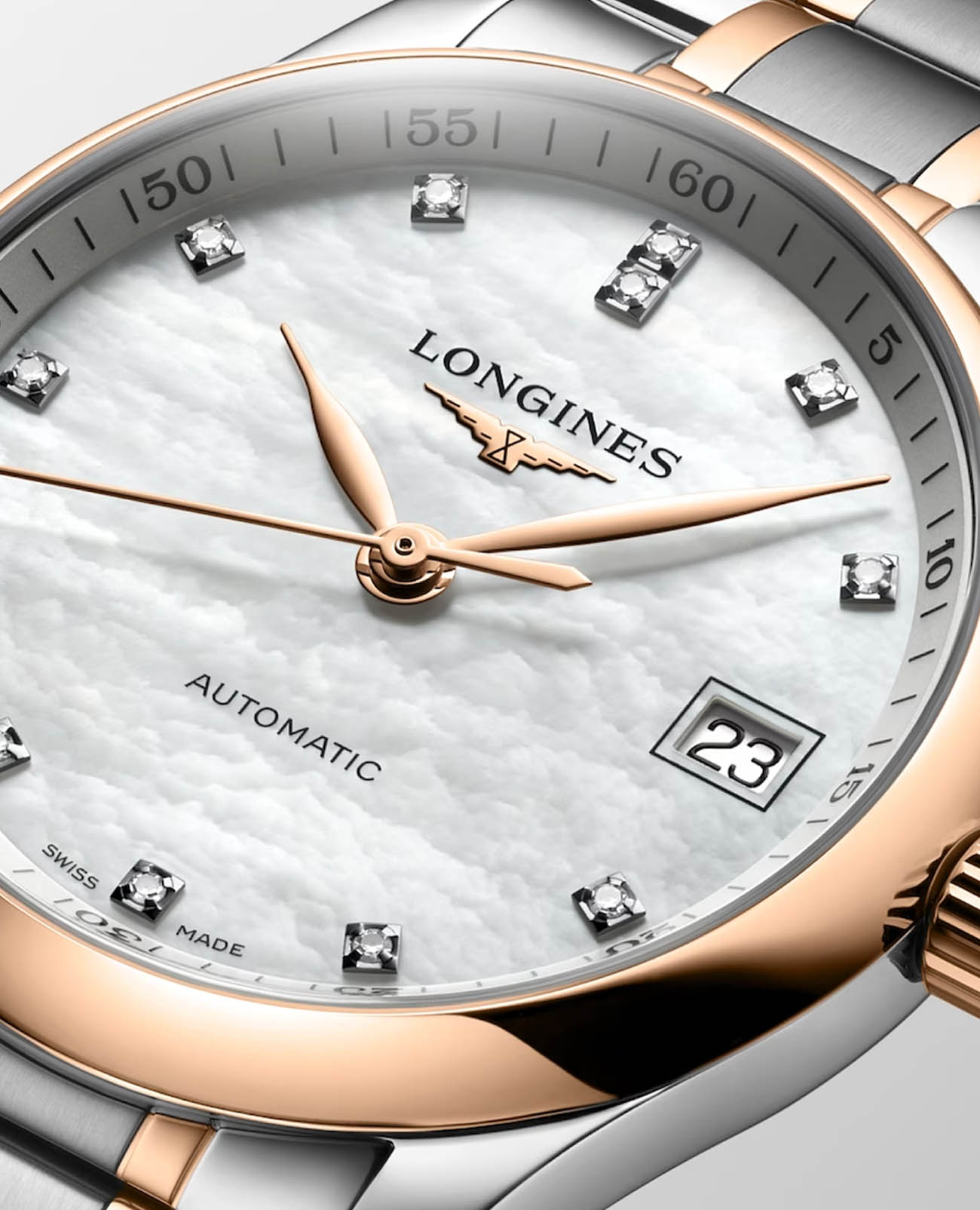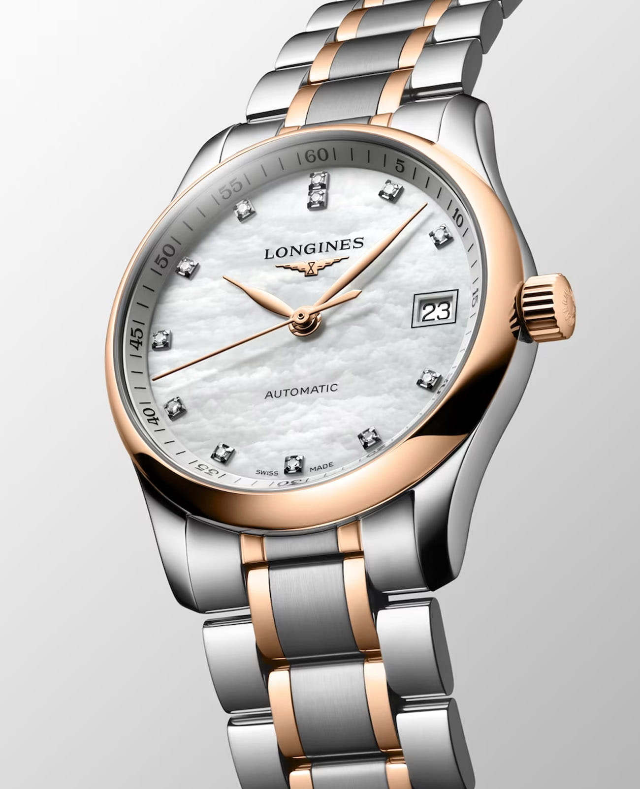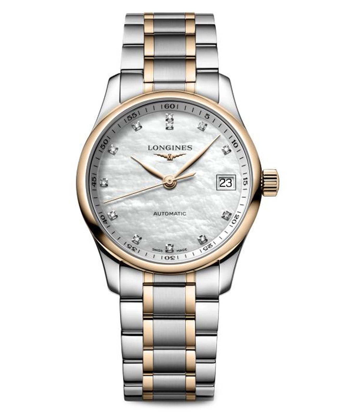 Женские швейцарские механические часы с автоподзаводом Longines Master Collection L2.357.5.89.7. Сапфировое стеклоСапфировое стеклоПрочный и надёжный материал из кристалла сапфира синтетического происхождения, характеризующийся особой твёрдостью и устойчивостью к царапинам и повреждениям. устойчивое к появлению царапин, обладающее высокой прозрачностью. Корпус часов изготовлен из нержавеющей стали. БезельБезельВнешний ободок, закрепляющий стекло. В спортивных часах так называется поворотное кольцо с делениями на циферблате, выполняет роль таймера – замеряет отрезки времени на шкале. Неподвижный безель – элемент декора. Однонаправленно вращающийся безель на дайверских часах позволяет фиксировать моменты погружения и выныривания на поверхность. с 18-каратным золотом18-каратное золотоОбозначение по каратной системе пробирования, оно показывает, сколько драгоценного металла содержится в изделии. 18 карат - в составе 75% чистого золота, соответствует 750 пробе.