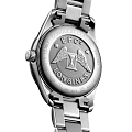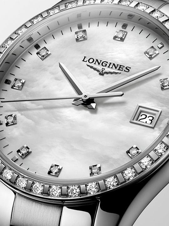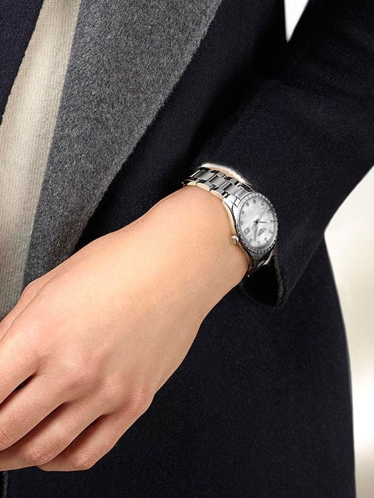 Изящная модель с белым перламутровым циферблатом инкрустирована 11 бриллиантами в 0,055 карата, на безелеБезельВнешний ободок, закрепляющий стекло. В спортивных часах так называется поворотное кольцо с делениями на циферблате, выполняет роль таймера – замеряет отрезки времени на шкале. Неподвижный безель – элемент декора. Однонаправленно вращающийся безель на дайверских часах позволяет фиксировать моменты погружения и выныривания на поверхность. – 34 бриллианта в 0,312 карата. Швейцарский кварцевый калибр L152 обеспечивает высокую точность хода. Сапфировое стекло имеет многослойную антибликовую обработкуАнтибликовое покрытиеСлой оксида металла в 0,13-0,3 микрон, благодаря которому стекло часов не бликует и не отражает свет. Антибликовое покрытие уменьшает отражение света в 10 раз, обеспечивая отличную читаемость показателей циферблата.. Наручные часы оснащены календарём, индикатором EOLEOLПредставляет собой систему, уведомляющую владельца часов о необходимости замены элемента питания. За 2 недели до полного разряда батарейки секундная стрелка перестаёт ходить чётко и начинает перепрыгивать на 3-4 деления..