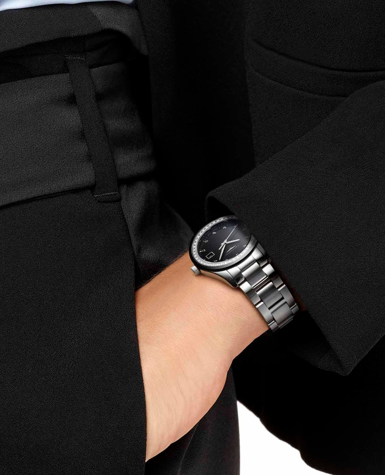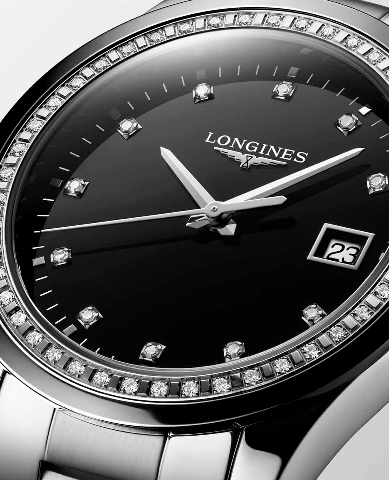 Женские швейцарские часы Longines Conquest Classic L2.387.0.57.6 отражают утончённый вкус владелицы. Изящная модель с белым перламутровым циферблатом инкрустирована 11 бриллиантами в 0,055 карата, на корпусе – 45 бриллиантами общим весом 0.306 карат. Швейцарский кварцевый калибр L152 обеспечивает высокую точность хода. Сапфировое стекло имеет многослойную антибликовую обработкуАнтибликовое покрытиеСлой оксида металла в 0,13-0,3 микрон, благодаря которому стекло часов не бликует и не отражает свет. Антибликовое покрытие уменьшает отражение света в 10 раз, обеспечивая отличную читаемость показателей циферблата.. Наручные часы оснащены календарём, индикатором EOLEOLПредставляет собой систему, уведомляющую владельца часов о необходимости замены элемента питания. За 2 недели до полного разряда батарейки секундная стрелка перестаёт ходить чётко и начинает перепрыгивать на 3-4 деления..