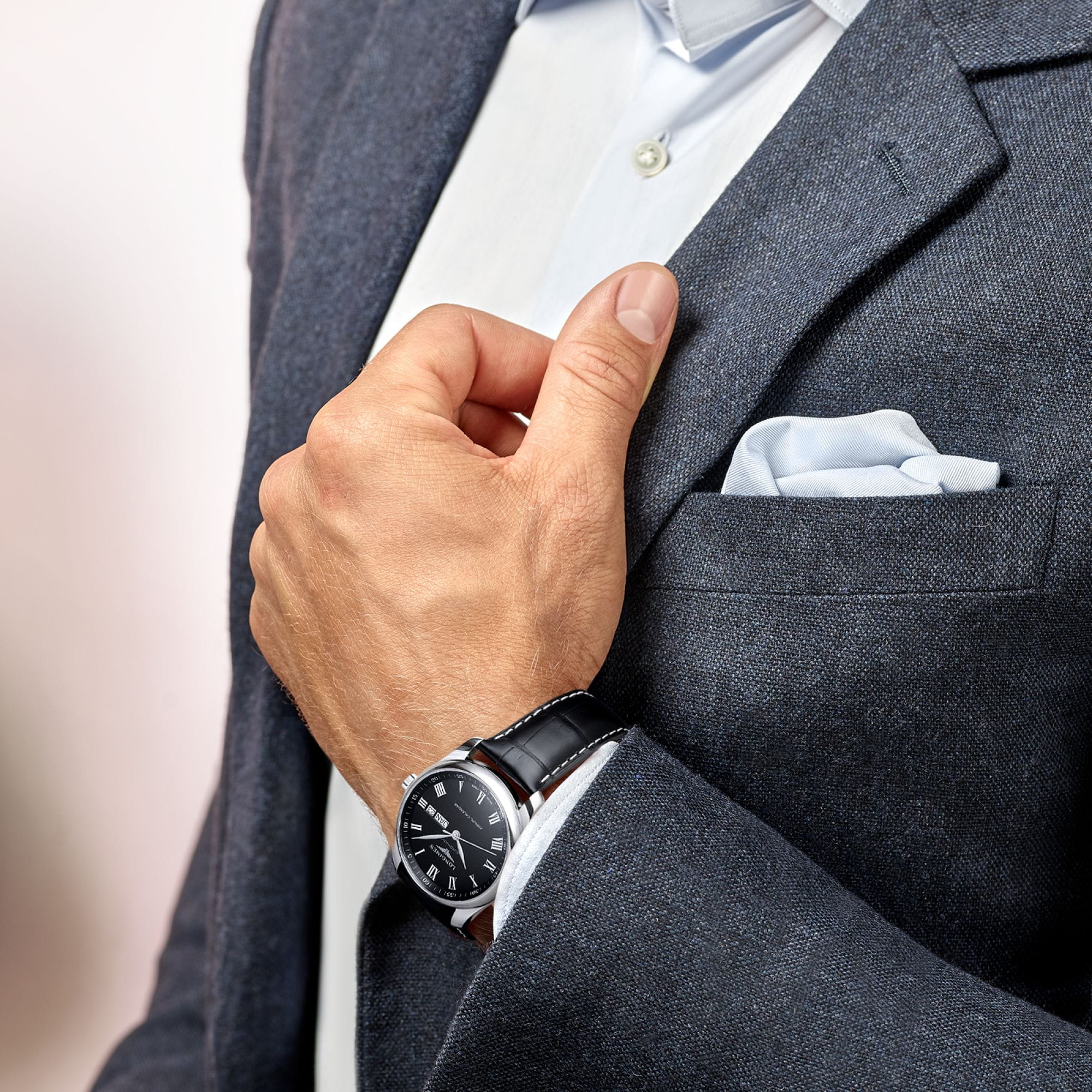 Римские цифры в сочетании с кожаным ремешком отражают элегантность. Внутри стального корпуса заключён швейцарский автоматический механизм L897, отличающийся 64-часовым запасом хода. Скелетонизированная задняя крышка с сапфировым стеклом позволяет отслеживать движение деталей и любоваться их отделкой. Годовой календарь включает указатели даты и дня недели.