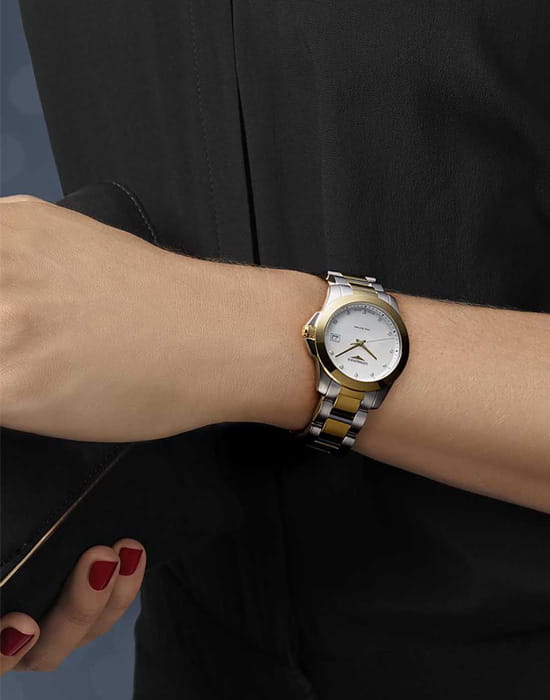 Корпус из нержавеющей стали с частичным PVD-покрытиемPVDУльтратонкое покрытие наносится в технике вакуумного напыления, сочетает в себе нитрид титана особой прочности со слоем золота или оксида хрома. Несёт в себе декоративную или защитную функцию. обеспечивает надежную защиту швейцарскому кварцевому механизму, известному своей исключительной точностью и стабильностью. с антибликовым покрытиемАнтибликовое покрытиеСлой оксида металла в 0,13-0,3 микрон, благодаря которому стекло часов не бликует и не отражает свет. Антибликовое покрытие уменьшает отражение света в 10 раз, обеспечивая отличную читаемость показателей циферблата. защищает циферблат от царапин и обеспечивает отличную видимость в любых условиях. Циферблат с 11 бриллиантами группы Top Wesselton VS-SI общим весом 0.036 карата