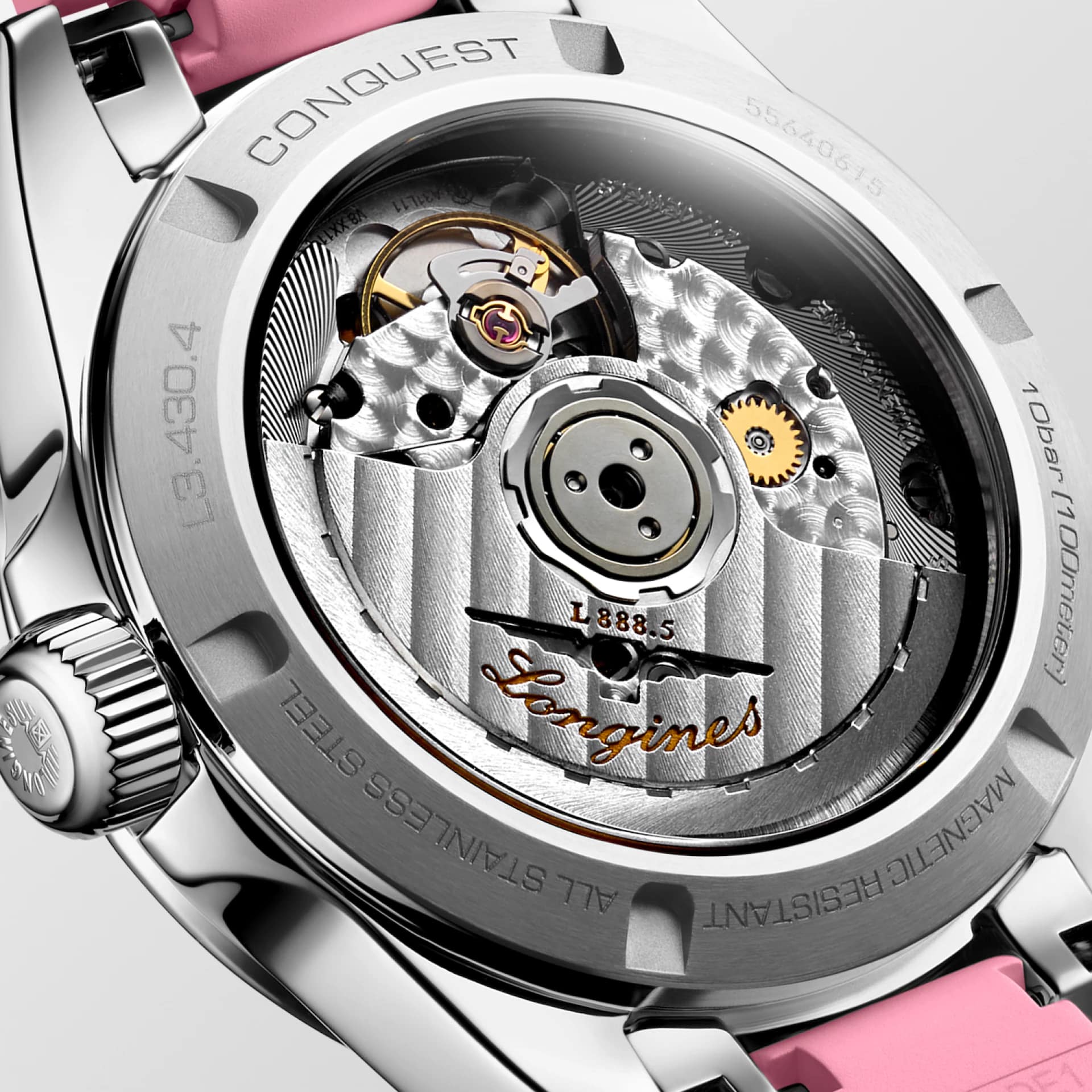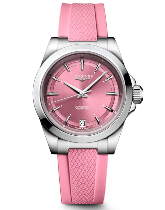 Женские швейцарские механические часы с автоподзаводом Longines Conquest L3.430.4.99.9. Сапфировое стеклоСапфировое стеклоПрочный и надёжный материал из кристалла сапфира синтетического происхождения, характеризующийся особой твёрдостью и устойчивостью к царапинам и повреждениям. устойчивое к появлению царапин, обладающее высокой прозрачностью. Корпус часов изготовлен из нержавеющей стали. Циферблат выполнен по технологии Sunray (солнечные лучи). Стрелки с люминесцентным покрытиемЛюминесцентное покрытиеПозволяет считывать показания времени в темноте. Производители наносят на стрелки, часовые индексы, безель или поверхность циферблата светонакопительный состав, дающий холодное свечение.. Окошко даты в положении 6 часов. Прозрачная задняя крышка. Класс водозащиты: 100 метров, позволит плавать, нырять и заниматься другими водными видами спорта. Браслет из каучука на раскладной застёжкеРаскладная застёжкаТакой тип застёжки используется только на браслетах из металла. Она никогда не раскрывается полностью, происходит разделение на 2 и более частей. Раскладывающая застёжка снизит вероятность потери часов к минимуму..