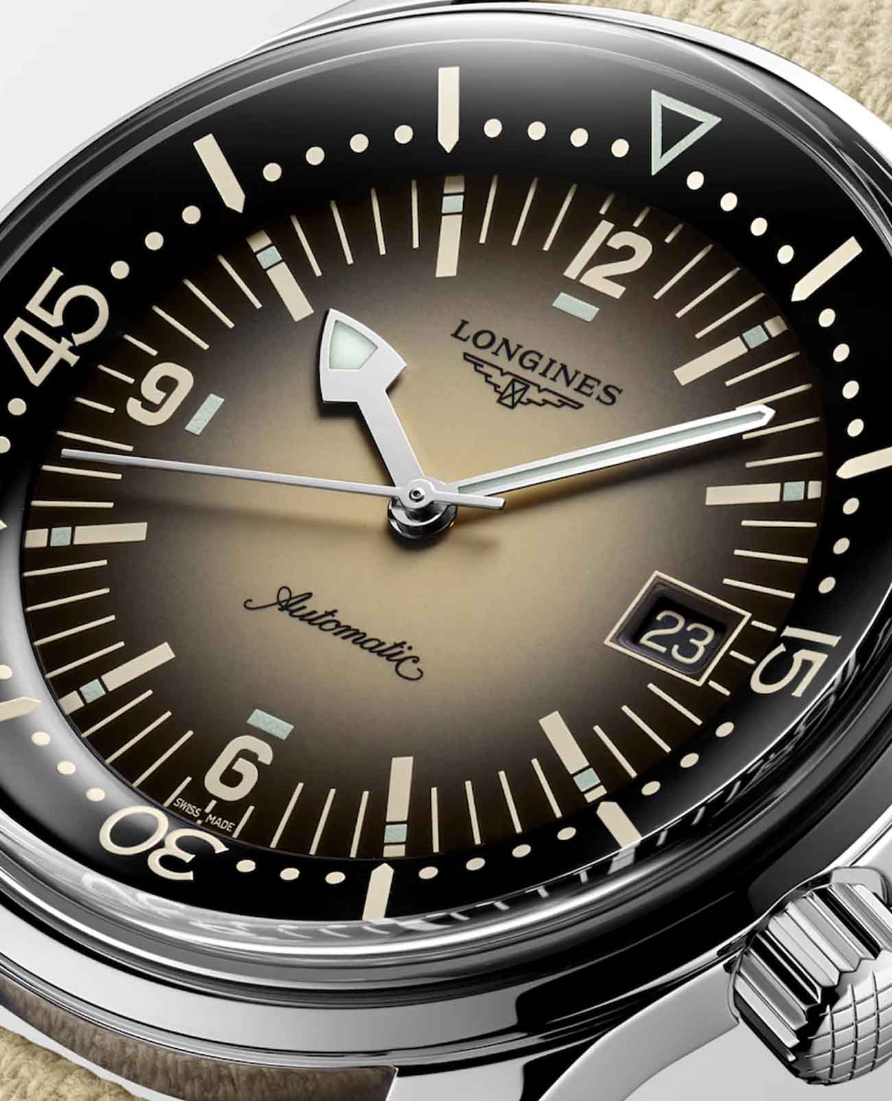 Мужские швейцарские механические часы с автоподзаводом Longines Legend Diver Watch L3.774.4.30.2. Сапфировое стеклоСапфировое стеклоПрочный и надёжный материал из кристалла сапфира синтетического происхождения, характеризующийся особой твёрдостью и устойчивостью к царапинам и повреждениям. устойчивое к появлению царапин, обладающее высокой прозрачностью. Корпус часов из нержавеющей стали. Стрелки и метки с люминесцентным покрытиемЛюминесцентное покрытиеПозволяет считывать показания времени в темноте. Производители наносят на стрелки, часовые индексы, безель или поверхность циферблата светонакопительный состав, дающий холодное свечение.. Нарисованные арабские цифры и метки. Окошко даты в положении 3 часов. Класс водозащиты: 300 метров, позволит плавать, нырять и заниматься другими водными видами спорта. Тканевый ремешок на стандартной застежке. Вращающийся стальной безельБезельВнешний ободок, закрепляющий стекло. В спортивных часах так называется поворотное кольцо с делениями на циферблате, выполняет роль таймера – замеряет отрезки времени на шкале. Неподвижный безель – элемент декора. Однонаправленно вращающийся безель на дайверских часах позволяет фиксировать моменты погружения и выныривания на поверхность..