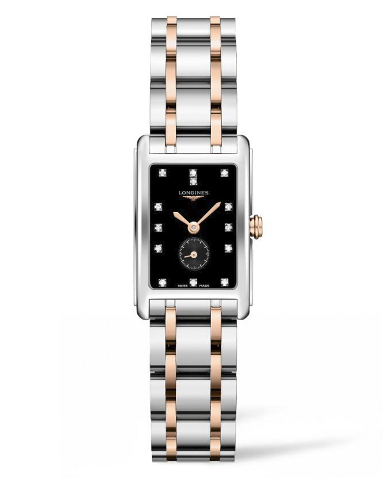 Женские швейцарские часы Longines DolceVita L5.255.5.57.7, кварцевый механизм с высокой точностью. Сапфировое стеклоСапфировое стеклоПрочный и надёжный материал из кристалла сапфира синтетического происхождения, характеризующийся особой твёрдостью и устойчивостью к царапинам и повреждениям. устойчивое к появлению царапин, обладающее высокой прозрачностью. Корпус часов изготовлен из стали. Циферблат украшают 13 бриллиантов 0,06 карат. Малая секундная стрелка в положении 6 часов. Класс водозащиты: 30 метров, позволит защитить корпус от случайных брызг или капель дождя. Браслет из нержавеющей стали и с 18-каратным золотом18-каратное золотоОбозначение по каратной системе пробирования, оно показывает, сколько драгоценного металла содержится в изделии. 18 карат - в составе 75% чистого золота, соответствует 750 пробе.