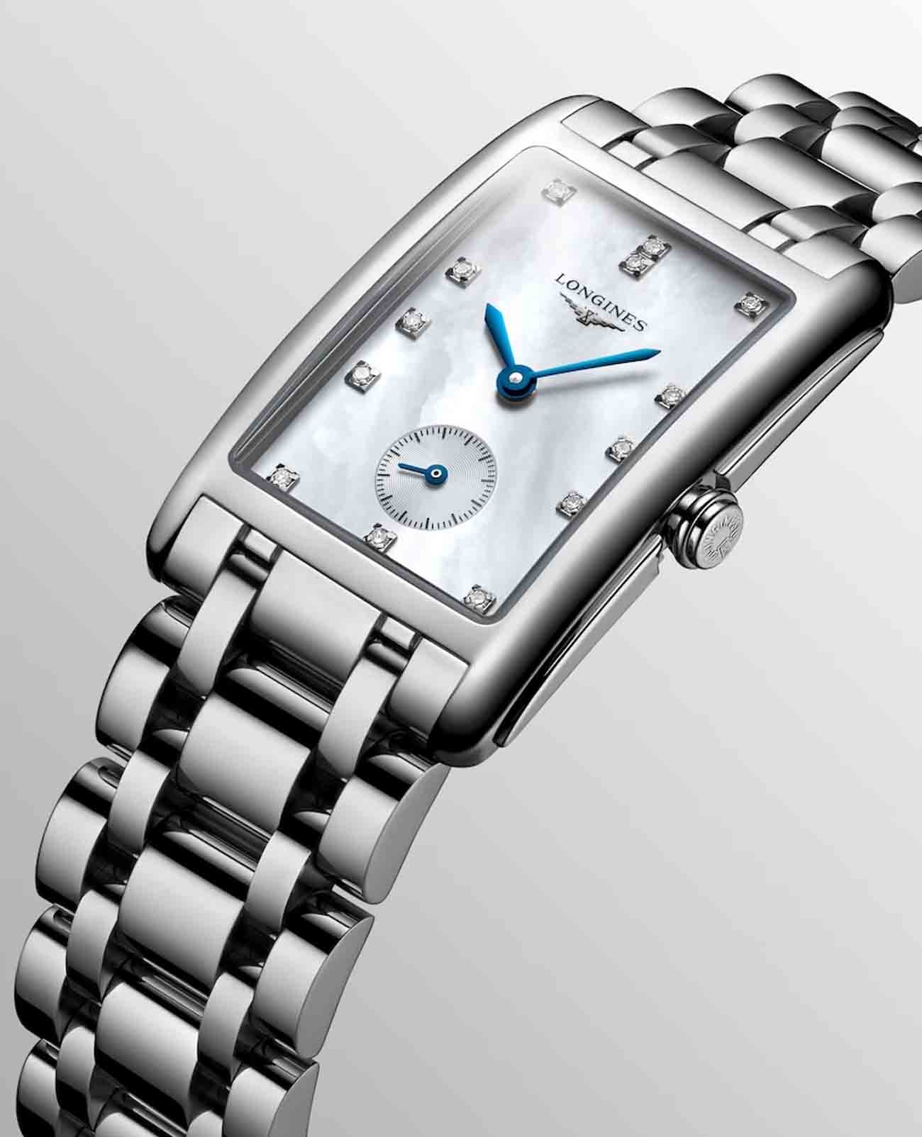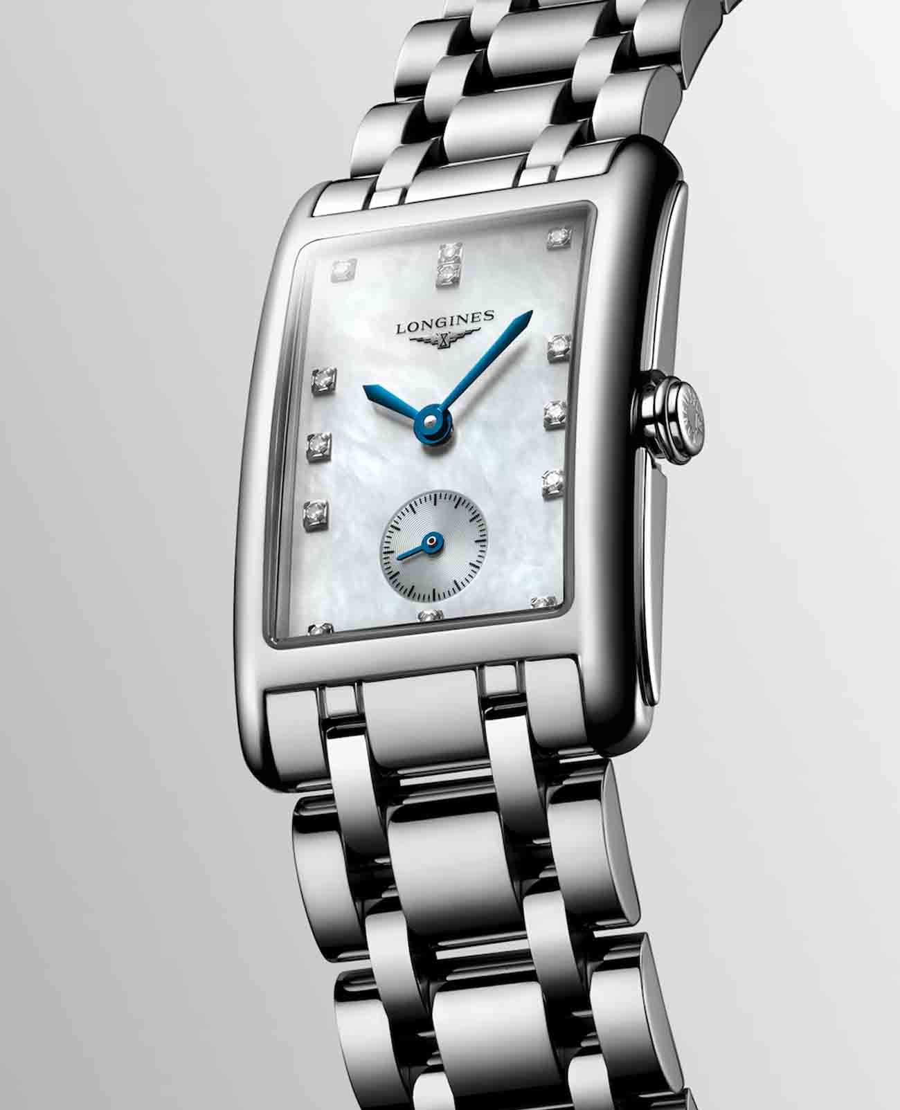 Женские швейцарские часы Longines DolceVita L5.512.4.87.6, кварцевый механизм с высокой точностью. Сапфировое стеклоСапфировое стеклоПрочный и надёжный материал из кристалла сапфира синтетического происхождения, характеризующийся особой твёрдостью и устойчивостью к царапинам и повреждениям. устойчивое к появлению царапин, обладающее высокой прозрачностью. Корпус часов изготовлен из стали. Циферблат украшают 13 бриллиантов 0,06 карат. Малая секундная стрелка в положении 6 часов. Класс водозащиты: 30 метров, позволит защитить корпус от случайных брызг или капель дождя. Браслет из нержавеющей стали на застёжке «бабочка» с кнопкамиЗастёжка "бабочка"Такой вид застёжки дополняется предохранителями, помогающими избежать случайного раскрытия браслета. Обладают изящным исполнением. .