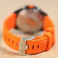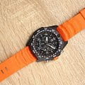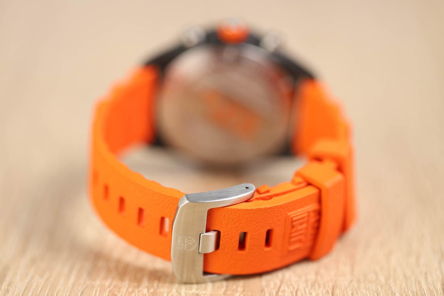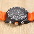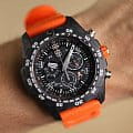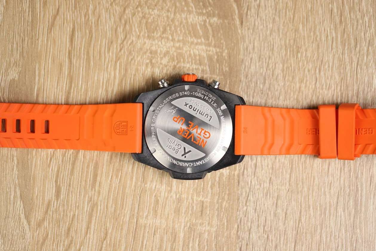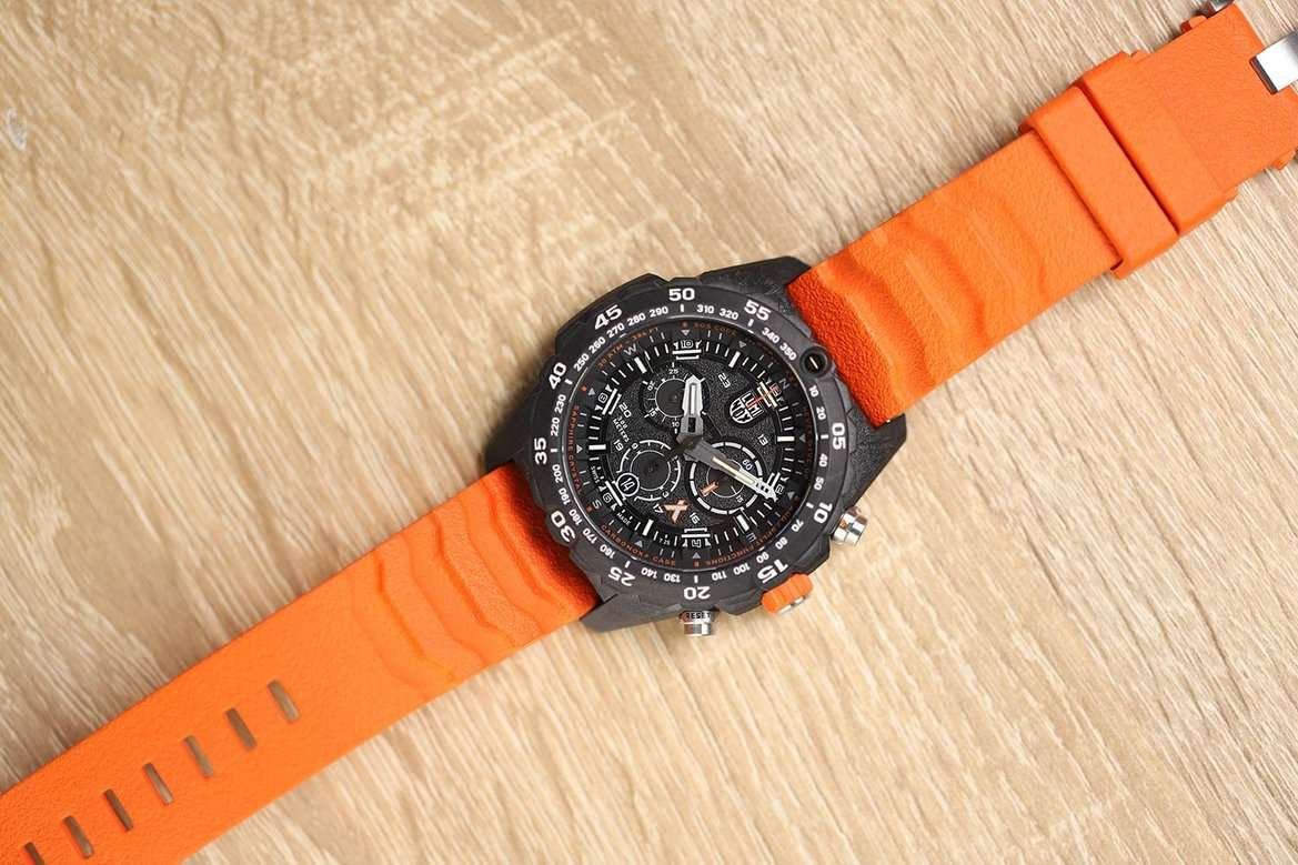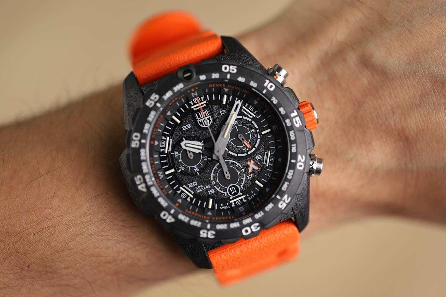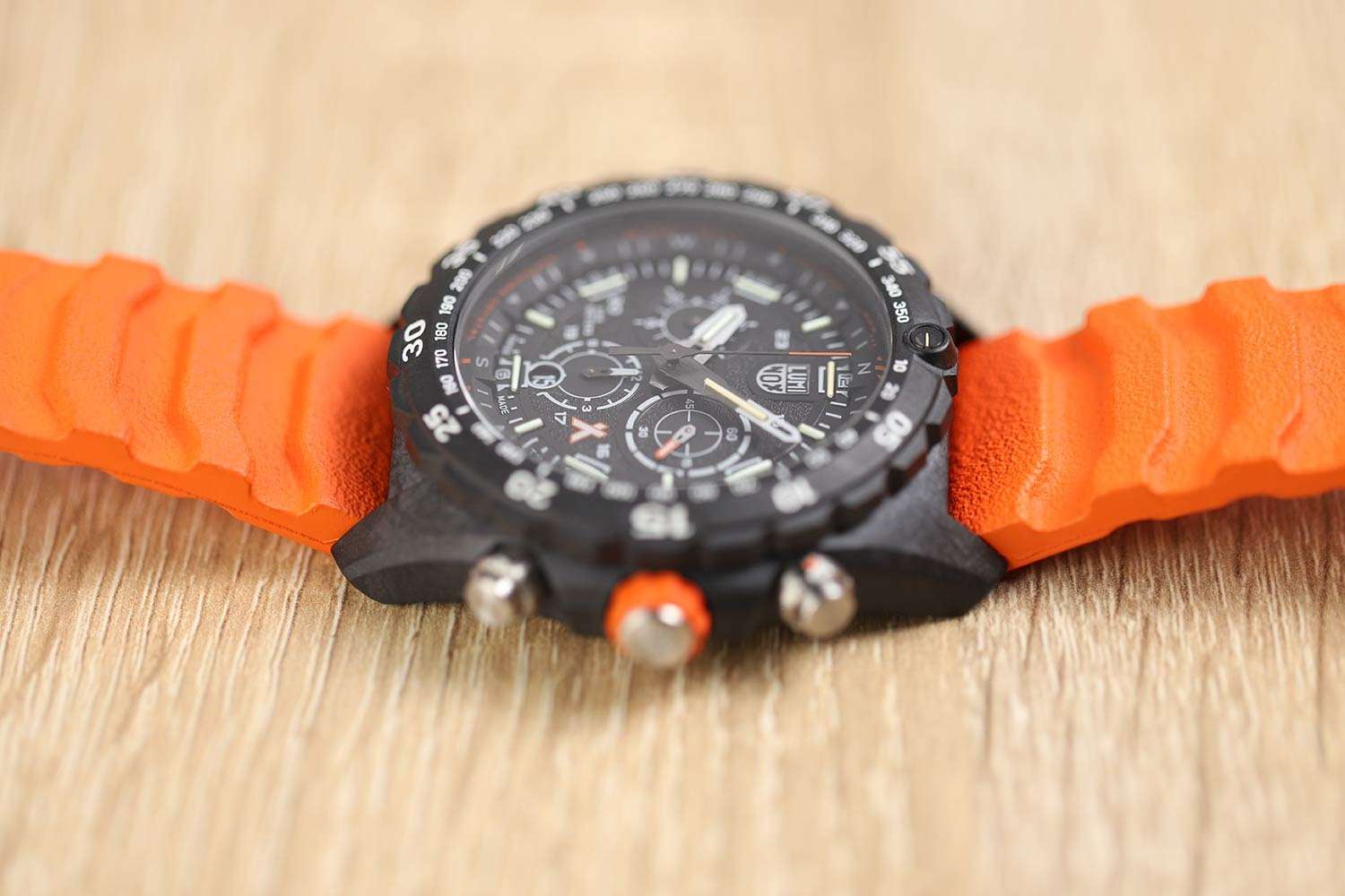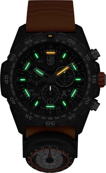 Мужские наручные часы-хронографХронографФункция позволяет измерять отрезки времени с особой точностью: часы, минуты, секунды. Верным признаком хронографа является наличие на циферблате 3 дополнительных окошек-счётчиков. Luminox Bear Grylls Survival Series XB.3749 разработаны для любителей активного образа жизни и экстремальных условий. Эти часы созданы в сотрудничестве с Беаром Гриллсом, известным путешественником и специалистом по выживанию в экстремальных условиях. Модель оборудована кварцевым механизмом Ronda 5030.D, предоставляющим надежность и точность показаний. Корпус, выполненный из пластика, усиленного карбоном, обеспечивает легкость и прочность, а черный циферблат защищен сапфировым стекломСапфировое стеклоПрочный и надёжный материал из кристалла сапфира синтетического происхождения, характеризующийся особой твёрдостью и устойчивостью к царапинам и повреждениям. с антибликовым покрытиемАнтибликовое покрытиеСлой оксида металла в 0,13-0,3 микрон, благодаря которому стекло часов не бликует и не отражает свет. Антибликовое покрытие уменьшает отражение света в 10 раз, обеспечивая отличную читаемость показателей циферблата.. Часы обладают функцией хронографаХронографФункция позволяет измерять отрезки времени с особой точностью: часы, минуты, секунды. Верным признаком хронографа является наличие на циферблате 3 дополнительных окошек-счётчиков. с секундомеромСекундомерСекундоме́р — прибор, способный измерять интервалы времени с точностью до долей секунды., позволяющим измерять короткие промежутки времени, а также показывают время в 12-ти и 24-х часовом формате. Счетчик регистрирует секунды, минуты и часы, а центральная секундная стрелка используется как секундная стрелка секундомера. Специальная технология LLTLLTLLT — это автономный механизм подсветки, основанный на использовании микроскопических газонаполненных элементов. Специальные герметичные капсулы из боросиликатного стекла, интегрированные в циферблат, генерируют свечение без необходимости подключения к внешним источникам энергии. Для их работы не требуется ни дополнительный свет, ни механическое воздействие (например, нажатие кнопки). Свечение возникает благодаря химическому процессу: реакция между тритием, заключенным в капсулах, и люминофорным покрытием создает стабильное автономное освещение. Технология обеспечивает энергетическую независимость и долговечность подсветки. обеспечивает непревзойденную ночную видимость на протяжении 25 лет. Водозащита уровня 300WR позволяет использовать часы в условиях высокой влажности и при погружениях. Окошко даты расположено в позиции 6 часов, а вращающийся в одном направлении безельБезельВнешний ободок, закрепляющий стекло. В спортивных часах так называется поворотное кольцо с делениями на циферблате, выполняет роль таймера – замеряет отрезки времени на шкале. Неподвижный безель – элемент декора. Однонаправленно вращающийся безель на дайверских часах позволяет фиксировать моменты погружения и выныривания на поверхность. имеет светящуюся метку на 12 часов. Завинчивающаяся заводная головка с защитой и оранжевым прорезиненным кольцом обеспечивает надежное сцепление, что особенно важно для подводных работ. На завинчивающейся стальной задней крышке выгравированы надпись «Never Give Up» и автограф Беара Гриллса, что под
