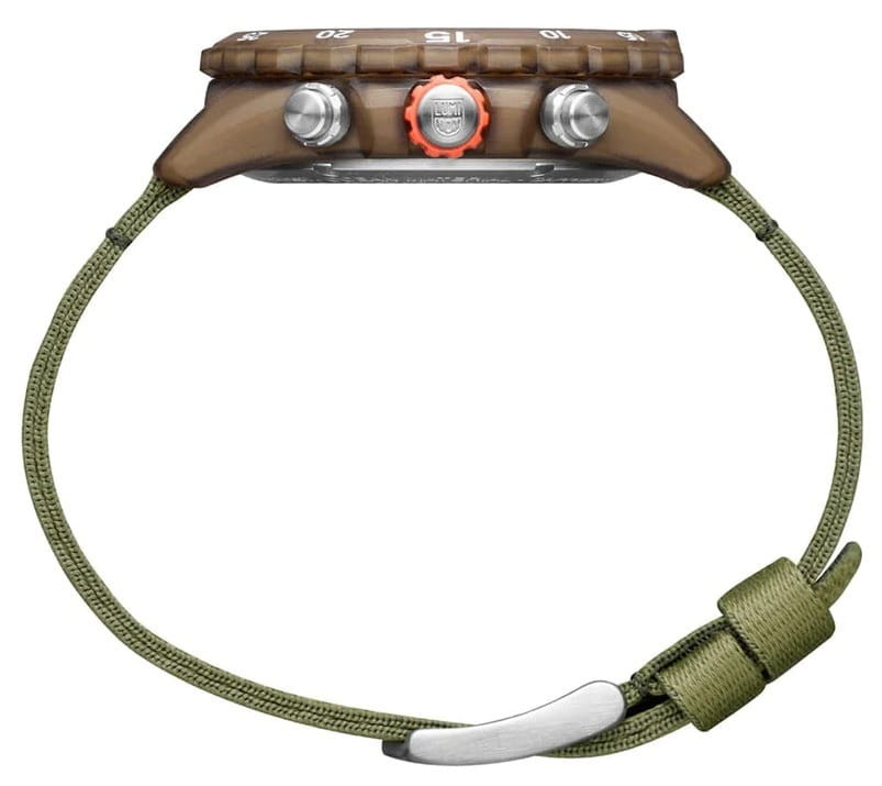 Мужские наручные часы-хронографХронографФункция позволяет измерять отрезки времени с особой точностью: часы, минуты, секунды. Верным признаком хронографа является наличие на циферблате 3 дополнительных окошек-счётчиков. Luminox Bear Grylls Survival ECO Master Series XB.3757.ECO разработаны для любителей активного образа жизни и экстремальных условий. Эти часы созданы в сотрудничестве с Беаром Гриллсом, известным путешественником и специалистом по выживанию в экстремальных условиях. Модель оборудована кварцевым механизмом Ronda 5030.D, предоставляющим надежность и точность показаний. Корпус, выполненный из пластика, усиленного карбоном, обеспечивает легкость и прочность, а черный циферблат защищен сапфировым стекломСапфировое стеклоПрочный и надёжный материал из кристалла сапфира синтетического происхождения, характеризующийся особой твёрдостью и устойчивостью к царапинам и повреждениям. с антибликовым покрытиемАнтибликовое покрытиеСлой оксида металла в 0,13-0,3 микрон, благодаря которому стекло часов не бликует и не отражает свет. Антибликовое покрытие уменьшает отражение света в 10 раз, обеспечивая отличную читаемость показателей циферблата.. Часы обладают функцией хронографаХронографФункция позволяет измерять отрезки времени с особой точностью: часы, минуты, секунды. Верным признаком хронографа является наличие на циферблате 3 дополнительных окошек-счётчиков. с секундомеромСекундомерСекундоме́р — прибор, способный измерять интервалы времени с точностью до долей секунды., позволяющим измерять короткие промежутки времени, а также показывают время в 12-ти и 24-х часовом формате. Счетчик регистрирует секунды, минуты и часы, а центральная секундная стрелка используется как секундная стрелка секундомера. Специальная технология LLTLLTLLT — это автономный механизм подсветки, основанный на использовании микроскопических газонаполненных элементов. Специальные герметичные капсулы из боросиликатного стекла, интегрированные в циферблат, генерируют свечение без необходимости подключения к внешним источникам энергии. Для их работы не требуется ни дополнительный свет, ни механическое воздействие (например, нажатие кнопки). Свечение возникает благодаря химическому процессу: реакция между тритием, заключенным в капсулах, и люминофорным покрытием создает стабильное автономное освещение. Технология обеспечивает энергетическую независимость и долговечность подсветки. обеспечивает непревзойденную ночную видимость на протяжении 25 лет. Водозащита уровня 300WR позволяет использовать часы в условиях высокой влажности и при погружениях. Окошко даты расположено в позиции 6 часов, а вращающийся в одном направлении безельБезельВнешний ободок, закрепляющий стекло. В спортивных часах так называется поворотное кольцо с делениями на циферблате, выполняет роль таймера – замеряет отрезки времени на шкале. Неподвижный безель – элемент декора. Однонаправленно вращающийся безель на дайверских часах позволяет фиксировать моменты погружения и выныривания на поверхность. имеет светящуюся метку на 12 часов. Завинчивающаяся заводная головка с защитой и оранжевым прорезиненным кольцом обеспечивает надежное сцепление, что особенно важно для подводных работ. На завинчивающейся стальной задней крышке выгравированы надпись «Never Give Up» и автограф Беара Гриллса,