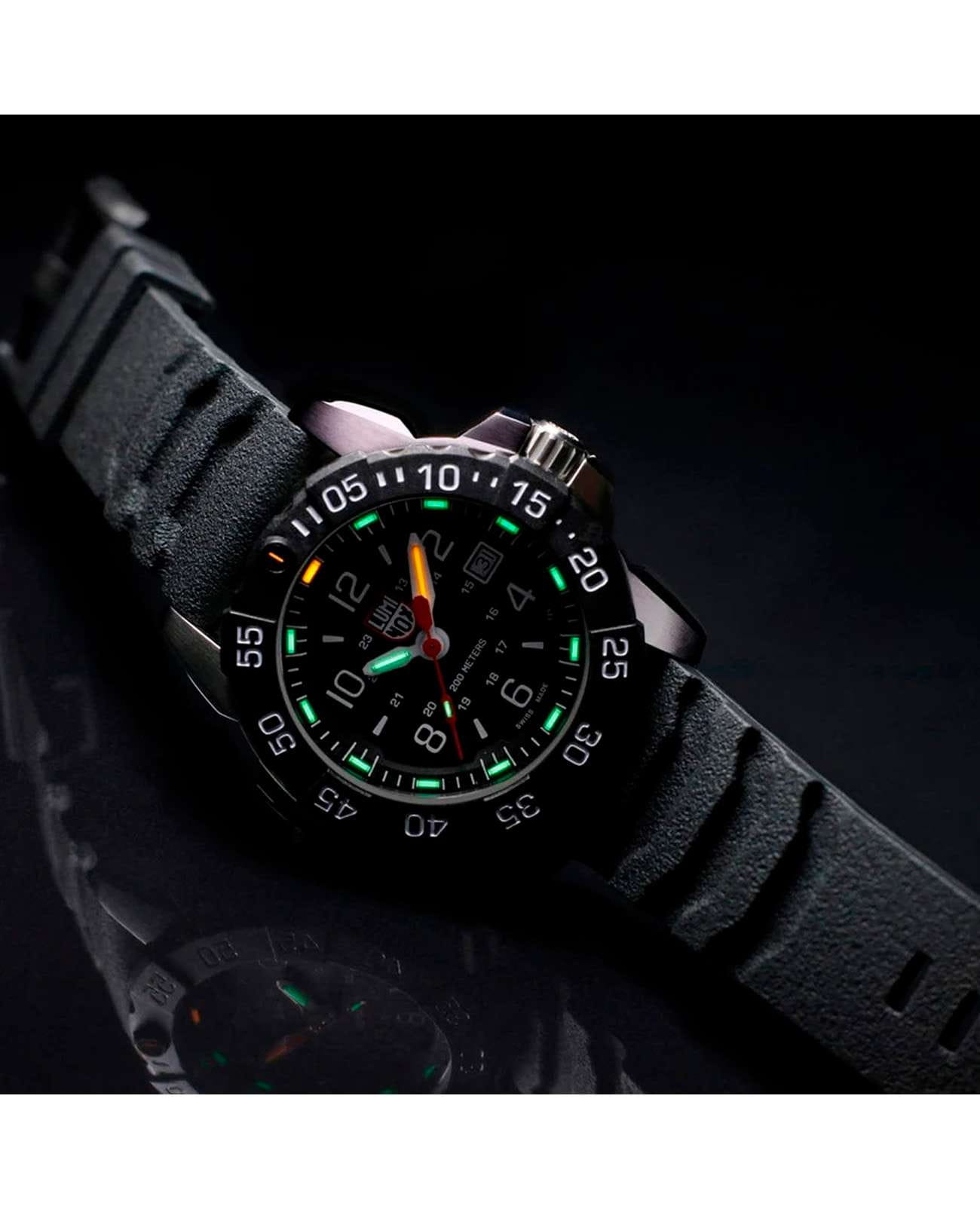 Мужские наручные часы Luminox XS.3251.CB из коллекции Navy SEAL сочетают в себе спортивный дизайн и надежность швейцарского качества . Модель обладает круглым корпусом диаметром 45 мм, изготовленным из стали и карбонаКарбонОт «carbon», «carbone» - углерод, углепластик - полимерный композиционный материал из переплетённых под определенным углом между собой нитей углеродного волокна, применяется для изготовления лёгких, но прочных деталей. В часах часто используют для украшения циферблатов и ремешков. Так же карбон используется в изготовлении корпусов. Такие корпуса обладают антикоррозионным свойством, не поддаются электромагнитному излучению, обладают повышенной прочностью и противоударностью. (CARBONOX™), что обеспечивает высокую устойчивость к внешним воздействиям при сохранении легкости . Циферблат черного цвета украшен контрастными метками и стрелками с , гарантирующим постоянную видимость времени даже в условиях низкой освещенности благодаря системе LLTLLTLLT — это автономный механизм подсветки, основанный на использовании микроскопических газонаполненных элементов. Специальные герметичные капсулы из боросиликатного стекла, интегрированные в циферблат, генерируют свечение без необходимости подключения к внешним источникам энергии. Для их работы не требуется ни дополнительный свет, ни механическое воздействие (например, нажатие кнопки). Свечение возникает благодаря химическому процессу: реакция между тритием, заключенным в капсулах, и люминофорным покрытием создает стабильное автономное освещение. Технология обеспечивает энергетическую независимость и долговечность подсветки. (микрогазовые огни) . Часы оснащены кварцевым механизмом швейцарского производства Ronda 515, обеспечивающим точность хода ±15 секунд в месяц . Защиту циферблата обеспечивает прочное сапфировое стеклоСапфировое стеклоПрочный и надёжный материал из кристалла сапфира синтетического происхождения, характеризующийся особой твёрдостью и устойчивостью к царапинам и повреждениям. с антибликовым покрытиемАнтибликовое покрытиеСлой оксида металла в 0,13-0,3 микрон, благодаря которому стекло часов не бликует и не отражает свет. Антибликовое покрытие уменьшает отражение света в 10 раз, обеспечивая отличную читаемость показателей циферблата., устойчивое к царапинам и механическим повреждениям . Водонепроницаемость модели достигает 20 атмосфер (200 метров), что делает их подходящими для плавания и активного отдыха на воде, включая дайвинг. Модель также оснащена безелемБезельВнешний ободок, закрепляющий стекло. В спортивных часах так называется поворотное кольцо с делениями на циферблате, выполняет роль таймера – замеряет отрезки времени на шкале. Неподвижный безель – элемент декора. Однонаправленно вращающийся безель на дайверских часах позволяет фиксировать моменты погружения и выныривания на поверхность. с односторонним вращением, что добавляет функциональности при использовании в водных условиях . Ремешок выполнен из черного каучука, что обеспечивает комфортное ношение в течение дня и удобство в уходе . Дополнительно часы имеют окно даты в положении «3 часа», что делает их практичными для повседневного использования .