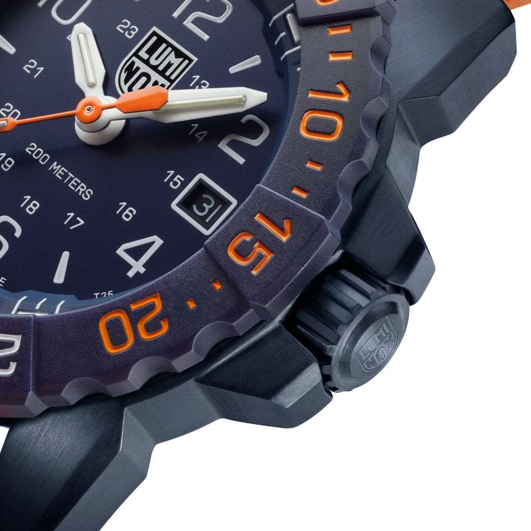 Luminox SEAL Foundation XS.3253.CBNSF.SET — это высококачественные швейцарские часы, созданные для тех, кто ценит надежность и стиль в повседневной жизни. Эти спортивные часы оборудованы кварцевым механизмом, который обеспечивает точность и стабильность работы. Их корпус выполнен из прочной стали 316L с PVD-покрытиемPVDУльтратонкое покрытие наносится в технике вакуумного напыления, сочетает в себе нитрид титана особой прочности со слоем золота или оксида хрома. Несёт в себе декоративную или защитную функцию., что придаёт часам современный и технологичный вид. Черный циферблат, на котором нанесены метки в виде штрихов и арабских цифр, защищен сапфировым стекломСапфировое стеклоПрочный и надёжный материал из кристалла сапфира синтетического происхождения, характеризующийся особой твёрдостью и устойчивостью к царапинам и повреждениям. с антибликовым покрытиемАнтибликовое покрытиеСлой оксида металла в 0,13-0,3 микрон, благодаря которому стекло часов не бликует и не отражает свет. Антибликовое покрытие уменьшает отражение света в 10 раз, обеспечивая отличную читаемость показателей циферблата., что позволяет без труда считывать время даже при ярком солнечном свете. Технология LLTLLTLLT — это автономный механизм подсветки, основанный на использовании микроскопических газонаполненных элементов. Специальные герметичные капсулы из боросиликатного стекла, интегрированные в циферблат, генерируют свечение без необходимости подключения к внешним источникам энергии. Для их работы не требуется ни дополнительный свет, ни механическое воздействие (например, нажатие кнопки). Свечение возникает благодаря химическому процессу: реакция между тритием, заключенным в капсулах, и люминофорным покрытием создает стабильное автономное освещение. Технология обеспечивает энергетическую независимость и долговечность подсветки.-подсветки обеспечивает отличную видимость в темноте, сохраняя свою эффективность на протяжении 25 лет. Окошко даты удобно расположено в позиции 3 часов. Часы оснащены вращающимся в одном направлении безелемБезельВнешний ободок, закрепляющий стекло. В спортивных часах так называется поворотное кольцо с делениями на циферблате, выполняет роль таймера – замеряет отрезки времени на шкале. Неподвижный безель – элемент декора. Однонаправленно вращающийся безель на дайверских часах позволяет фиксировать моменты погружения и выныривания на поверхность. со светящейся меткой на 12 часов, что добавляет функциональности и удобства. Завинчивающаяся заводная головка с защитой и завинчивающаяся задняя крышка с гравировкой обеспечивают дополнительную герметичность и стильный внешний вид. Резиновый оранжевый ремешок с классической застежкой обеспечивает комфортное ношение и надежность фиксации на запястье, также в комплекте идет дополнительный синий резиновый ремешок. Эти часы обладают водозащитой до 200 метров, что делает их отличным выбором для активного отдыха и водных видов спорта.