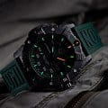 Luminox XS.3877 — это эксклюзивные швейцарские часы, которые представляют собой идеальное сочетание надежности и функциональности. Эти часы оснащены механизмом с автоподзаводом на базе калибра Sellita SW 220-1, содержащим 24 камня, что обеспечивает их точность и долговечность. Корпус изготовлен из прочного материала CARBONOX, который усилен прессованным карбоном, что придаёт часам легкость и устойчивость к внешним воздействиям. Черный циферблат украшен метками в виде штрихов и защищен сапфировым стекломСапфировое стеклоПрочный и надёжный материал из кристалла сапфира синтетического происхождения, характеризующийся особой твёрдостью и устойчивостью к царапинам и повреждениям. с антибликовым покрытиемАнтибликовое покрытиеСлой оксида металла в 0,13-0,3 микрон, благодаря которому стекло часов не бликует и не отражает свет. Антибликовое покрытие уменьшает отражение света в 10 раз, обеспечивая отличную читаемость показателей циферблата., что гарантирует отличную читаемость в любых условиях. Особая технология LLTLLTLLT — это автономный механизм подсветки, основанный на использовании микроскопических газонаполненных элементов. Специальные герметичные капсулы из боросиликатного стекла, интегрированные в циферблат, генерируют свечение без необходимости подключения к внешним источникам энергии. Для их работы не требуется ни дополнительный свет, ни механическое воздействие (например, нажатие кнопки). Свечение возникает благодаря химическому процессу: реакция между тритием, заключенным в капсулах, и люминофорным покрытием создает стабильное автономное освещение. Технология обеспечивает энергетическую независимость и долговечность подсветки.-подсветки позволяет без труда определять время в условиях полной темноты и будет сохранять свою функциональность на протяжении 25 лет. На циферблате расположены окошки даты и дня недели в положении 3 часа, что добавляет удобства в использовании. БезельБезельВнешний ободок, закрепляющий стекло. В спортивных часах так называется поворотное кольцо с делениями на циферблате, выполняет роль таймера – замеряет отрезки времени на шкале. Неподвижный безель – элемент декора. Однонаправленно вращающийся безель на дайверских часах позволяет фиксировать моменты погружения и выныривания на поверхность. часов вращается в одном направлении и оснащен светящейся меткой на 12 часов для дополнительной функциональности. Завинчивающаяся заводная головка с защитой и двойной уплотнительной прокладкой обеспечивает надежную герметичность, а задняя крышка из стали 316L, выполненная с прозрачным дизайном, позволяет увидеть внутренний механизм часов. Часы обладают впечатляющей водозащитой до 200 метров, что делает их отличным выбором для водных приключений. Каучуковый зеленый ремешок с раскладной застёжкойРаскладная застёжкаТакой тип застёжки используется только на браслетах из металла. Она никогда не раскрывается полностью, происходит разделение на 2 и более частей. Раскладывающая застёжка снизит вероятность потери часов к минимуму. и системой блокировки обеспечивает комфортное ношение и надежность. Также предусмотрена система быстрой замены ремешка, что позволяет легко адаптировать часы под ваш стиль.