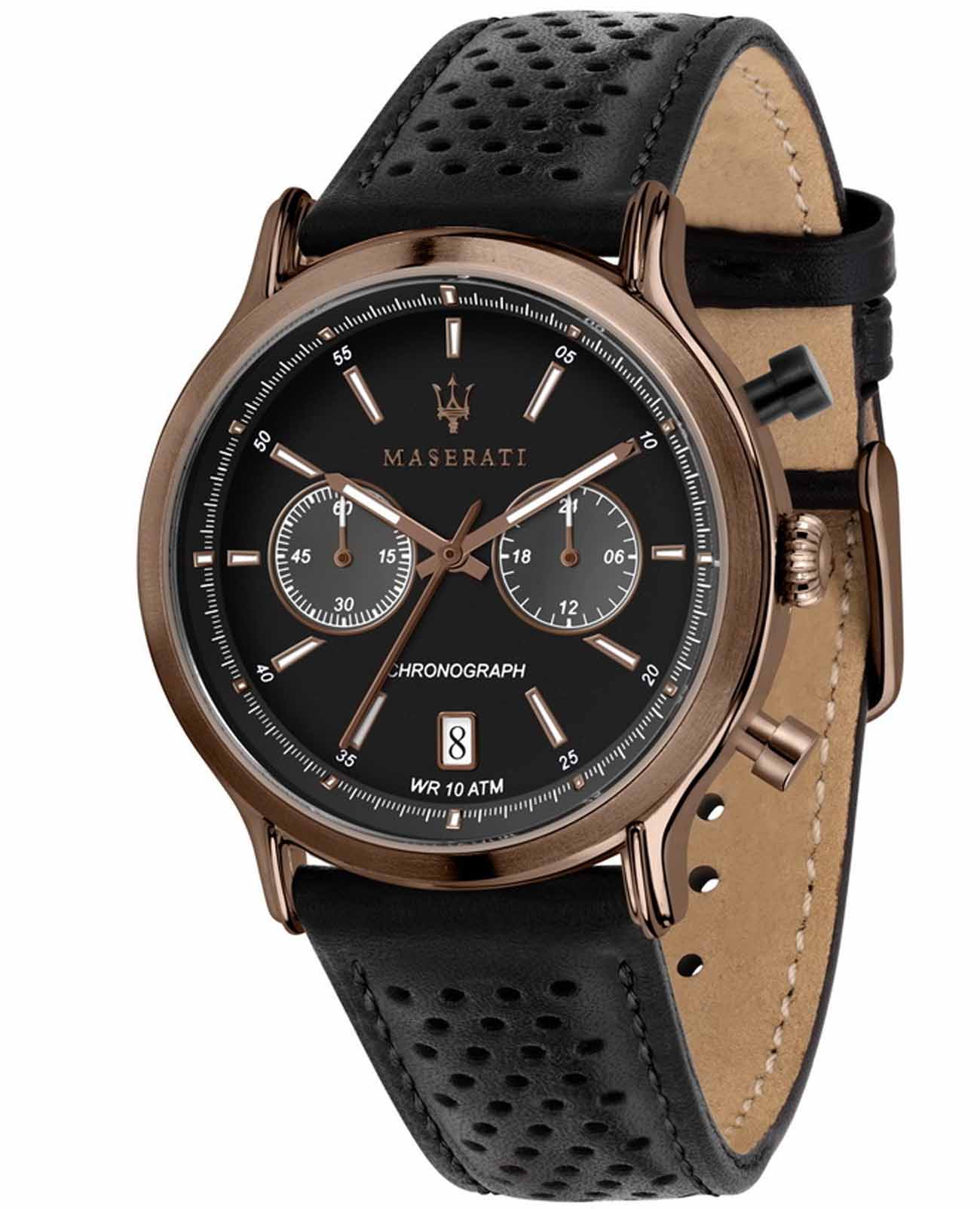 Мужские итальянские часы-хронографХронографФункция позволяет измерять отрезки времени с особой точностью: часы, минуты, секунды. Верным признаком хронографа является наличие на циферблате 3 дополнительных окошек-счётчиков. Maserati Legend R8871638001, кварцевый механизм с высокой точностью. Корпус часов изготовлен из стали с PVD-покрытиемPVDУльтратонкое покрытие наносится в технике вакуумного напыления, сочетает в себе нитрид титана особой прочности со слоем золота или оксида хрома. Несёт в себе декоративную или защитную функцию.. Стрелки с люминесцентным покрытиемЛюминесцентное покрытиеПозволяет считывать показания времени в темноте. Производители наносят на стрелки, часовые индексы, безель или поверхность циферблата светонакопительный состав, дающий холодное свечение.. Класс водозащиты: 100 метров, позволит плавать, нырять и заниматься другими водными видами спорта. Кожаный ремешок на стандартной застежке.